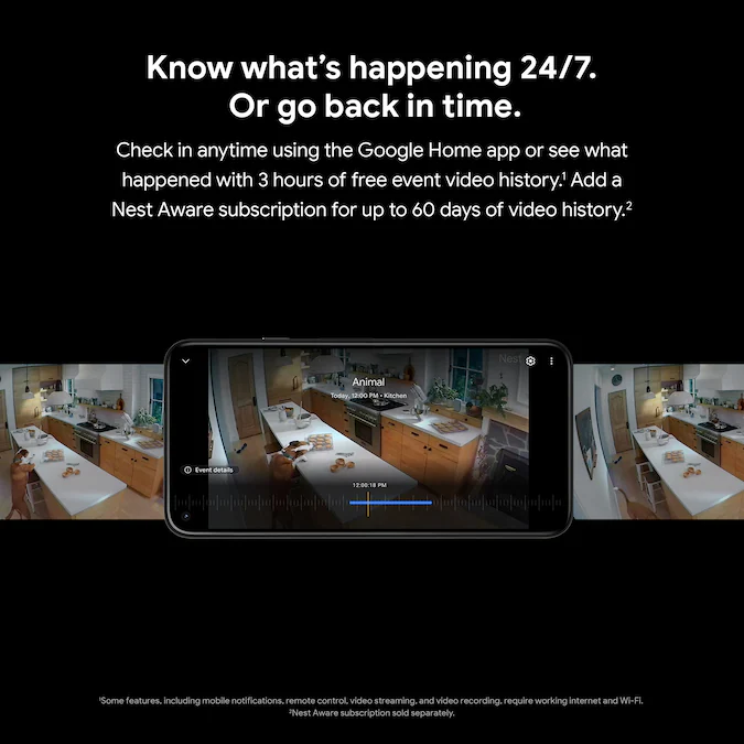 - Know what’s happening 24/7-Or go back in time.-Check in anytime or see what happened with 3 hours of free event video history-Add a Nest Aware subscription for up to 60 days of video history