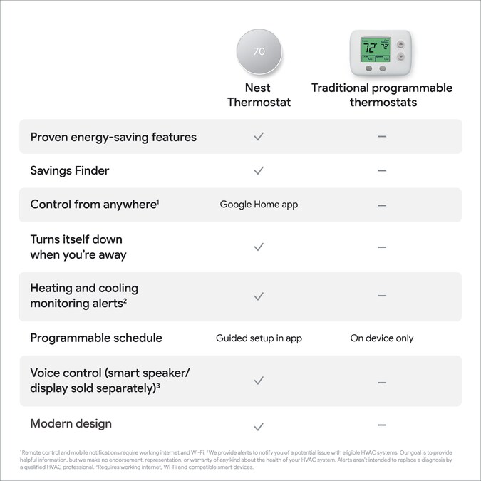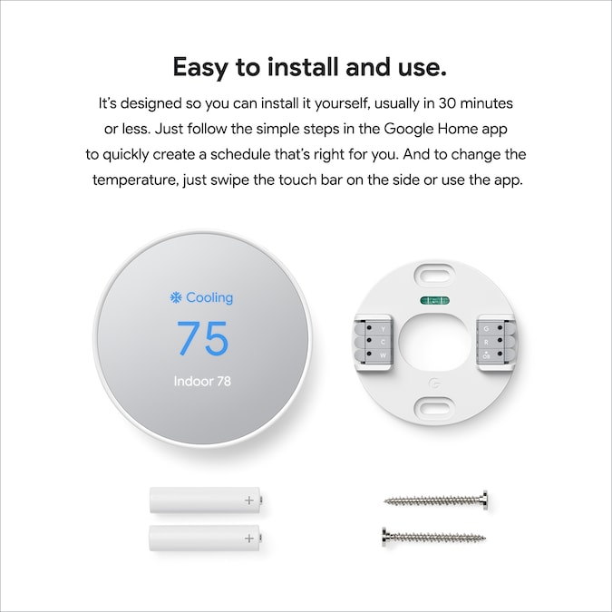Meet the Nest thermostat, the helpful thermostat with a cozy price. It can turn itself down to save energy when you leave the house. You can control it from anywhere with the Google home app – whether you’re on an errand or on vacation. You can even change the temperature without getting off the couch or out of bed. Just say, “hey Google, turn up the heat.”[1] The Nest thermostat looks out for your heating or cooling system. If something does’t seem right, it can send an alert. And it’s easy to install yourself, usually in 30 minutes or less. [1]Voice control with Google Assistant requires a compatible smart device.