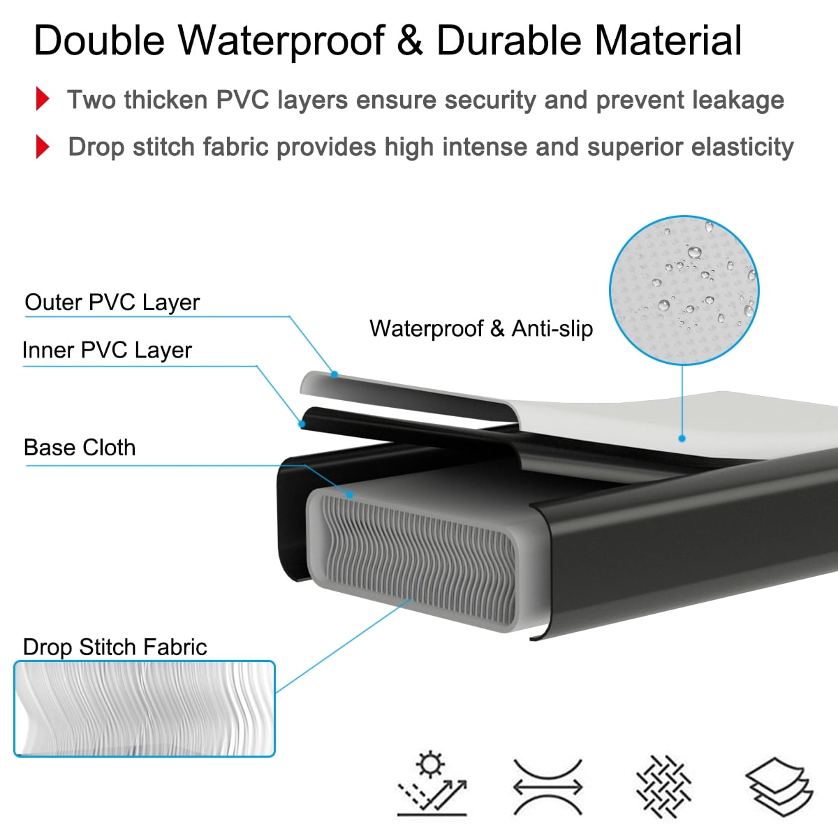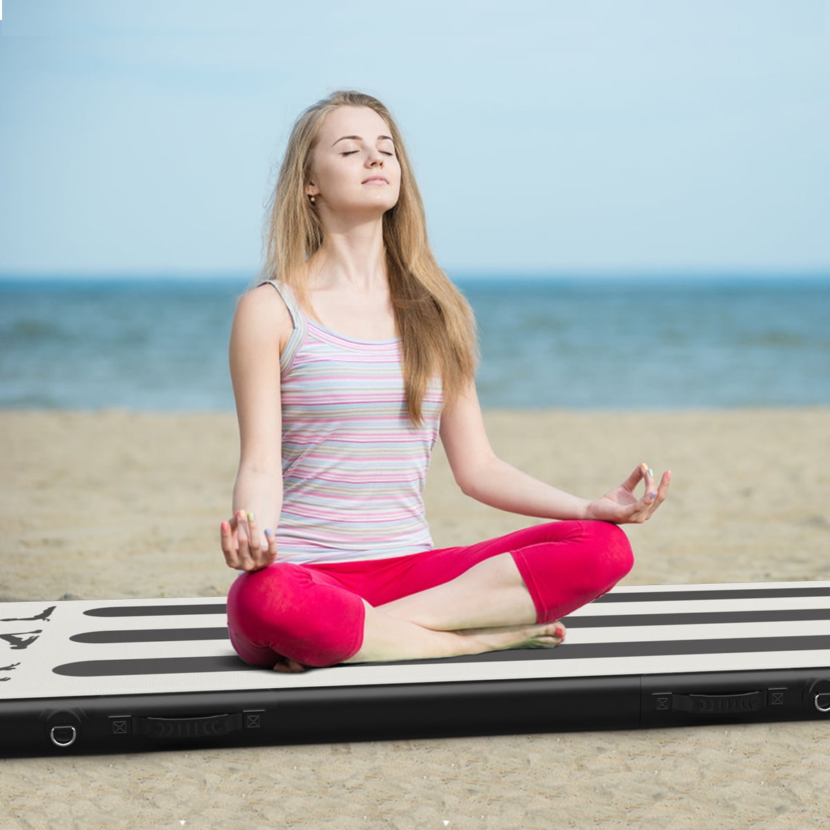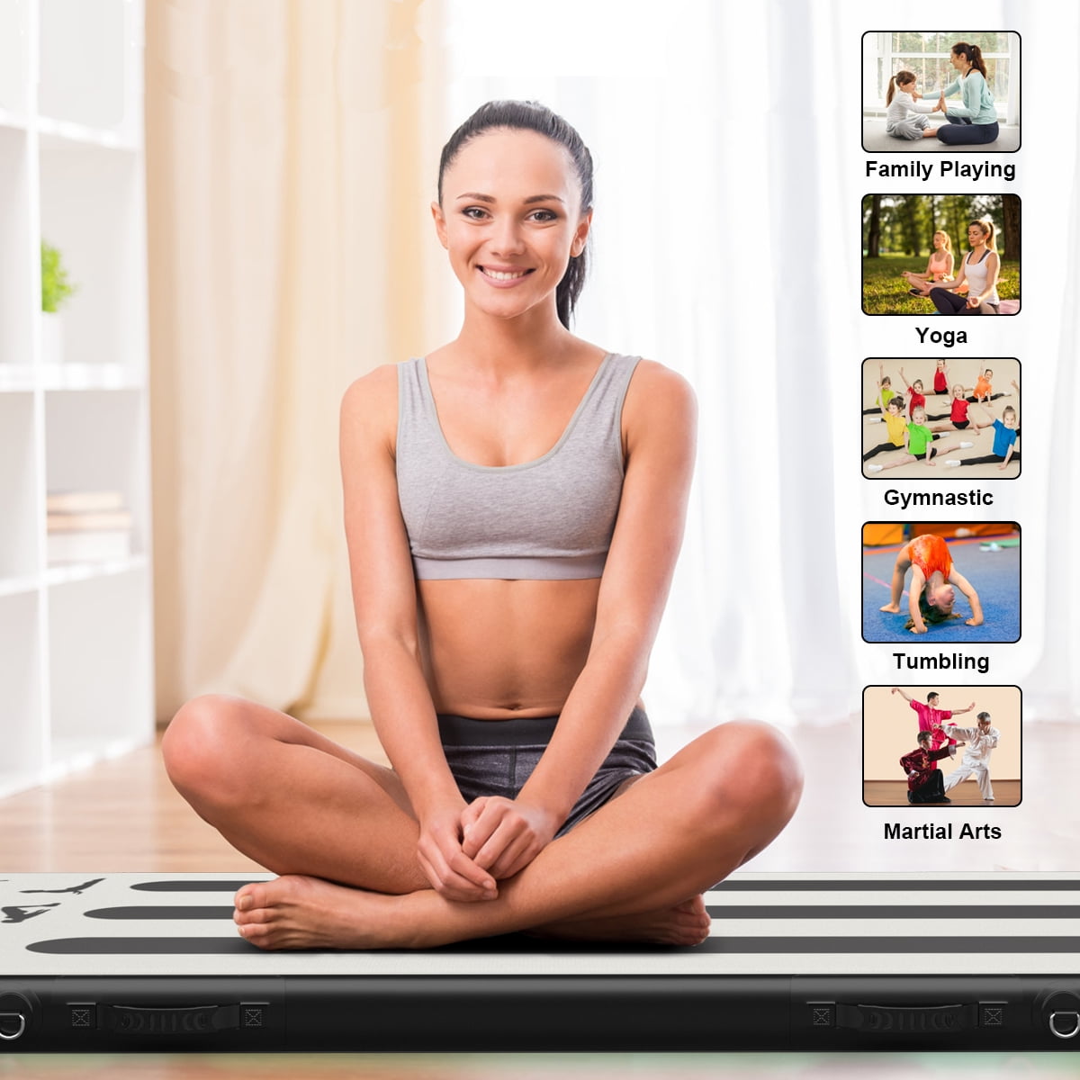 Premium & Selective PVC Material: This gymnastic mat is made from PVC material, featuring with two thicken PVC layers of 0.7mm. The outer PVC layer has an anti-slip and waterproof surface to guarantee great safety during training. Drop stitch fabric between two PVC layers is sturdy enough without being torn easily. Hook and Loop Fasteners & D-rings for More Mats: Hook and loop fasteners on the head of the mat can allow you connecting several mats together to create a larger activity space. Different from other common mats, our Tumbling mat features D-rings, making it possible to connect other mats to both sides. Wide Application: This inflatable gymnastic mat can be placed on the floor of your home or gym in high performance training, such as tumbling practice, martial arts, gymnastics and yoga. Moreover, you can enjoy exercise on the beach, background, grassland or even on the water. Easy to Carry and Store: The mat can be deflated and rolled into a compact and cylinder shape easily. Compared with traditional foam-based mat, it occupies less space. Storage would be simple. With a carrying bag, it is also quite economic and convenient for transportation. Practical Accessories: An electric air pump is of course included in the package. With a power of 500W and max 2PSI pressure, this pump works efficiently to save your energy and is easy to inflate the mat within minutes. Repairing kit is provided for more convenience.