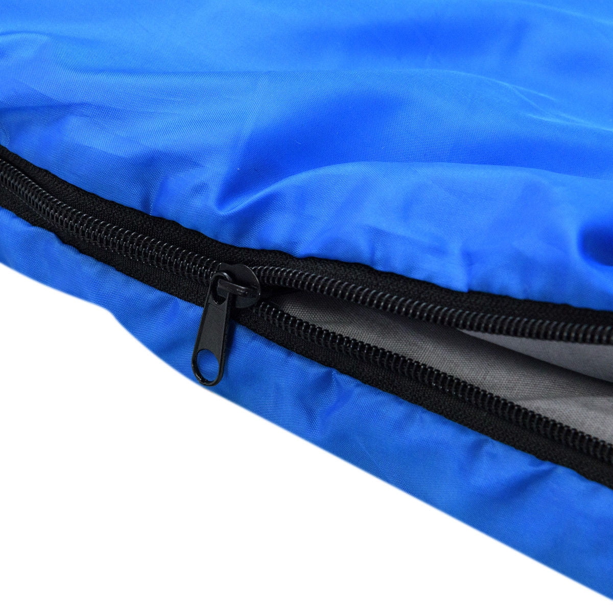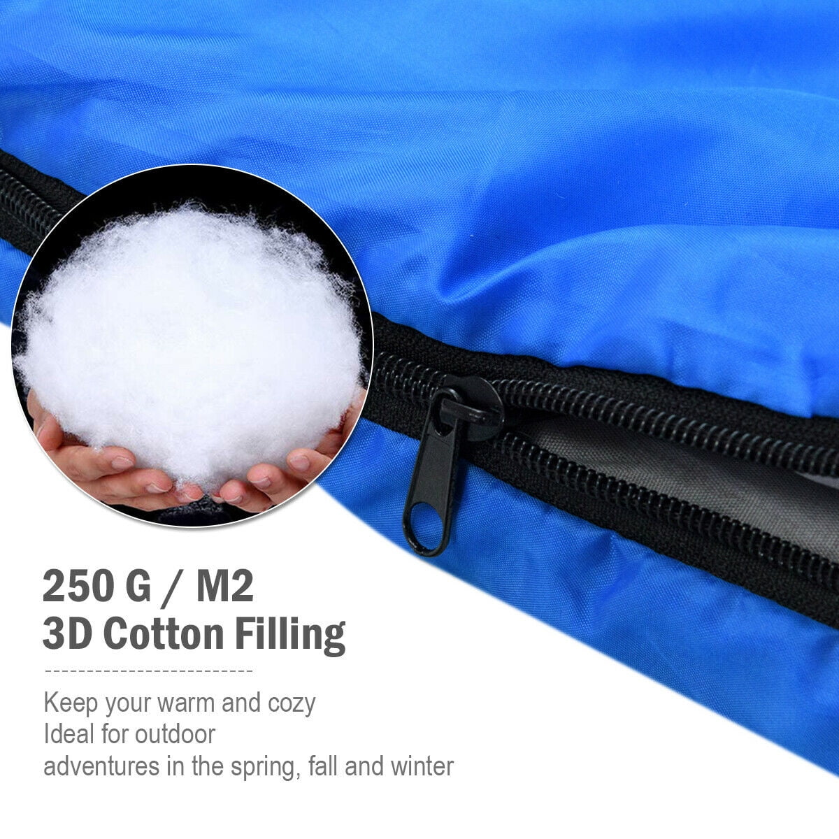 Our double sleeping bag is designed to guarantee good sleep after a full day of outdoor activities. It features sturdy, comfortable and lightweight and large, perfect for couples and families who enjoy camping and love the outdoors. Get a great sleep while enjoying nature in our soft and warm sleeping bag. Our sleeping bag with a tough, waterproof outer shell and a soft interior lining that has a 190 thread count for a comfortable feel. Moreover, it can be separated into two separate bags for individual use. This sturdy and lightweight sleeping bag is a must have for anyone who loves enjoying the great outdoors but still enjoys the comfort of a good night’s sleep Feature Used as a two person sleeping bag Separated into two separate bags for individual use Zippers on both sides for easy entry and exits. Specially designed extra interior pockets for storage Crafted with high quality water-resistant 190T polyester, lined with T/R fabric and filled with luxurious cotton Designed for near-freezing temperatures, it can keep you warm and cozy even when it’s 32- 59 degree F Waterproof, weather-resistant design and prevent you from any dampness Comes with two small T/R fabric pillows Perfect for hiking, camping, traveling and more! Included a travel-friendly carrying bag with extra holding straps which makes it quite convenient to store and carry Specification Color: Blue Material: polyester +cotton Unfold dimension: 87” x 59” x 4” Folding dimension: 17” x 12” x 12” Pillow Size: 16” x 9” Product Weight: 6lbs Package Includes: 1 x Double Sleeping Bag 1 x Carrying Bag 2 x Pillows