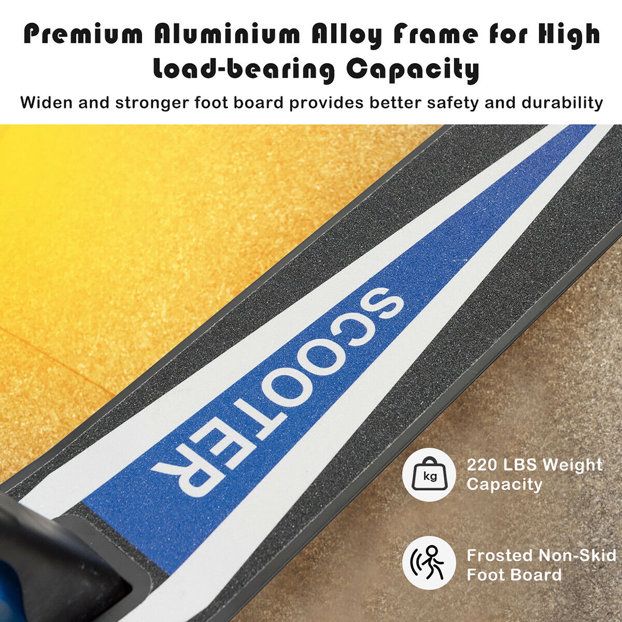 Are you still struggling with what kind of gift to choose for your child? I highly recommend our scooter to you! Our sport scooter is made of premium aluminum alloy and its structure is designed according to scientific principle, which make it very sturdy and stable. Besides, it has 3 adjustable height and can be adjustable according to your height. The collapsible design eliminates the need for complex installation steps. And it equipped with strap so that it can be carried easily. Kickstand can make scooter stand firmly on the ground. In addition, the flash wheel looks cool when it is running and it can be used in the night. What’s more, super wide and non-slip splint can ensure smooth sliding and keep you safe. Come on, let your kids enjoy the comfort of exercise. Feature 3 adjustable height make it suitable for children of different ages and heights Folding design and strap make it easy for you to carry Collapsible design eliminates the need for complex installation steps Kickstand can make it stand firmly on the ground Good load-bearing capacity, the maximum load is 220lbs High quality aluminum plate effectively reduces vibration Flash wheel makes it look cool and can quickly attract children’s attention Specification Color: As is shown in the picture Material: Aluminum Alloy Overall Dimension: 13.5”L x 34.5”W Adjustable Height: 34” /36” /38” Product Weight: 8.5lbs Weight Limit: 220lbs Suitable Age: Over 10 years old Deck Dimension: 21”L x 4.7”W Wheel Size: 8” Handlebar Size: 5” Package includes: 1 x Scooter 1 x Instruction