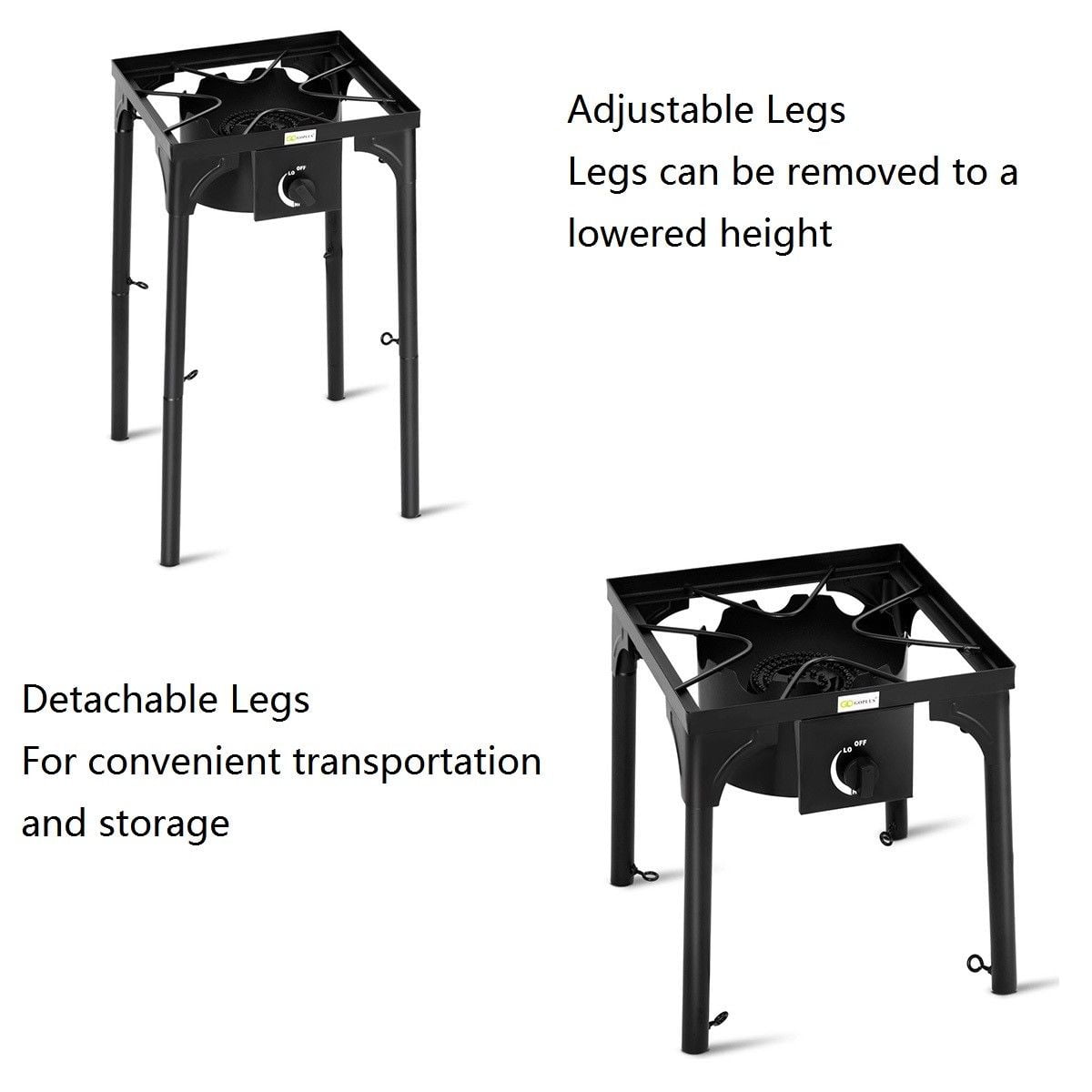 Our powerful single burner, equipped with a cast iron head, outputs a whopping BTU of 100000. It is suitable for various types of pot because of burner bracket. If you go camping just carry it. Then you will enjoy the happy time with your family. Do not hesitate, just buy it Note:GAS TANK AND COMAL ARE NOT INCLUDED Feature Sturdy Design:This item made by cast iron, which is sturdy enough. Besides, the powder coating makes it is waterproof and anti-rust. This sturdy design allows for immediate use without the headache of a complex set-up Cast-Iron Head:This powerful single burner, equipped with a cast iron head, outputs a whopping BTU of 100000. And it can adjust the firepower to make your cook more delicious Cooking Ability:It is suitable for various types of pot because of burner bracket. So you can enjoy cooking outdoor with your family to have a happy time Detachable Legs:This item has detachable legs that can make it smaller for convenient transportation and storage Specification Product Type:Single burner Material:Cast iron Item Dimensions:15.5”x15.5”x17” Item Weight:13lb Hose Dimensions:0.5”x51” Max:250 Psig BTU :100000 Package includes: 1 x Single burner stove 1 x Instruction