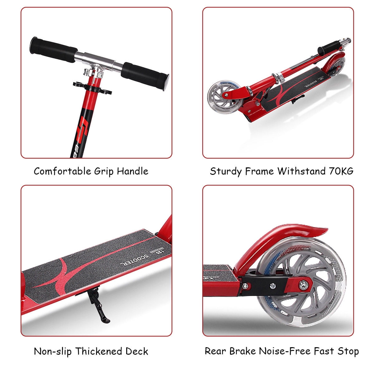 This kick scooter is built of aircraft-grade aluminum, a sturdy material that holds up to use and abuse through the years. Scooter with PU Wheels are both smooth and quiet and high quality bearings reduce vibration and make a smoother ride. Rear wheel with LED Light let the children enjoy playing well. Add in the foldable T-tube and deck, which tuck together to create a compact footprint (ideal for carrying when riding isn’t appropriate), and you have a great kick scooter for virtually any situation. Three levels adjustable height to meet children at different ages. Do not hesitate to buy it! Feature Super-strong aircraft-grade aluminum t-tube and deck Adjustable height handlebars from 30”-34” Features rear fender brake for quick stops Easy to fold and carry with its folding system For riders ages from 4-13 Perfect to develop kids’critical balance and coordination Specification Color:Red Material:aluminum frame + PU wheels Product Dimension:As picture shown Weight Capacity:154lbs Product Weight:6lbs