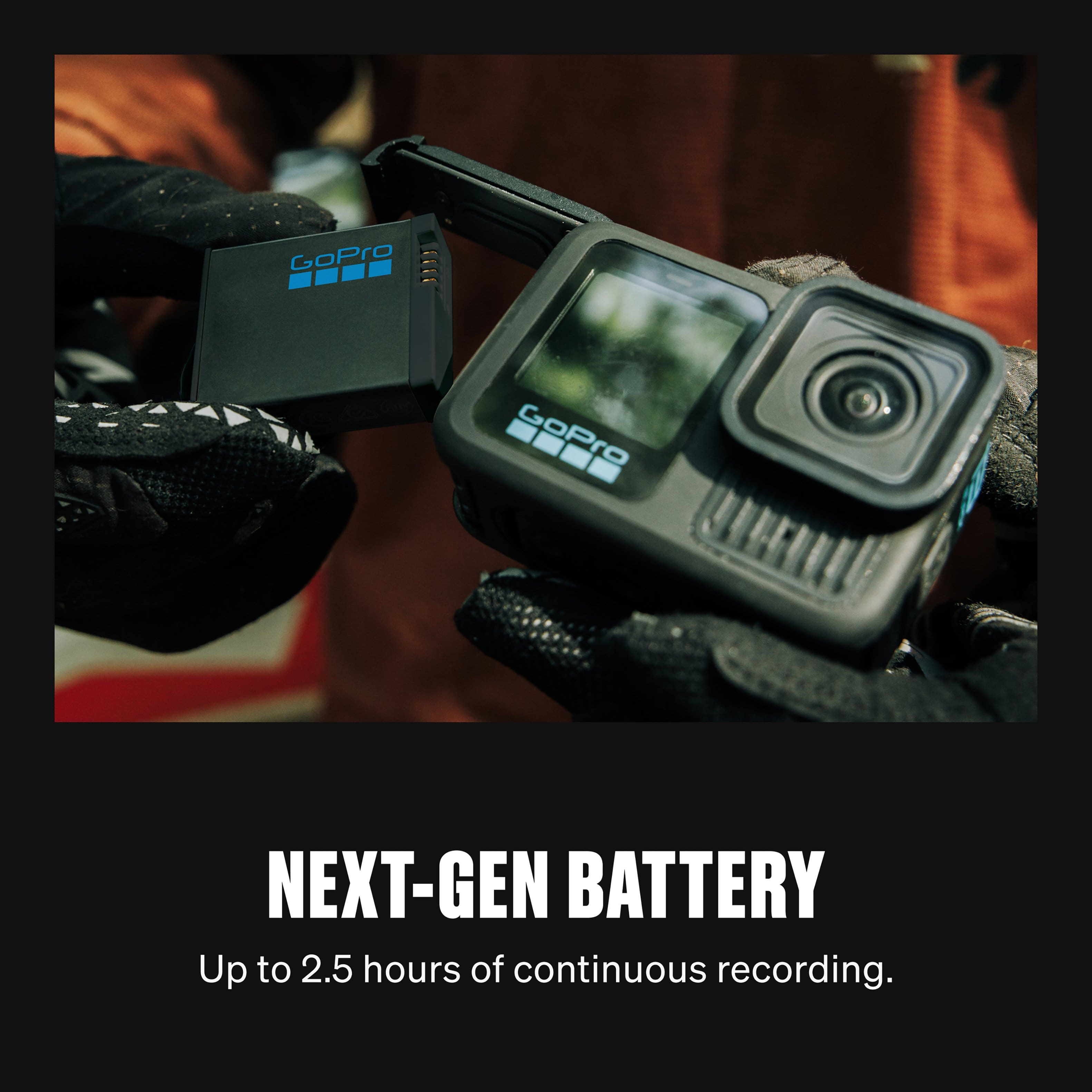 Spend more time recording and less time charging. A higher-capacity 1900mAh Enduro battery gives you longer runtimes in all conditions, from hot to freezing and everything in between. You’ll get 1.5 hours of continuous recording at 4K30 or 5.3K30, plus over 2.5 hours of continuous recording at 1080p30.