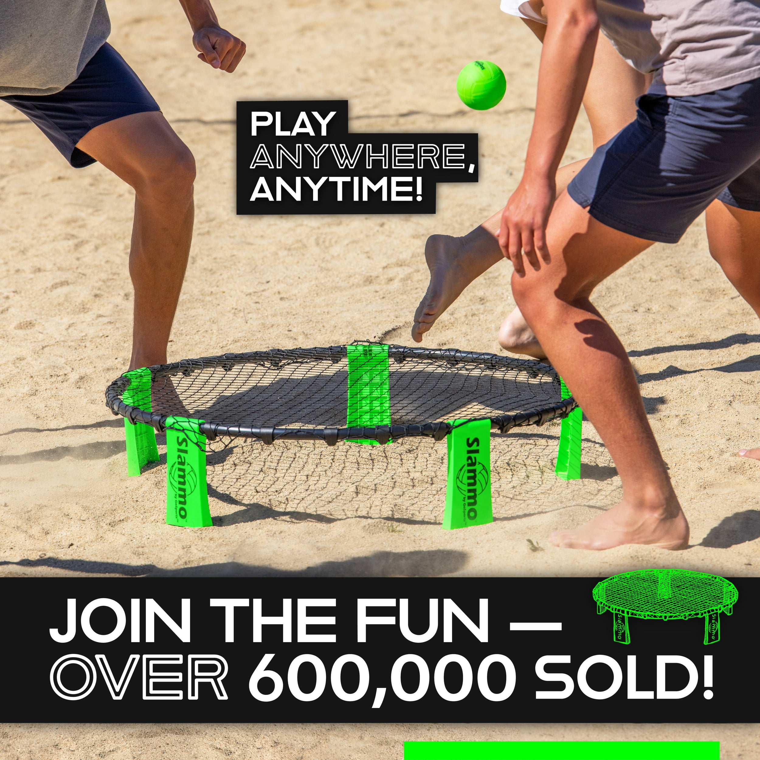 WHAT IS SLAMMO: Slammo is an action-packed 2-on-2 volleyball style game where teams have 3 hits to return or spike the ball to the circular net; Fun for the whole family at the beach, BBQs, camping, and in the backyard COMPLETE SET: Includes 1 Slammo roundnet target, 1 large 12 cm training ball to learn the game, 2 smaller 9 cm competition balls, travel carrying case and game rules EASY TO LEARN FOR KIDS & ADULTS: Slammo is the must-have outdoor lawn and beach game for the summer that will engage players of all ages; Retail packaged, makes a great gift WHY CHOOSE SLAMMO: Premium construction at a great value without the inflated price tag; Features high tension netting for optimized bounce, track hook technology for 100% net coverage, and all-surface legs to play anywhere; Designed in the US EASY ASSEMBLY: Imagine the action-packed play style of volleyball but without the hassle of setting up; Quickly jump straight into the game where everyone will be spiking like a pro in no time