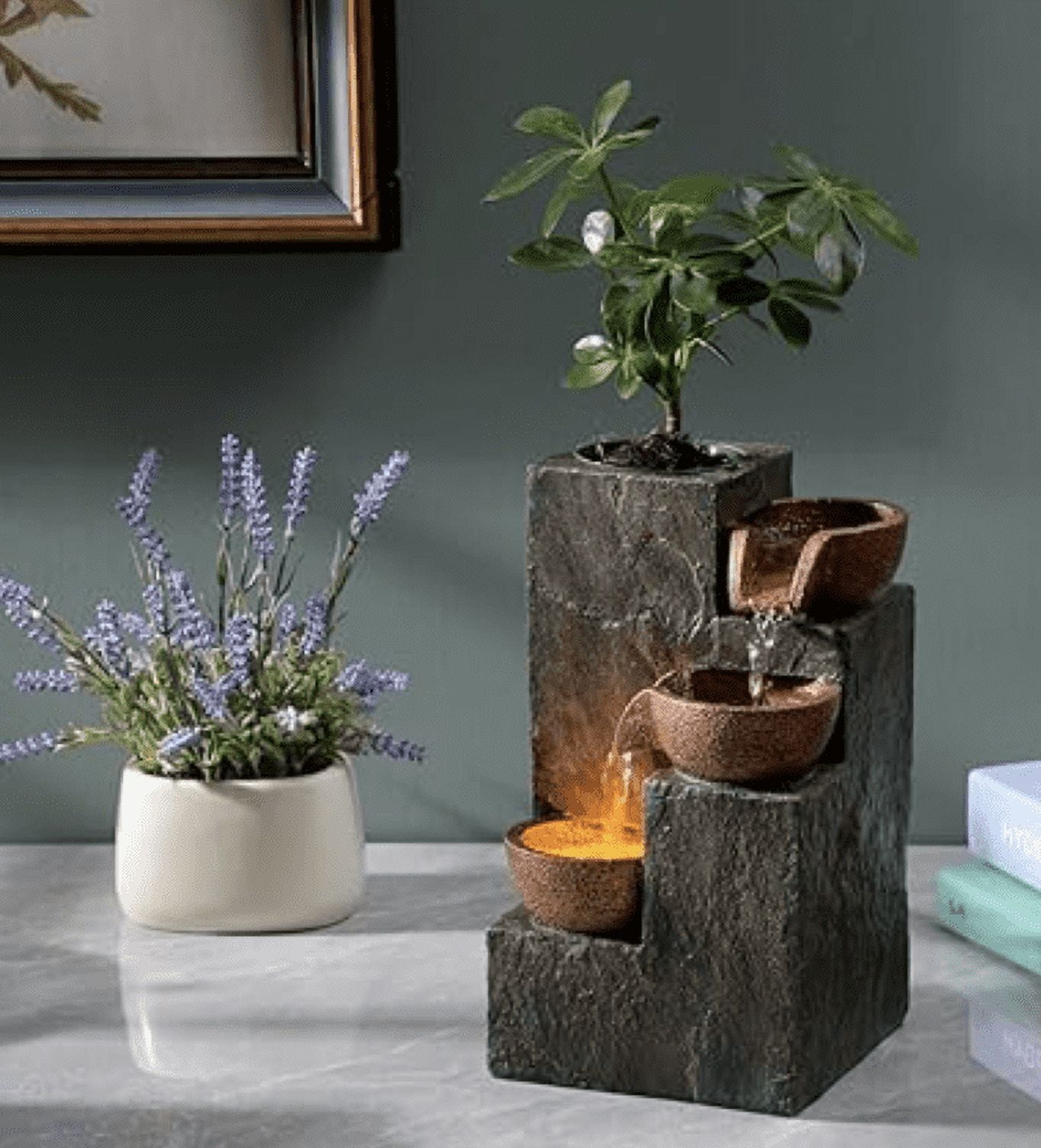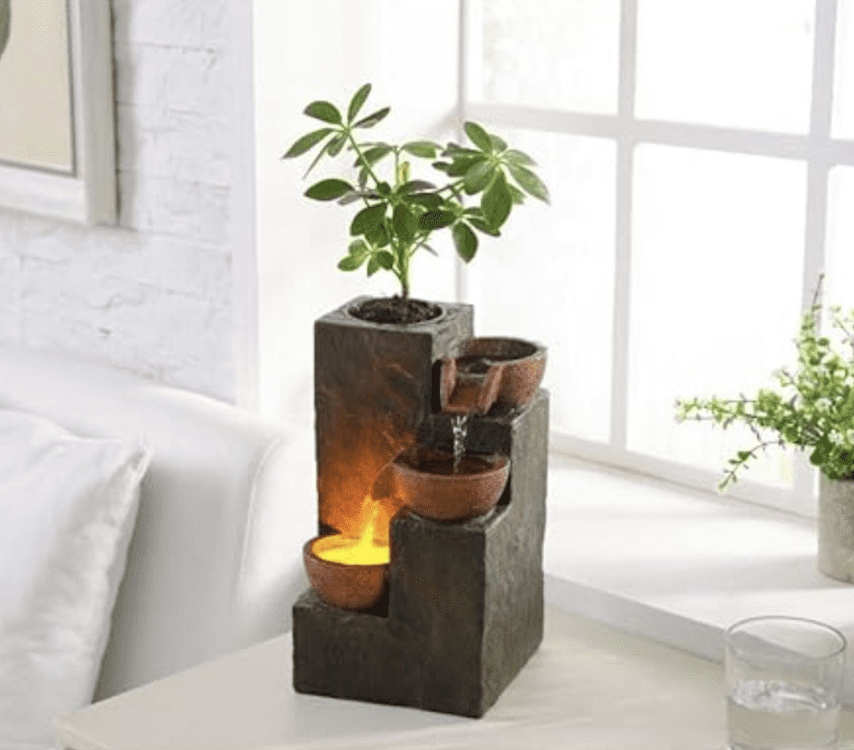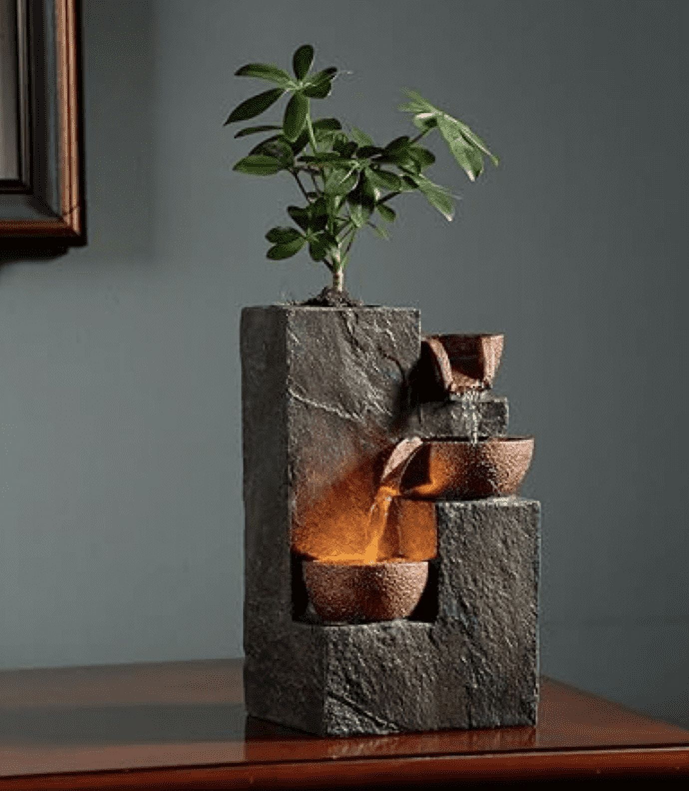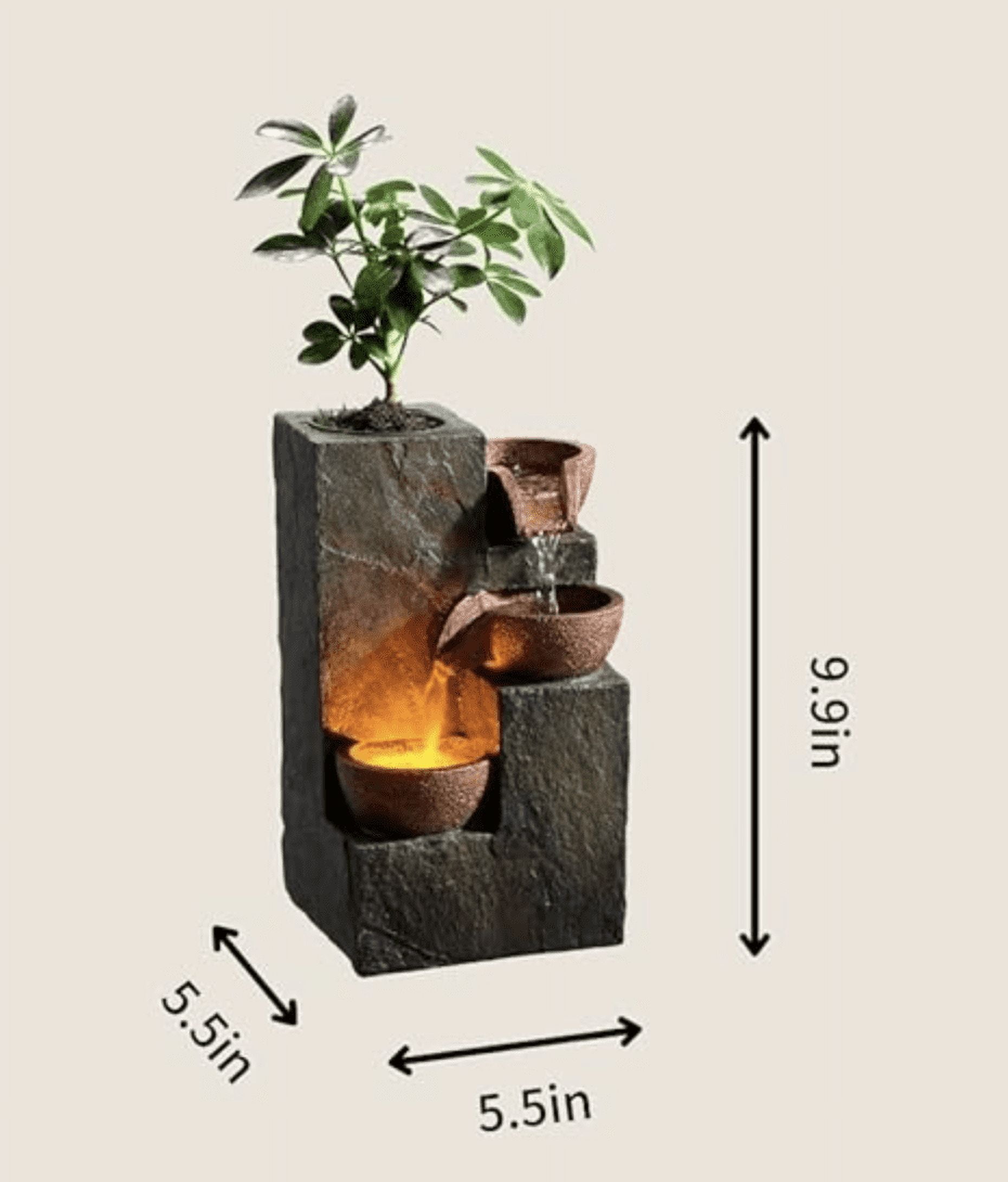 Relaxing Ambiance: Enhance your indoor space with this Three Bowls Rock Fountain, creating a calm and soothing atmosphere with the sound of trickling water. Warm LED Light: The built-in warm LED light adds warmth and coziness to your space, making it perfect for meditation, yoga, or simply unwinding after a long day. Space-saving Design: This tabletop fountain is compact and lightweight, allowing you to place it on any table, shelf, or desk, making it an ideal decoration for your home or office. DIY Planting: The Three Bowls Rock is equipped with an empty basin pierced by cotton thread, which can absorb the water at the bottom of the fountain to keep the soil moist, giving you the freedom to customize it with your favorite plants or succulents, adding a touch of greenery to your environment. Easy to Use: Simply fill the fountain with water, plug it in, and enjoy the calming water flow and gentle LED light, providing you with a hassle-free setup and operation experience.