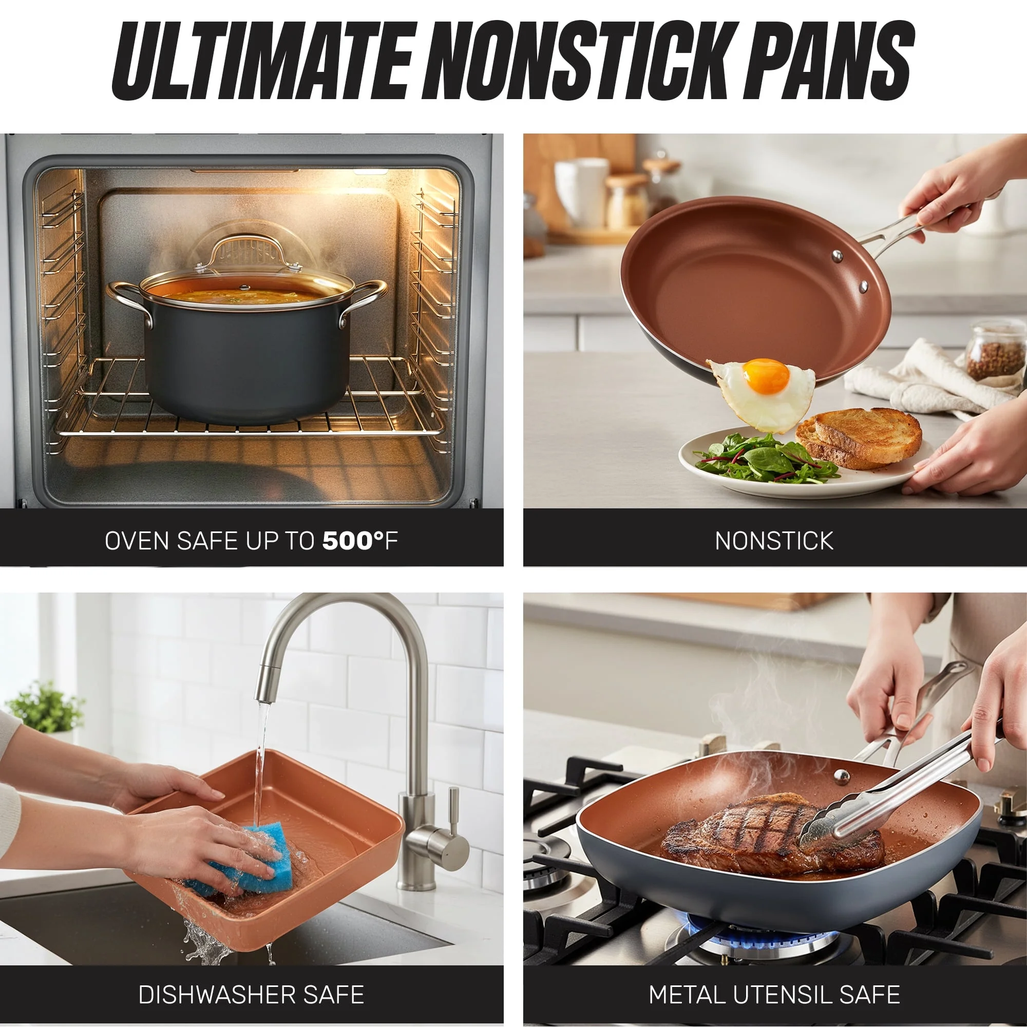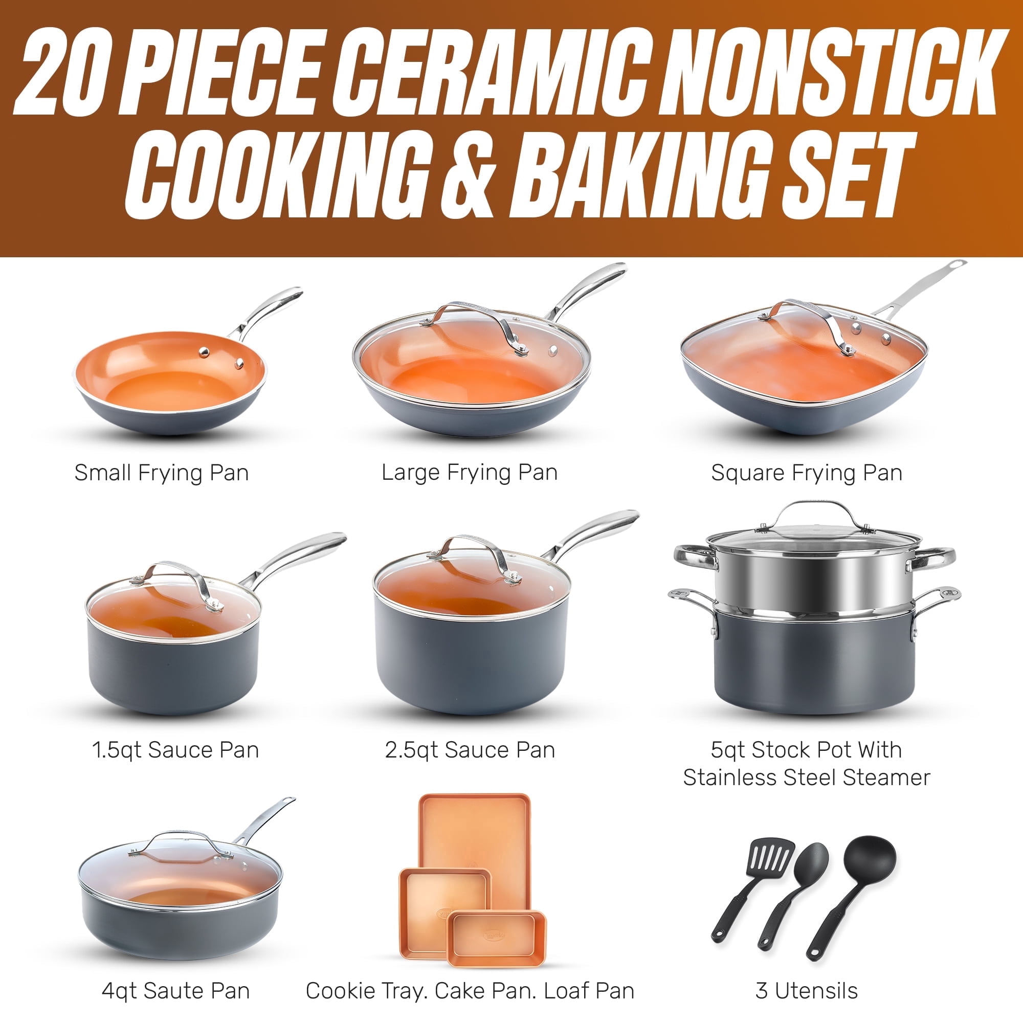 SUPERIOR CERAMIC NONSTICK SURFACE: No more sticking! Our advanced ceramic coating delivers unbeatable nonstick performance, letting food slide right off the pan without oil or butter. Effortless cooking, even easier cleanup! COMPLETE KITCHEN COOKWARE SET: Includes 20 essential pieces to fully equip your kitchen for cooking, baking, and serving – all in one complete, nonstick set. THE LAST COOKWARE SET YOU’LL EVER NEED: Built with a durable ceramic coating and reinforced construction, this set resists warping, scratching, and wear, even with metal utensils. This set is also oven-safe up to 500°F, compatible with all ovens for long lasting, versatile performance. COOK HEALTHIER EVERY DAY: The nonstick ceramic coating is free of harmful toxins and forever chemicals, giving you a safer, cleaner way to cook every meal. CLEANUP MADE EFFORTLESS: Spend less time scrubbing and more time enjoying your meals as every piece in this set is 100% dishwasher safe for fast, hassle free cleanup. WHAT’S INCLUDED: 8.5″ Fry Pan, 10.25″ Fry Pan with Lid, 9.5″ Square Pan with Lid, 1.5Qt Saucepan with Lid, 2.5Qt Saucepan with Lid, 5Qt stock Pot with Lid & Stainless Steel Steamer, 4 Qt Jumbo Cooker with Lid, 3 Baking pans, 3 Utensils