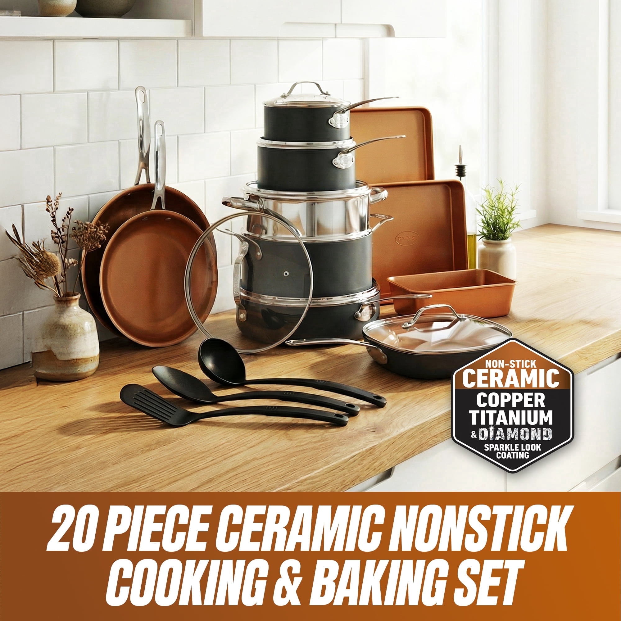Gotham Steel TRUE VALUE 20 Pc Ceramic Pots and Pans Set Non Stick, Ceramic Cookware Set with Bakeware, Pot and Pan Set with Utensils, Non Stick Pots and Pan Set, Oven & Dishwasher Safe, Copper