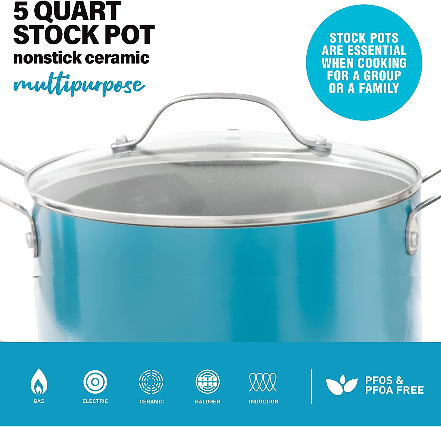 Gotham Steel Aqua Blue Nonstick Multipurpose 5 Quart Ceramic Stock Pot with Glass Lid, Dutch, Sauce & Reheat Food, Oven and Dishwasher Safe