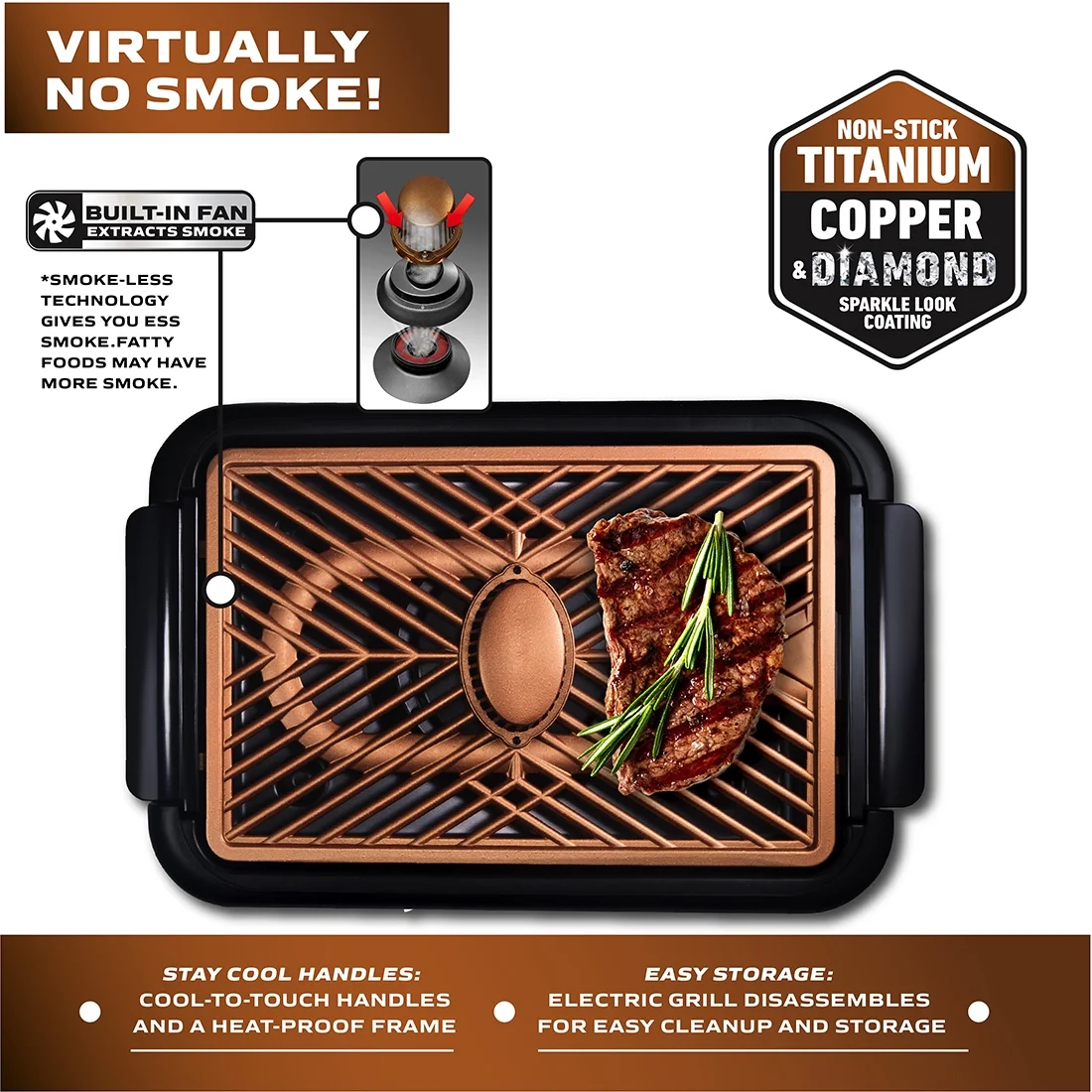 Includes: 1x electric indoor smokeless grill 1x grill grate Built-in fan extracts smoke, keeping your kitchen air clean while you grill delicious steaks, burgers, vegetables, and more. Features Gotham Steel’s signature nonstick surface, reinforced with titanium and ceramic for effortless food release, healthy cooking, and quick cleanup without the need for oil or butter. The 15″ x 10″ grill grate provides even heat distribution, ensuring perfectly cooked meals every time. The adjustable temperature dial allows precise control for a variety of cooking tasks. The removable grease tray collects excess fat and oil, reducing smoke production and promoting healthier meals. Enjoy grilling indoors without the hassle of outdoor setups or excess smoke. The grill disassembles easily for quick cleaning, and all removable parts are dishwasher safe. Its compact design makes it ideal for small kitchens, apartments, or dorm rooms. Features cool-to-the-touch handles and a heat-proof frame for added safety, allowing you to grill with confidence indoors.