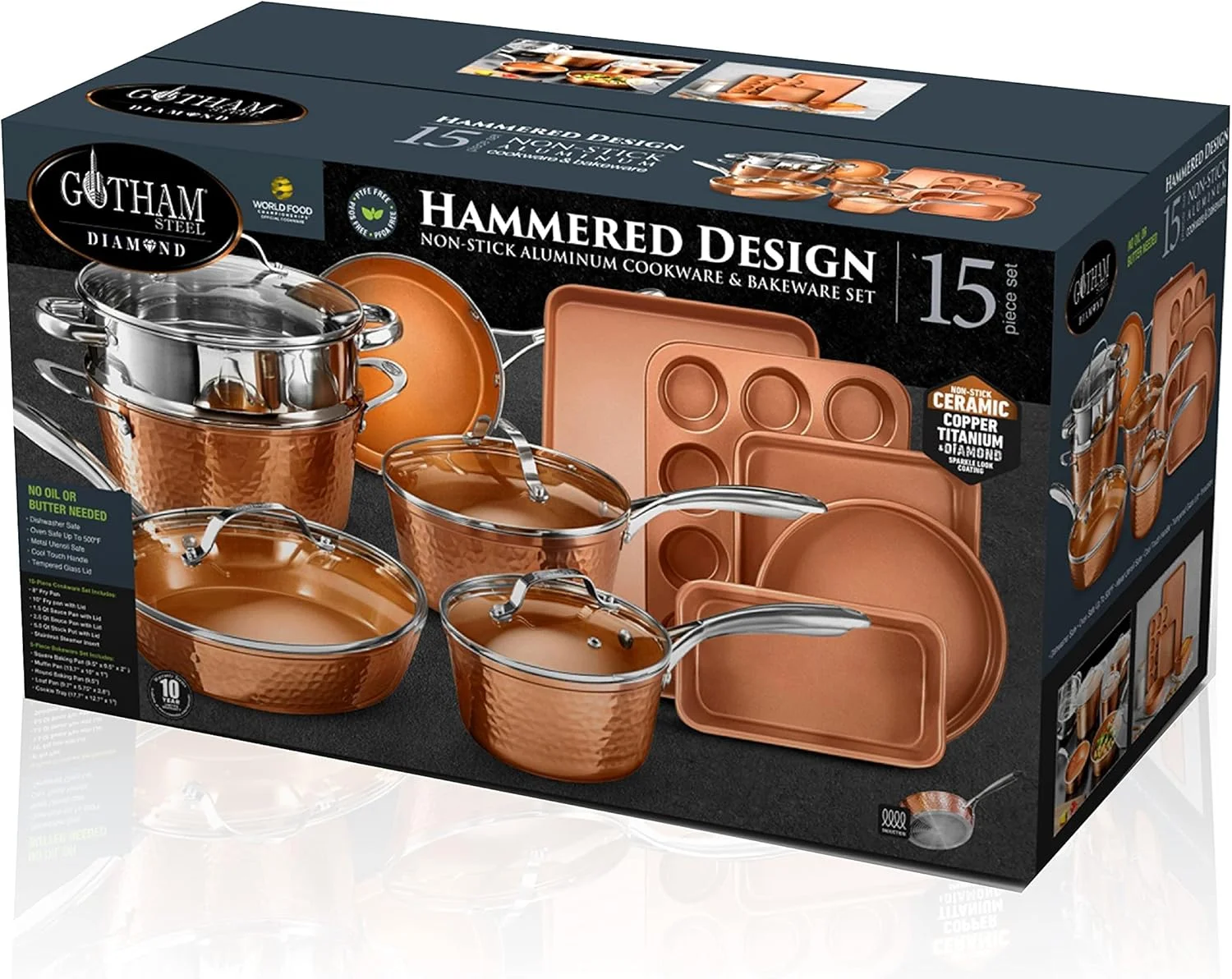 ELEGANT YET PRACTICAL – the Gotham Steel hammered collection is beautiful and makes a statement in every kitchen, yet non-stick, lightweight, scratch resistant and dishwasher safe! ULTRA NONSTICK – our award winning ceramic and titanium coating ensures the ultimate easy release — everything just slides right off the pan, no need for oil or butter – ever COMPLETE COOKWARE & BAKEWARE set includes – 8. 5″ fry pan, 10. 25″ fry pan with lid, 1. 5QT sauce pan with lid, 2. 5QT sauce pan with lid, 5QT stock pot with lid, stainless steel steamer, cookie sheet, round baking pan, square baking pan, loaf pan and muffin pan
