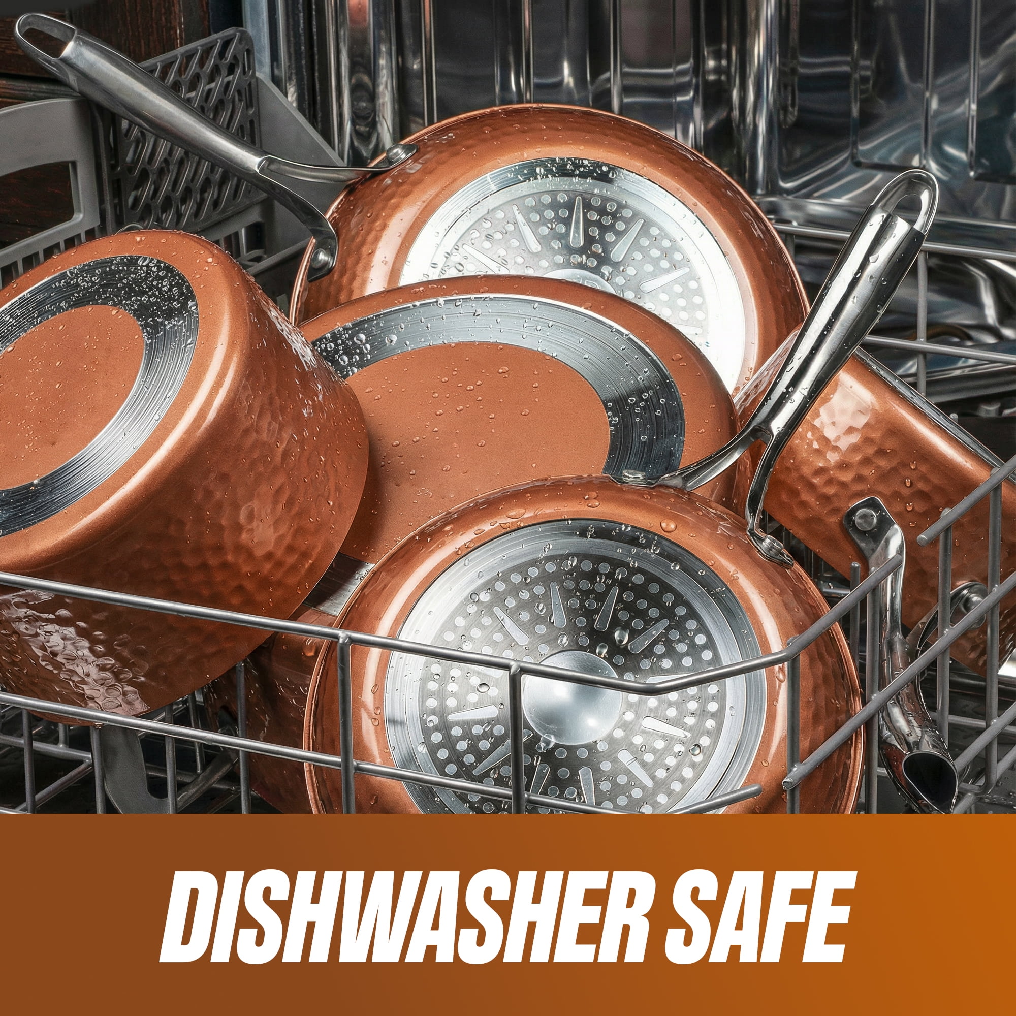 ULTRA NONSTICK CERAMIC SURFACE: Healthy cooking is just a step away. Thanks to a nonstick surface that’s 2x more durable than previous generations, minimal to no oil or butter is needed. And they’re designed to properly conduct heat so food cooks evenly. EASY TO CLEAN: No more stuck-on bits! Food slides right off when used on low and medium heat as directed. Wipe off with minimal scrubbing. The ceramic coating is stain resistant (and scratch resistant) so no need to worry about tomato sauce, beets, or any other food. Plus this set is designed to be dishwasher safe. DISHWASHER SAFE: Spend less time on cleanup during busy weeknights. Once you’re done cooking, just place your cookware into the dishwasher for a hassle-free cleaning experience. EASY TO HANDLE: Easy to lift and move around, from stovetop to oven to table, yet sturdy enough to handle all your cooking needs. Ergonomic handles stay cool to the touch to offer maximum comfort while cooking. OVEN SAFE TO 500˚F: Go from stovetop to table with ease. All pieces are compatible with gas, electric, ceramic, and halogen stovetops. Plus, fry pans and saucepans are compatible with induction ovens, while stock pot is not. GREAT GIFT: Give a practical and thoughtful present: college grads, a wedding shower, newlywed registry, housewarming for new renters and homeowners, or someone who really enjoys cooking with well-made cookware. Or stock a vacation rental with picture-worthy cookware. 10-YEAR GUARANTEE: Guaranteed to last for up to 10 years.
