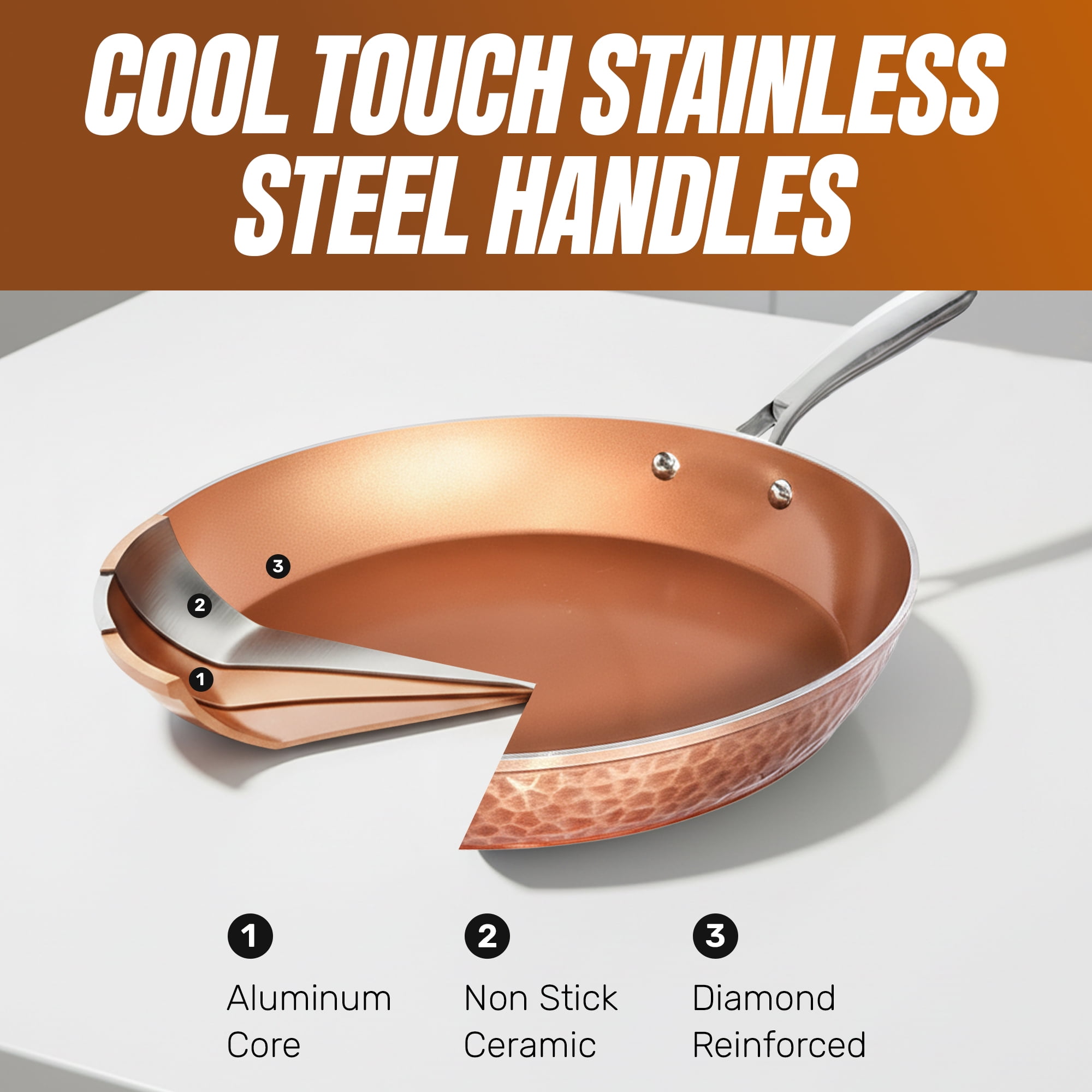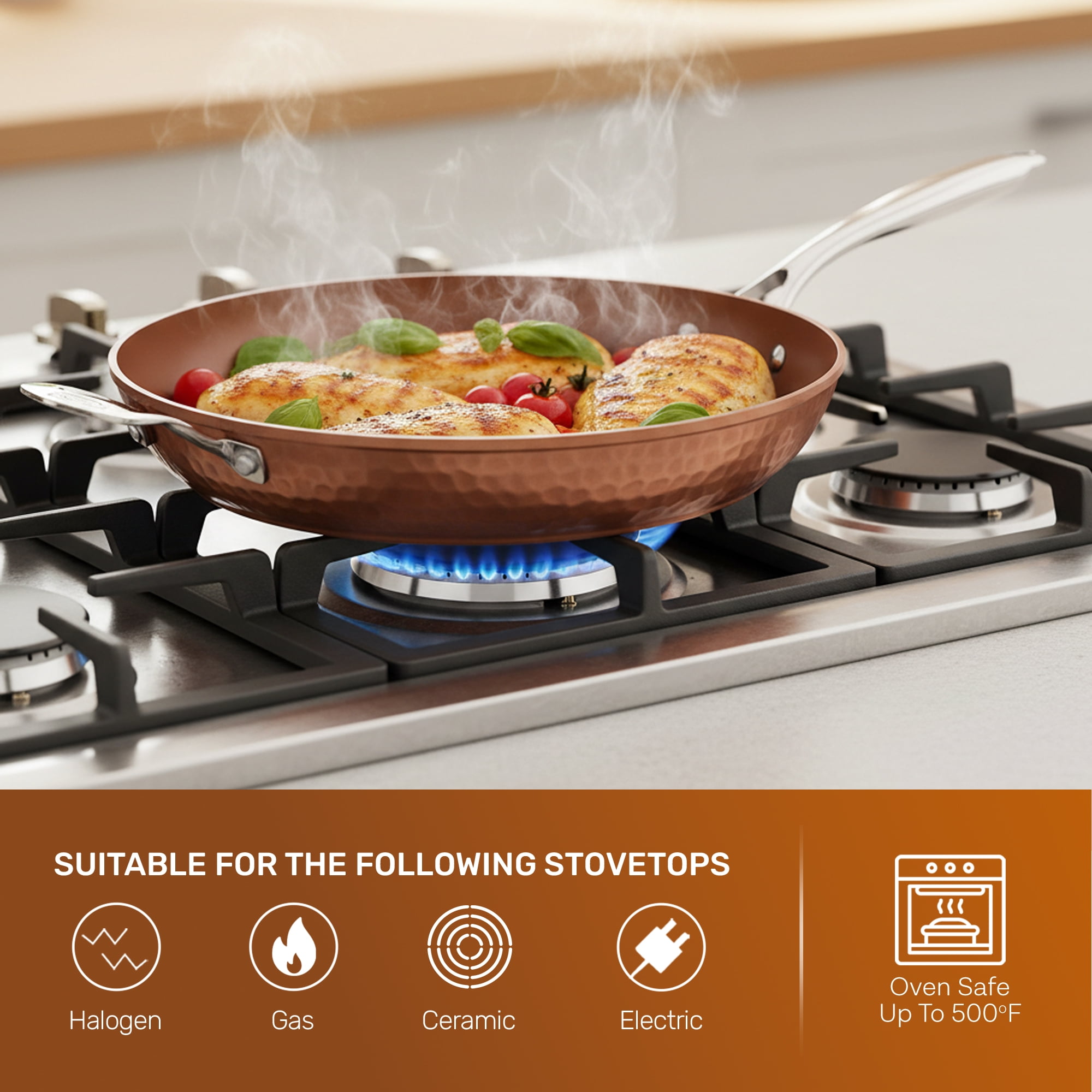Upgrade your kitchen with the Gotham Steel Hammered Nonstick Frying Pan, a premium 14-inch large skillet designed for everyday performance and elegance. This cooking pan features a durable non stick ceramic frying pan coating, making it ideal for healthy meals and effortless cleanup. Crafted with a stunning copper finish and a tempered glass lid, this oven safe skillet is perfect for searing, sautéing, frying, and baking. Whether you’re flipping pancakes, preparing a savory omelette, or cooking a family-sized stir fry, this nonstick skillet handles it all. The non stick pan surface is scratch-resistant and metal utensil safe, making it one of the best non stick frying pans for long-term use. Compatible with all stovetops, including induction cooktops, This frying pan ensures even heat distribution across your meals. It’s also a reliable choice if you’re looking for non toxic pans. Whether you prefer a fry pan, sauté pan, skillet pan, or glass frying pan experience, this product delivers.