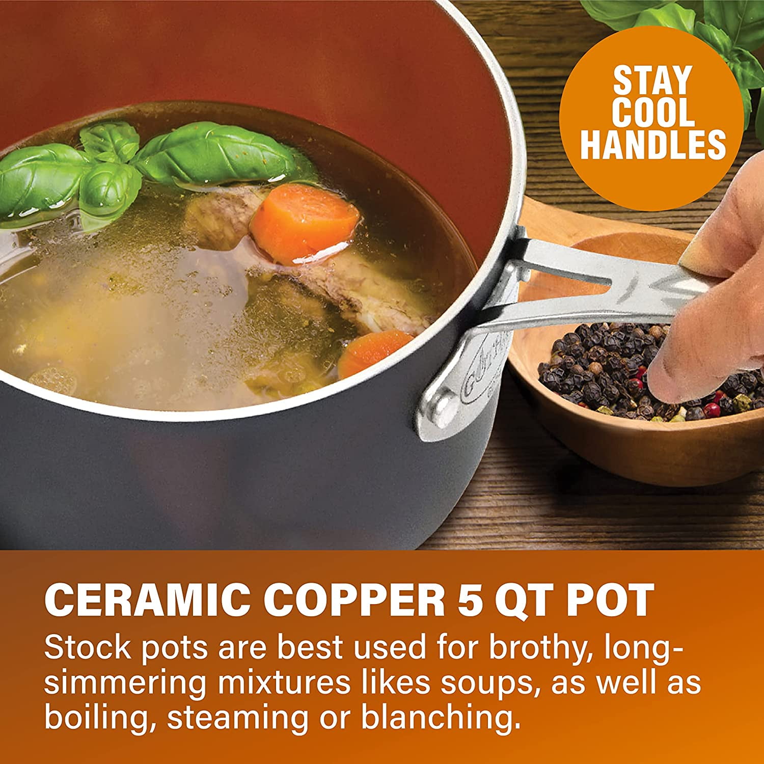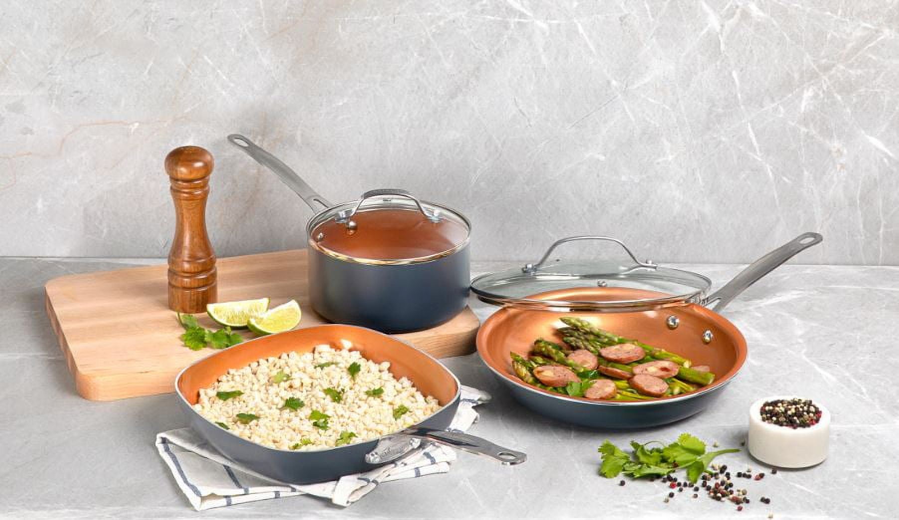 8.5″ skillet Includes: 8.5″ skillet 10.25″ frying pan with tempered glass lid, 1.5 Qt pot with tempered glass lid, 2.5 Qt saucepan with tempered glass lid, 5 Qt stock pot with tempered glass lid, XL aluminum steamer insert for stock pot, 8.5″ skillet 10.25″ frying pan with tempered glass lid, 1.5 Qt pot with tempered glass lid, 2.5 Qt saucepan with tempered glass lid, 5 Qt stock pot with tempered glass lid, XL aluminum steamer insert for stock pot, Enhanced with diamonds, the most robust material on earth, our nonstick coating ensures nothing sticks to the surface, allowing for healthier cooking without the need for oil or butter. Built to last, each piece resists scratches and damages, preserving both the cookware’s appearance and performance, even when using metal utensils. The aluminum construction provides rapid, even heating, helping you achieve perfectly cooked dishes with minimal energy use. Made without harmful chemicals such as lead, and cadmium, our cookware promotes safe cooking practices and environmental responsibility. Oven safe for up to 500°F and compatible with gas, electric, and glass ceramic stove cooktops, offering flexible cooking options from frying and baking to roasting and steaming. This cookware is not induction compatible. Designed for convenience, the entire set is dishwasher safe, ensuring quick and easy maintenance after every use. Stylish Design: The elegant combination of gray and copper tones adds a touch of modern sophistication to your kitchen decor. Stylish Design: The elegant combination of gray and copper tones adds a touch of modern sophistication to your kitchen decor.