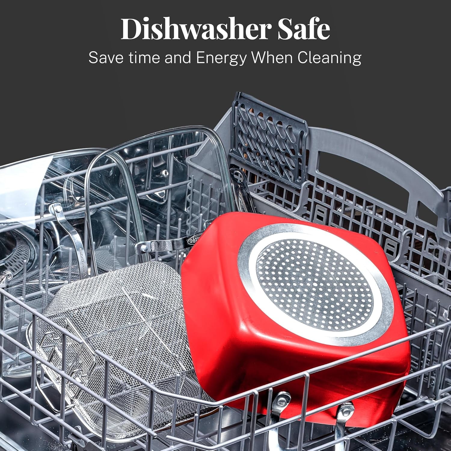 15 Piece Pots and Pans Nonstick Set: Includes 8.5″ skillet 10.25″ frying pan with tempered glass lid, 1.5 Qt pot with tempered glass lid, 2.5 Qt saucepan with tempered glass lid, 5 Qt stock pot with tempered glass lid, 5 Qt stainless steel steamer insert for stock pot, 9.5″ shallow square pan, 9.5″ deep square pan with lid, 9.5″ deep fry basket, 9.5″ stainless steel steamer tray for deep square pan, 8.5″ skillet 10.25″ frying pan with tempered glass lid, 1.5 Qt pot with tempered glass lid, 2.5 Qt saucepan with tempered glass lid, 5 Qt stock pot with tempered glass lid, 5 Qt stainless steel steamer insert for stock pot, 9.5″ shallow square pan, 9.5″ deep square pan with lid, 9.5″ deep fry basket, 9.5″ stainless steel steamer tray for deep square pan, 5 Piece Bakeware Set: Includes Large baking sheet (11.5″ x 17.2″ x 1″) 12 cup muffin pan (13.7″ x 10″ x 1″) Round pan (9″ diameter x 1.5″ deep) Square bake pan (9.5″ x 9.5″ x 2″) Loaf pan (9.25″ x 5.25″ x 2.75″) Large baking sheet (11.5″ x 17.2″ x 1″) 12 cup muffin pan (13.7″ x 10″ x 1″) Round pan (9″ diameter x 1.5″ deep) Square bake pan (9.5″ x 9.5″ x 2″) Loaf pan (9.25″ x 5.25″ x 2.75″) Diamond-Infused Ceramic Coating: Enhanced with diamonds, the most robust material on earth, our nonstick coating ensures nothing sticks to the surface, allowing for healthier cooking without the need for oil or butter. Titanium-Reinforced Durability: Built to last, each piece resists scratches and damages, preserving both the cookware’s appearance and performance, even when using metal utensils. Optimal Heat Distribution: The aluminum construction provides rapid, even heating, helping you achieve perfectly cooked dishes with minimal energy use. Safe and Eco-Friendly: Made without harmful chemicals such as PFOA, PFOS, lead, and cadmium, our cookware promotes safe cooking practices and environmental responsibility. Oven and Stovetop Versatility: Oven safe for up to 500°F and compatible with gas, electric, and glass ceramic stove cooktops, offering flexible cooking options from frying and baking to roasting and steaming. Effortless Cleanup: Designed for convenience, the entire set is dishwasher safe, ensuring quick and easy maintenance after every use. Effortless Cleanup: Designed for convenience, the entire set is dishwasher safe, ensuring quick and easy maintenance after every use.