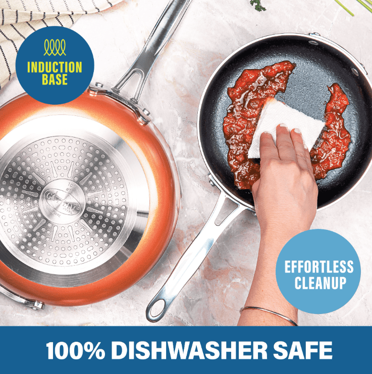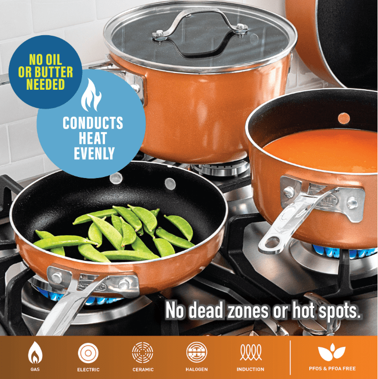 As Seen on TVStackable cooking vessels make it easy to reduce kitchen clutter and help increase available space in cabinets and drawers8-piece cookware set includes: 1.5 qt. saucepan with lid2 qt. saucepan with lid5.35 qt. stock pot with lid7″ fry pan10″ fry pan Thermally-efficient aluminum construction delivers rapid, even heating for consistent cooking resultsInterior nonstick coating makes cookware easy to clean after use and promotes healthier cooking with less oilStainless steel base is compatible with all stove types, including inductionCovered cookware comes with a shatter-resistant tempered glass lid to seal in heat and moisture while allowing you to visibly monitor cooking progressDouble-riveted stainless steel handles