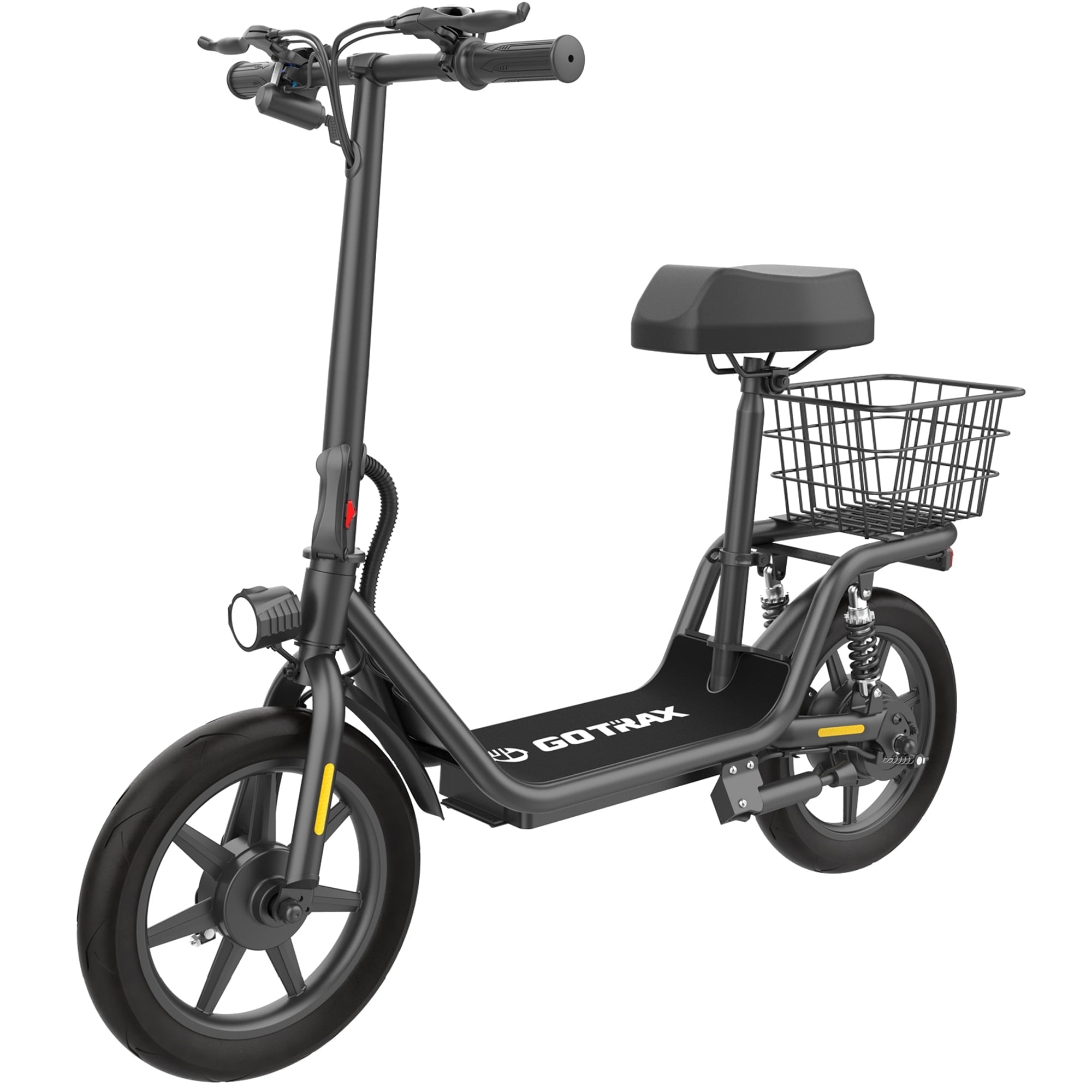 Get around town in comfort on the GOTRAX Flex. Thanks to its comfortable and adjustable seat, it’s easy to sit back, relax, and enjoy the ride. Its 14” pneumatic tires and rear suspension eat up any bumps in the road, keeping your journeys smooth. Its folding handlebars make storage easier than ever, while a carrying basket allows you to haul school supplies, groceries, and more. Plus, with a 350W motor, the Flex takes rides to speeds of up to 15.5 miles per hour, helping you get around town in no time. If you’re looking for a new way to commute, the Flex is the perfect choice. Name : FLEX E-Scooter with Seat Color : Black Special Feature : Portable, Seat, Basket, Foldable Weight Limit : 265 Pounds Battery size: 36V 7.8Ah Wheel Material : Rubber Frame Material : High-strength Steel Wheel Type : 14″ x 2.125” pneumatic tires Rated Power : Peak 550W(Nominal Power 400W) Best Rider Height: 5’3″ – 6’3″ Max Speed : 15.5mph(25km/h) Lithium Battery : 36V 7.8Ah(280.8Wh) Estimated Max Range : 16Miles(26km) Suspension : Dual Rear Suspensions Recommended Height : 4.7-6.2FT/145-190CM Suggested Use : Neighborhood, Commute Charging Time : 5.5 Hours Package Weight : 25.9 Kilograms Item Dimensions LxWxH : 45 x 18.5 x 49 inches Item Package Dimensions L x W x H : 46.9 x 22.2 x 10.4 inches