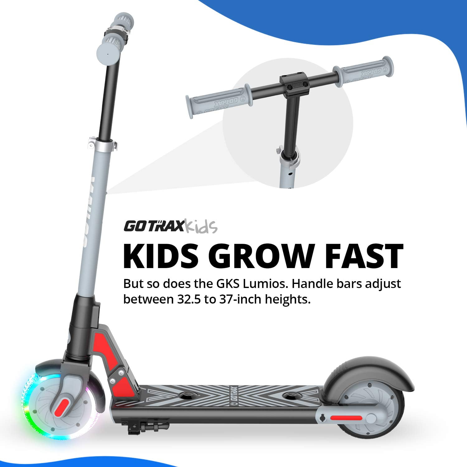 Introducing the GOTRAX GKS Lumios Electric Scooter for Kid Ages 6-12, the perfect way for your kids to have fun while being environmentally friendly! With its UL safety certified 150W motor, 6″ solid wheels, and top speed of 7.5mph, your kids will have a blast riding around the neighborhood. The eco-friendly Li-Battery ensures a long-lasting ride, while the aircraft-grade metal and VO fire retardant deck provide durability and safety. The scooter is easy for your child to master, with a gravity sensor for slowing down and a rear brake for a safe stop. Plus, the adjustable height means your child can enjoy it for years to come. And with its new LED luminous front wheel design, your child will be the center of attention at night while riding safely with the LED lights. Get your child the GOTRAX GKS Lumios Kids Electric Scooter today! Name : Gotrax Gks Lumios Electric kick Scooter Color : Gray/Blue/Green/Pink User Age : 6-12 years old Special Feature : Adjustable Handlebar Height Weight Limit : 154 Pounds Item Dimensions LxWxH : 33 x 15 x 32 inches Wheels : 6″ Solid Tires Distance : 6.25 Miles Max Speed : 7.5 mph Motor : 150 Watt Charging Time : 5 hours Frame Material : Aluminum Item Weight : 18.7 Pounds Handle Height : 37 Inches Wheel Type : Solid Brake Style : Rear Braking