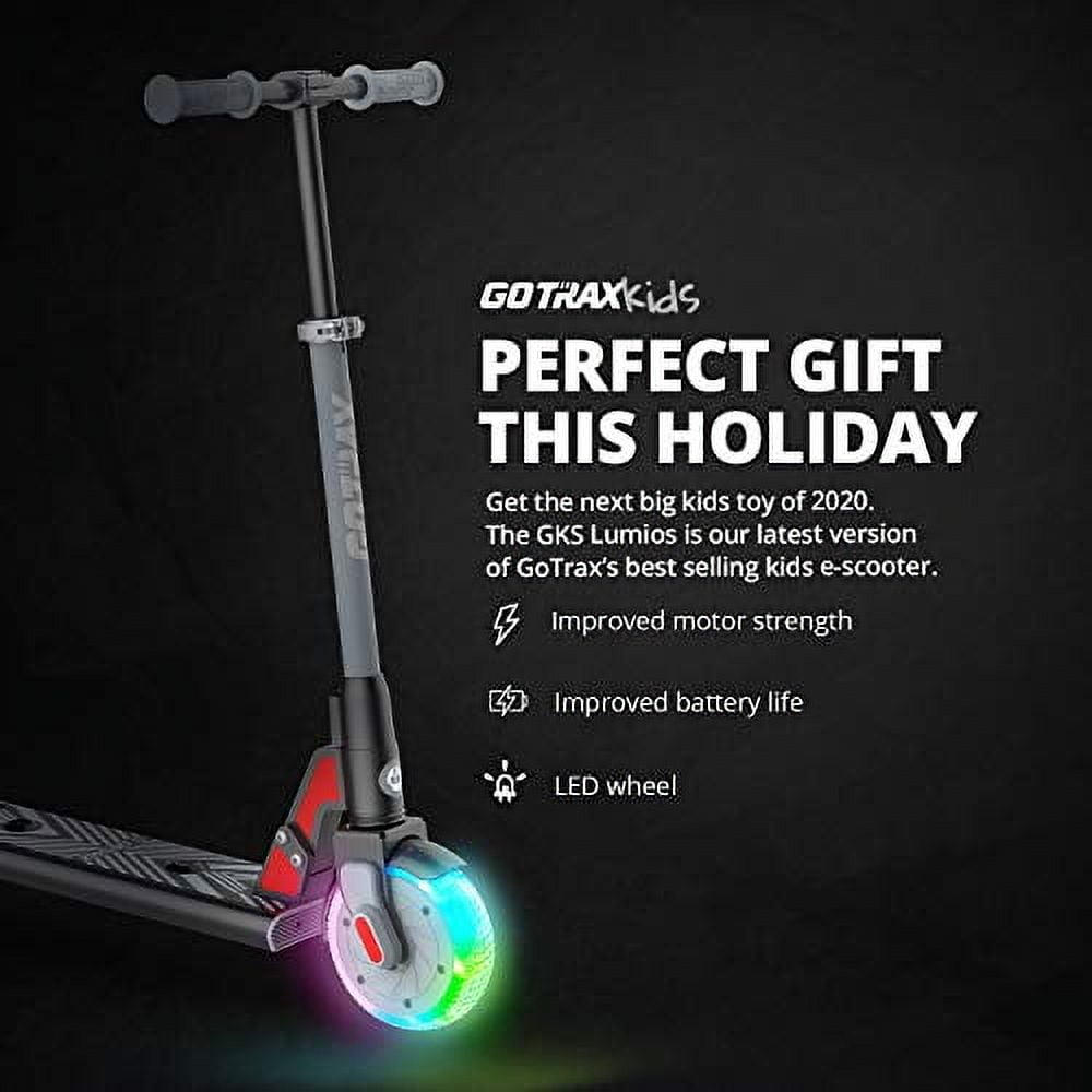 Kids Kick Scooter – The Gotrax GKS LUMIOS is the brilliant e scooter for kids. Attracted by the vibrant color and LED wheel it’s sure to be their favorite toys. The light weight frame is made from Aircraft-Grade Aluminum, features a fire retardant deck. FANTASTIC LED WHEEL – Your kids will be thrilled when they see their new glowing electric scooter. The front wheel now has a built in neon led that shines bright and stands out. Upgraded Battery and Motor – More time to play means more fun. Ride up to 6.25 miles per charge using the new 20% larger battery. The GKS LUMIOS features a 150W motor that reaches a safe max speed of 7.5mph. Adjustable Handlebars – Now the GKS LUMIOS can grow with your child so they can enjoy it for years to come. Easily adjust the handle bars to heights between 32.5″- 37″. Bringing Family Together – The GKS LUMIOS kick scooter is perfect for kids ages 6-12 up to 154lbs. The Assembly is simple and can be done together. Quickly install the few screws and your scooter is ready to go! Supervision while riding is recommended.