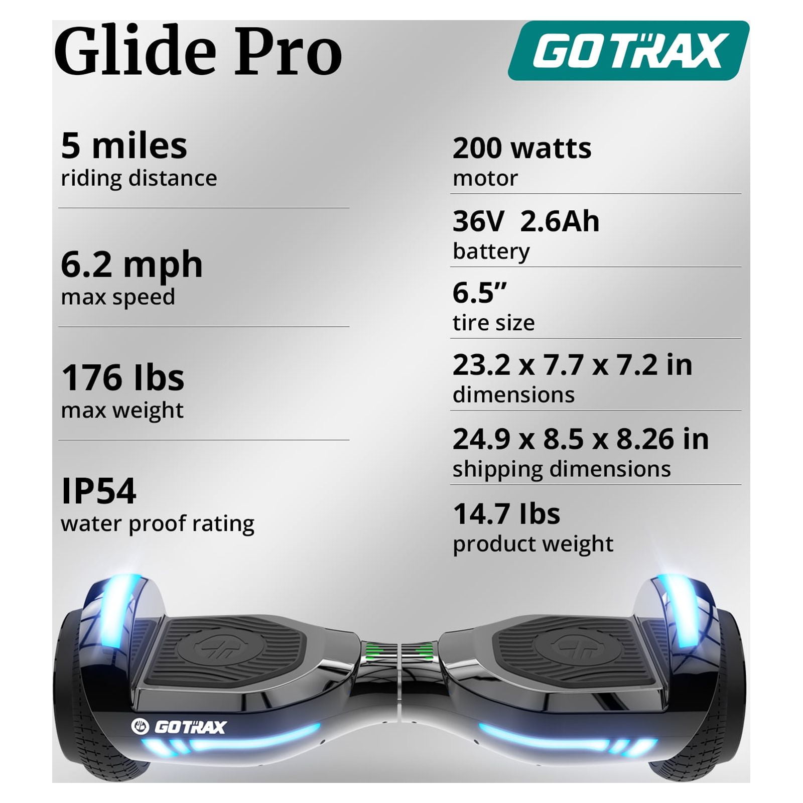 The Glide Pro Hoverboard features cool led-lit wheels in the shape of the GOTRAX logo that lights up the night. Fender lights and headlights ensure your driving safety at night and stand out. The 6.5inch size tire creates a smoother ride and makes the hoverboard easier to go for Child. Each of this hoverboard isn’t just for kids/child. It can be a thoughtful and unique gift for your friends and family. It’s a fun surprise and can carry riders of all sizes up to 176 lbs with its 14.77 lb. Equipped with a self-balancing control system to go straight, make a turn, and rotate for 360 degrees locally, and is operated at will GOTRAX hoverboards get their popularity from innovative designs, and reliable quality. GOTRAX hoverboards floor is affixed with a unique UL certification label. Mile Range: Max 5 miles (Actual performance will be affected by user’s weight, road) Motor: Dual 200W brushless gear motors Light: LED wheels, Fenders light, and headlight Charging Time: 4 hours Climbing Capacity: 8˚ Frame Materials: PC + ABS Wheels Size: 6.5inch Net Weight: 14.7 lbs Product Dimensions: 22.7 x 7.7 x 7.2 inches