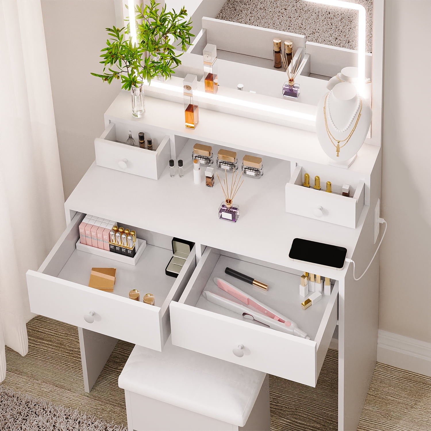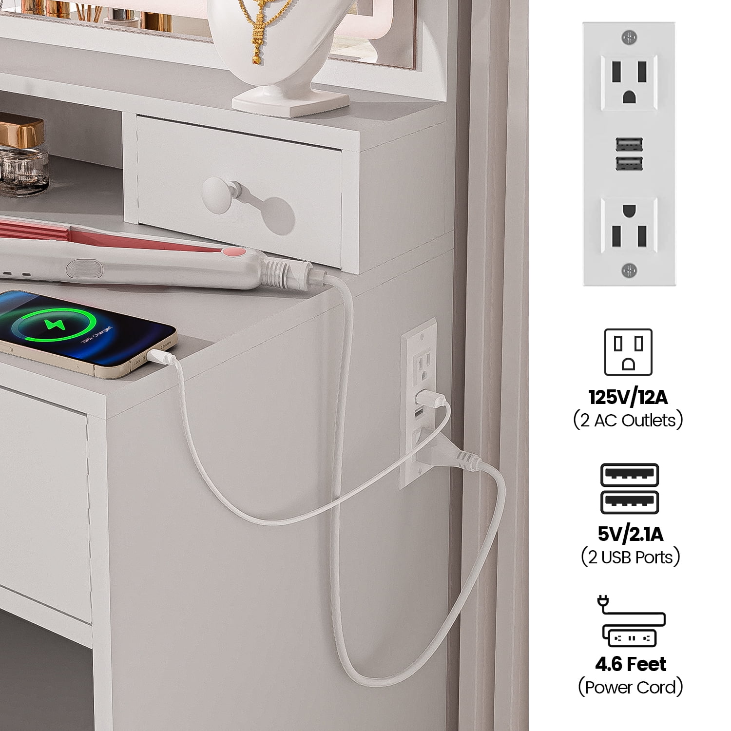 Built-in Charging Station Perfect Size & Large Mirror Ample Storage Space Charming white makeup vanity Quality Material & Excellent Service