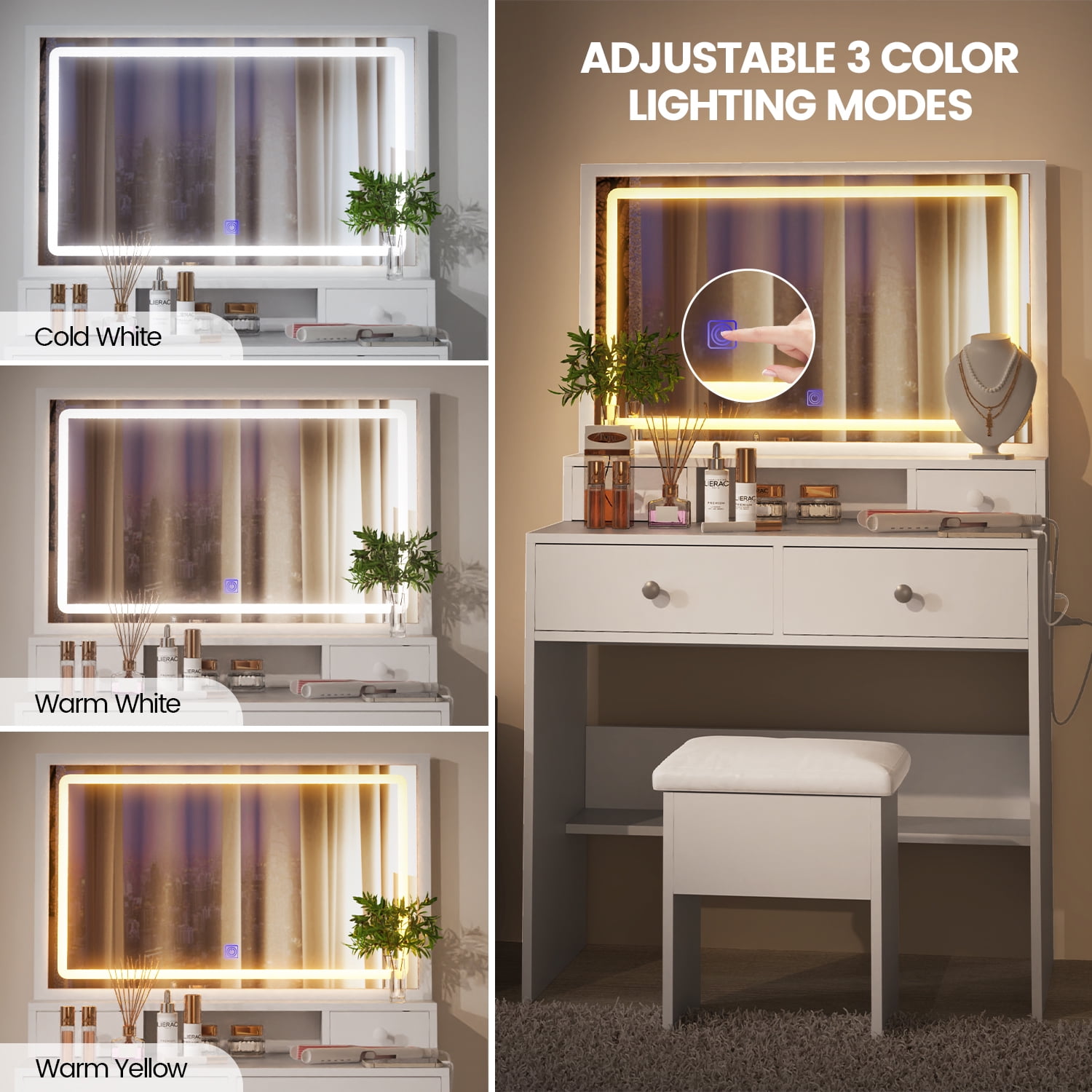 The makeup vanity has bright and adjustable LED lights that come with three different color settings: warm yellow, warm white, and cold white. You can simply touch the switch to change the color mode. It’s perfect for doing your makeup at home, in salon, or even for live broadcasts. This vanity provides plenty of storage space with four drawers. It has two large drawers and two smaller drawers on the tabletop, allowing you to neatly organize your various cosmetics, perfumes, makeup brushes. What sets this makeup vanity apart is its built-in charging station. It includes two standard plug sockets and two USB ports , making it more convenient to connect your hair dryer, curling iron, and other devices. You can also charge your phone, tablet, or other mobile devices, and even take a beautiful selfie once your makeup is done. The makeup table features a bright LED lighted mirror with three modes: warm, natural, and cold. You can choose the lighting mode that suits you best for your makeup application. This classy and practical makeup vanity makes an ideal gift for your wife, daughter, or granddaughter on occasions like birthdays, holidays, and other special days. They will love its stylish appearance and functionality.