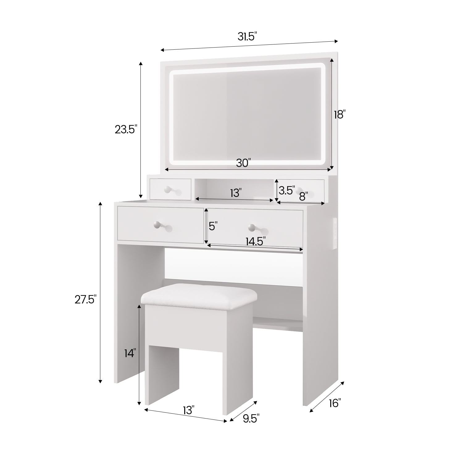 Gounni Vanity Set with Large Lighted Mirror & Power Outlet, Makeup Vanity Table Desk Chair Set for Bedroom, White