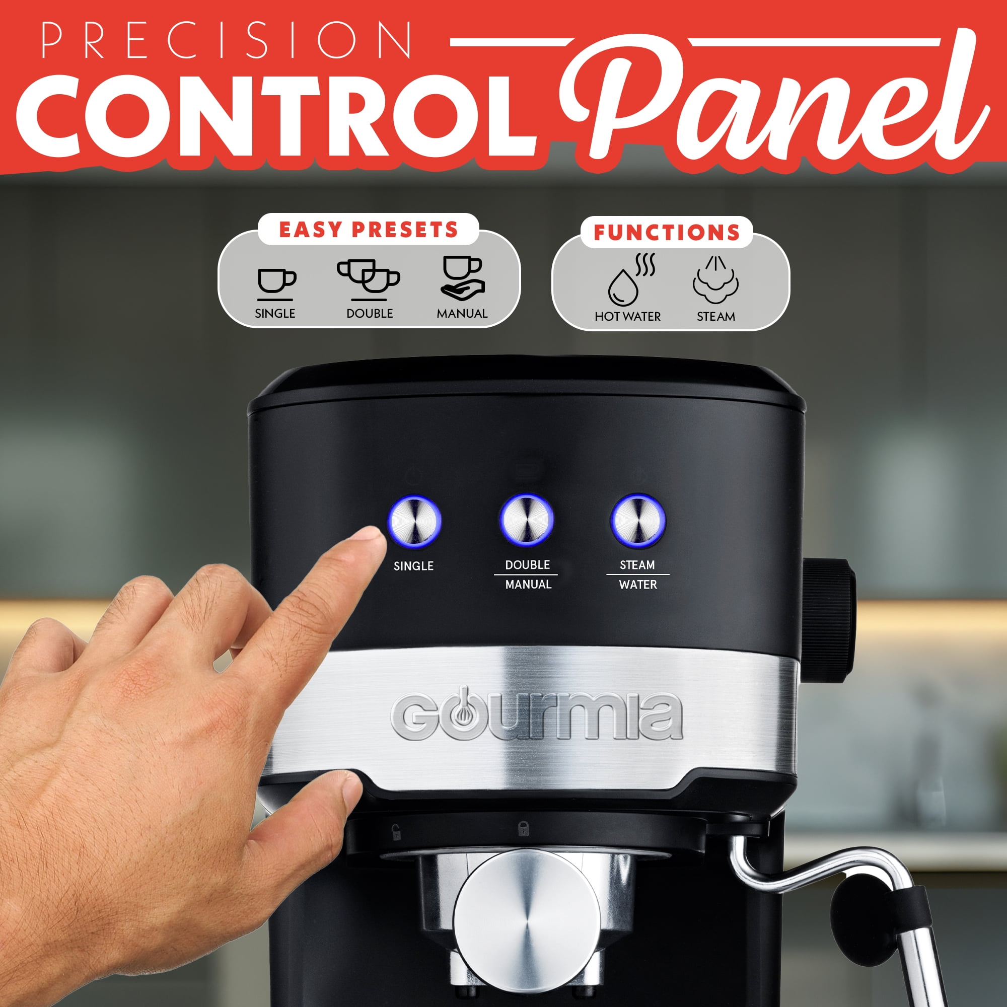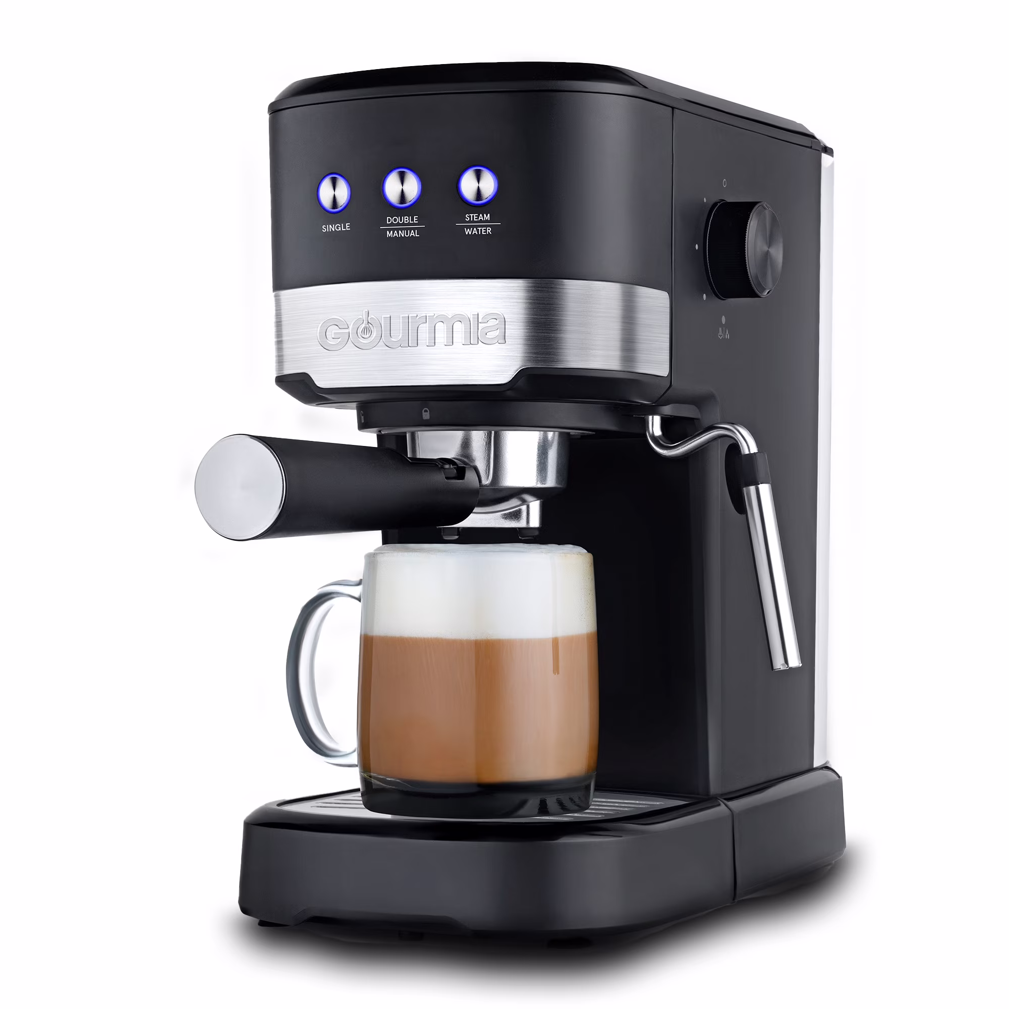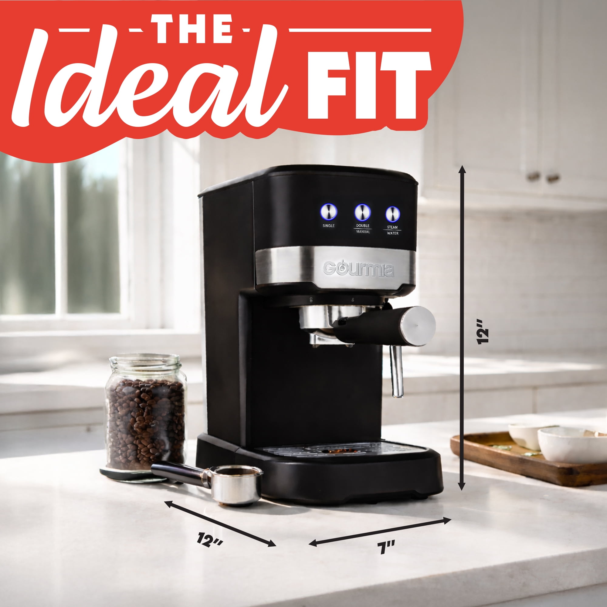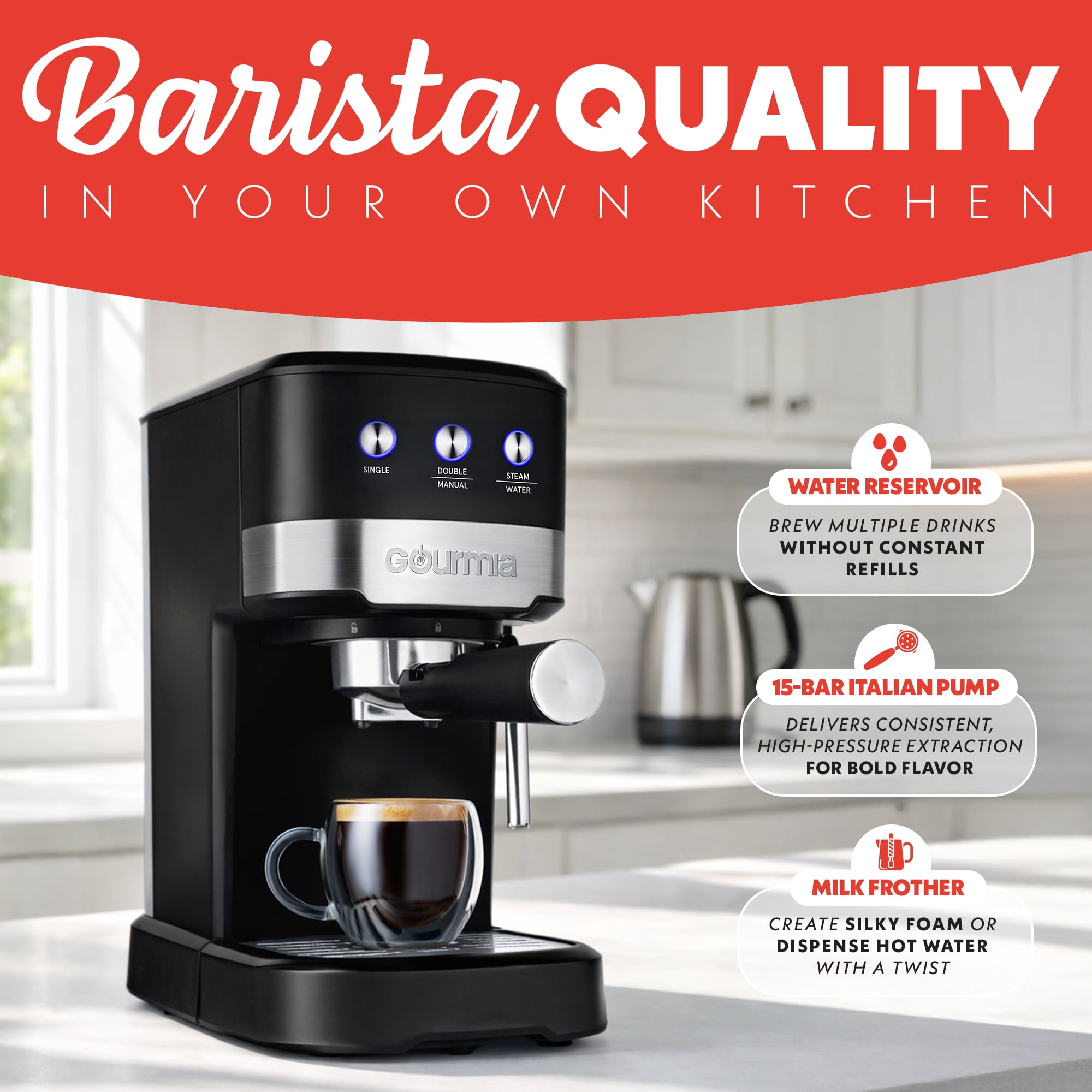 Gourmia 15-Bar Espresso Maker Brew single or double shots of espresso Integrated frothing wand Make authentic lattes, cappuccinos and more Large 1.2-liter capacity Simple controls for one-touch operation Stainless steel accents complement any kitchen Model: New GCM 4224 Weight: 9.26 lb
