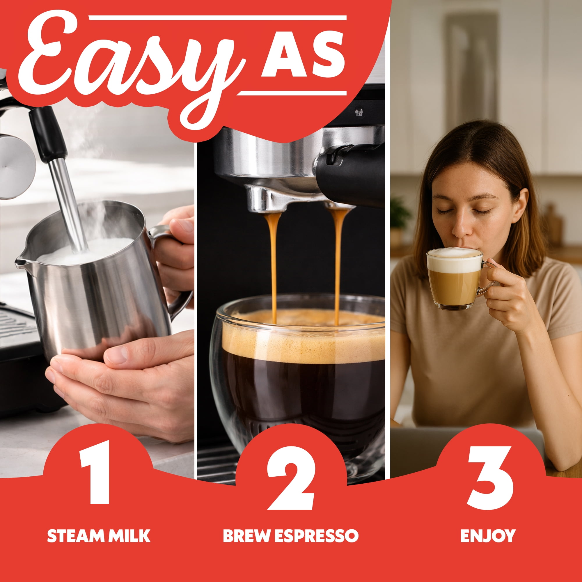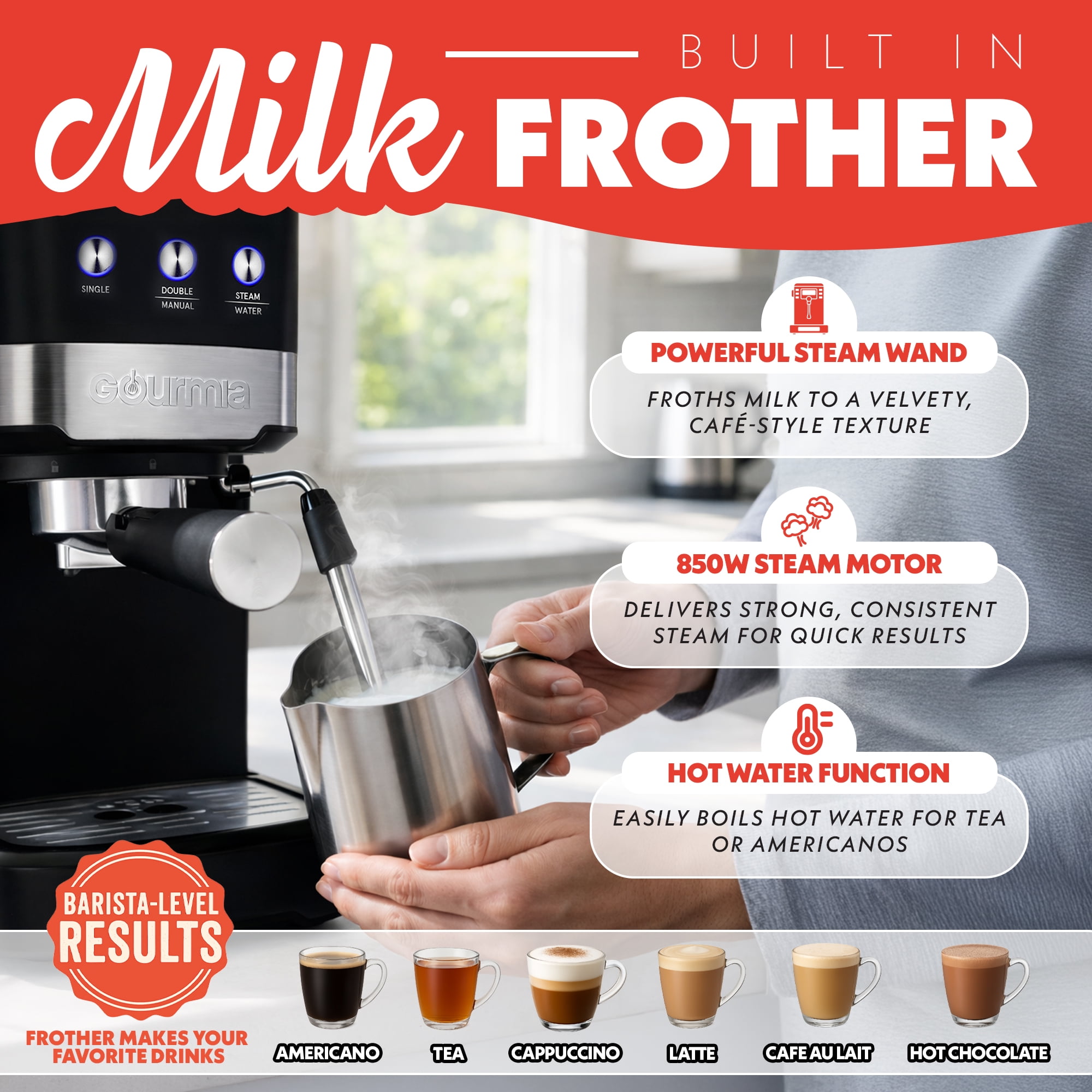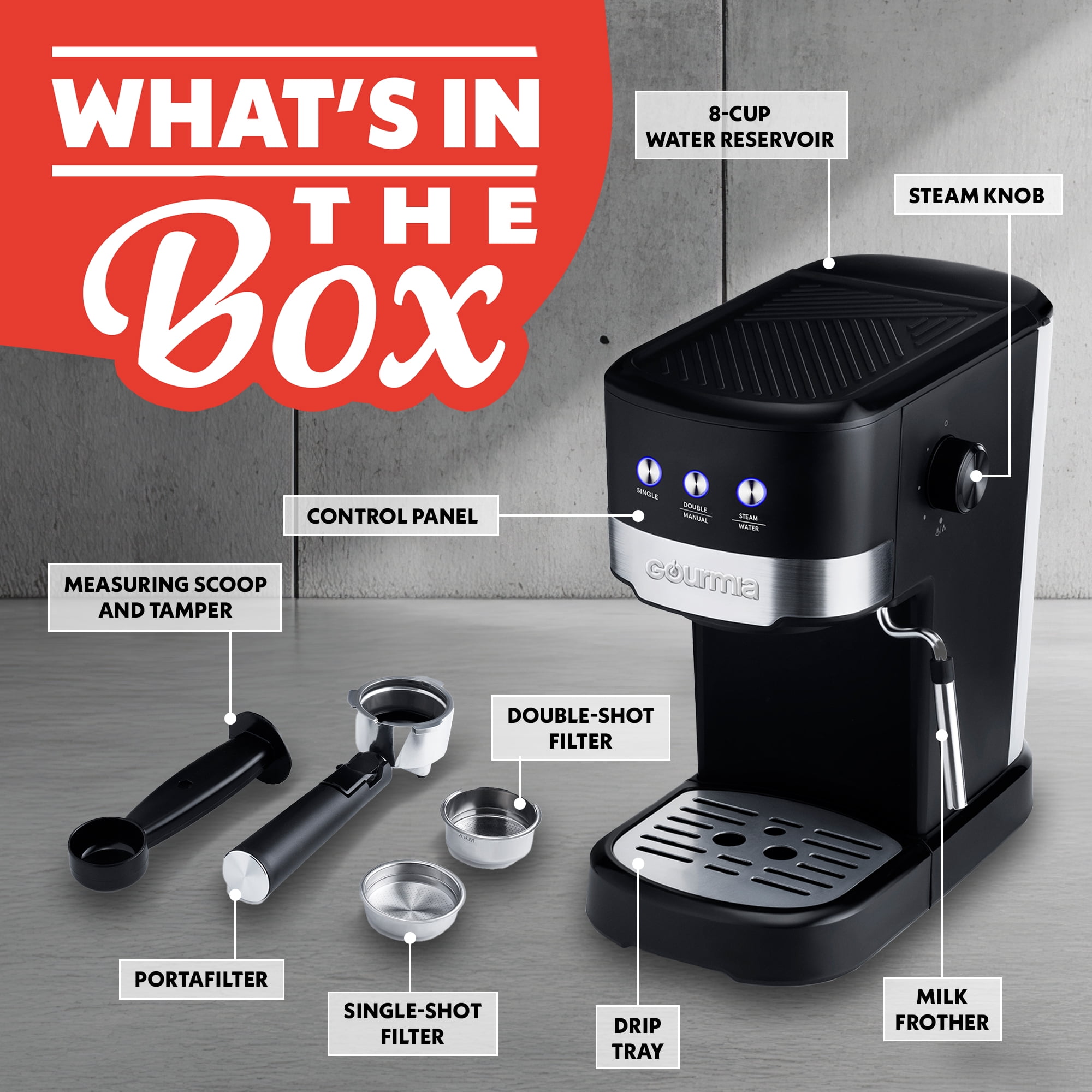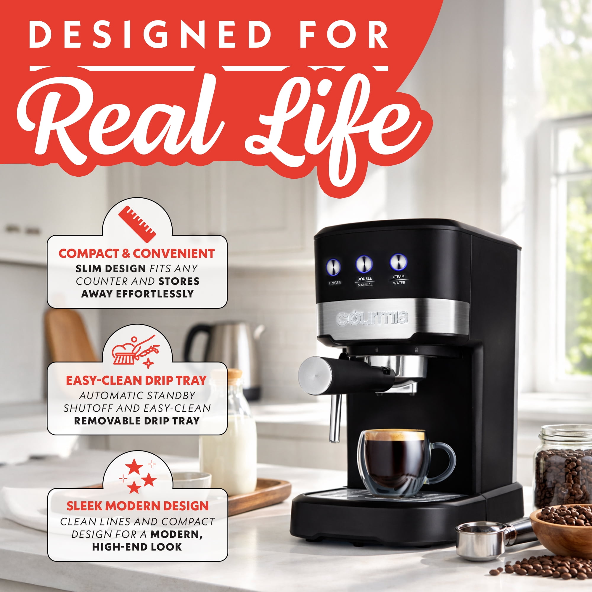 Gourmia 15-Bar Espresso Maker Brew single or double shots of espresso Integrated frothing wand Make authentic lattes, cappuccinos and more Large 1.2-liter capacity Simple controls for one-touch operation Stainless steel accents complement any kitchen Model: New GCM 4224 Weight: 9.26 lb