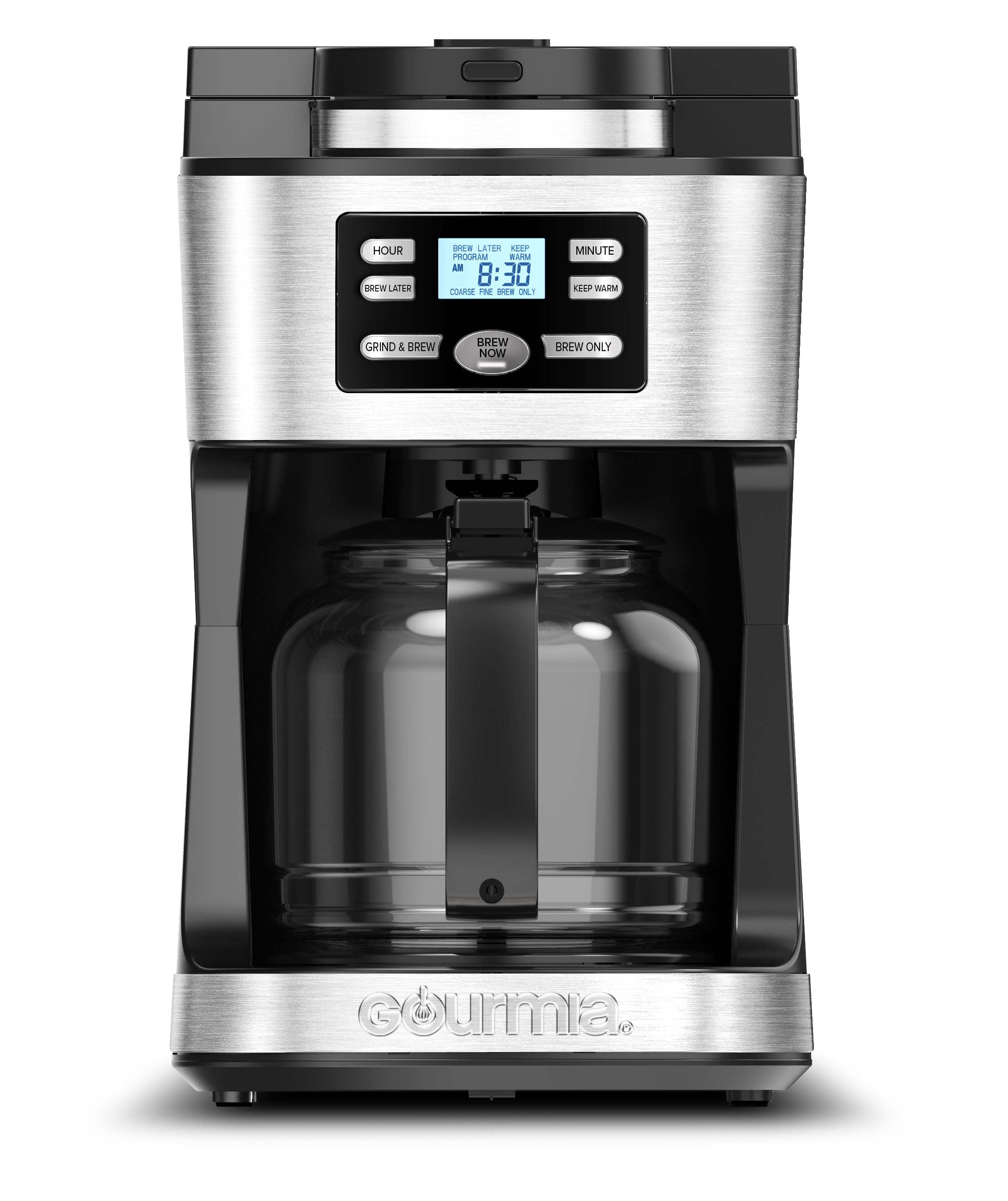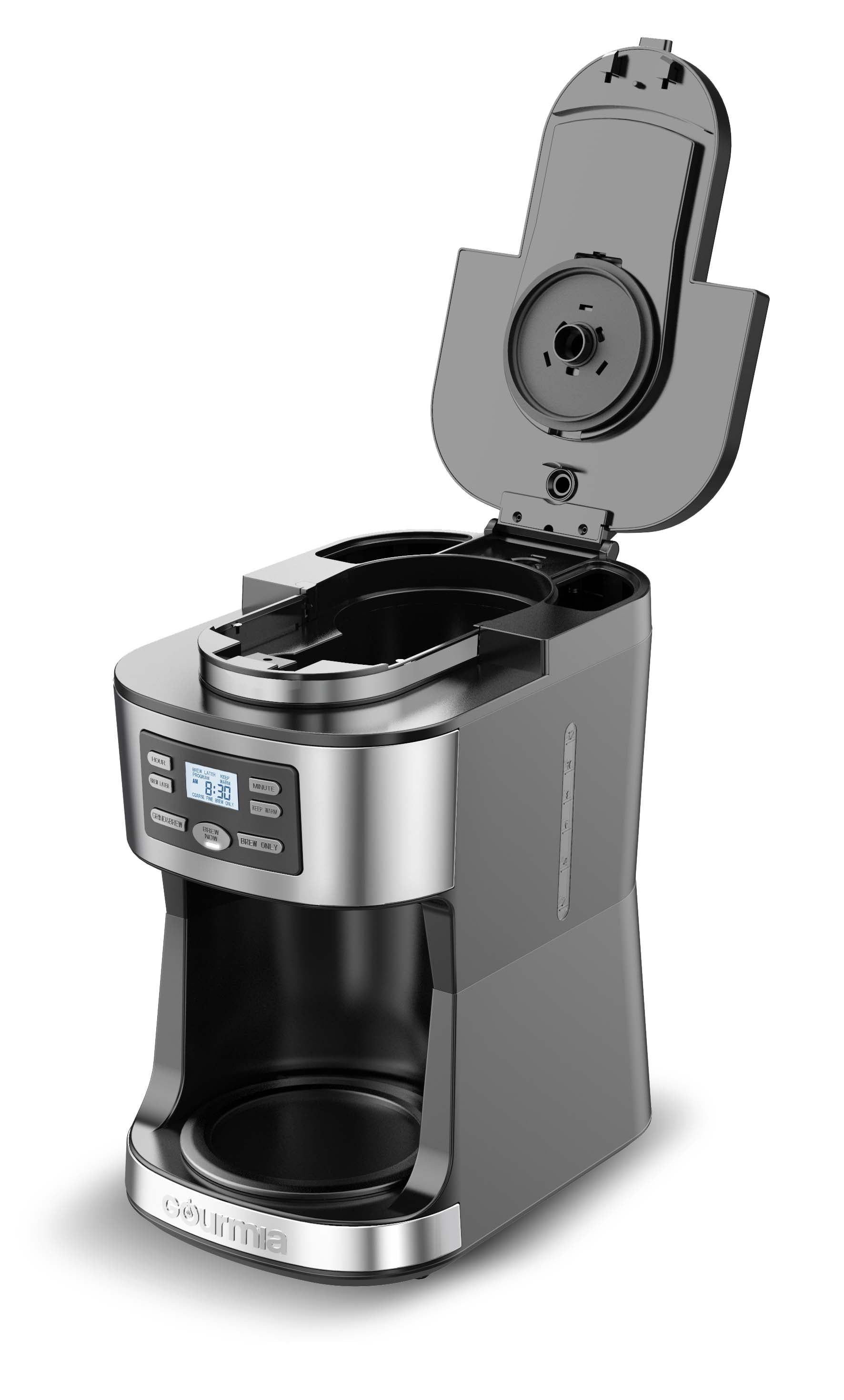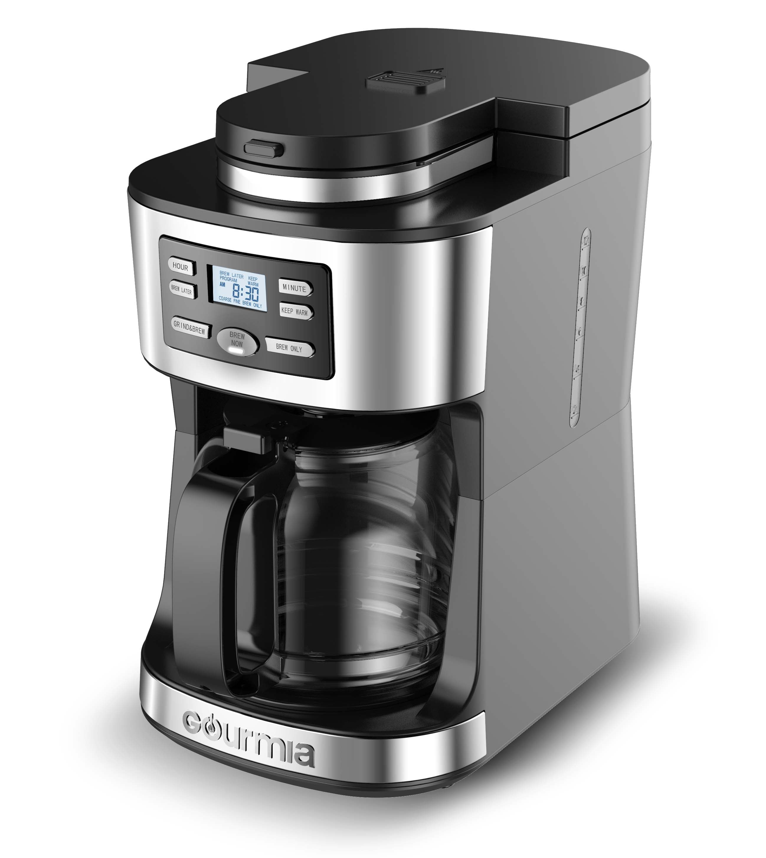 Gourmia 12-Cup Grind & Brew Coffee Maker with Integrated Grinder, Black, New Integrated coffee grinder to grind beans right before brewing for great-tasting, fresh coffee Grinder retains maximum aroma and produces uniform grinds, select coarse or fine size Option to turn off grinder to brew your favorite pre-ground coffee Programmable brew later so you can set at night and wake up to a fresh morning brew Increase keep-warm time up to 4 hours for coffee that’s ready when you are Freshness Indicator timer shows how much time passed since coffee was brewed Pause & Serve allows you to remove carafe to enjoy a cup before brewing is completed Easy-read display with large time for easy viewing and programming Removable parts make cleanup convenient and hassle-free Auto shut-off for safe, stress-free usage