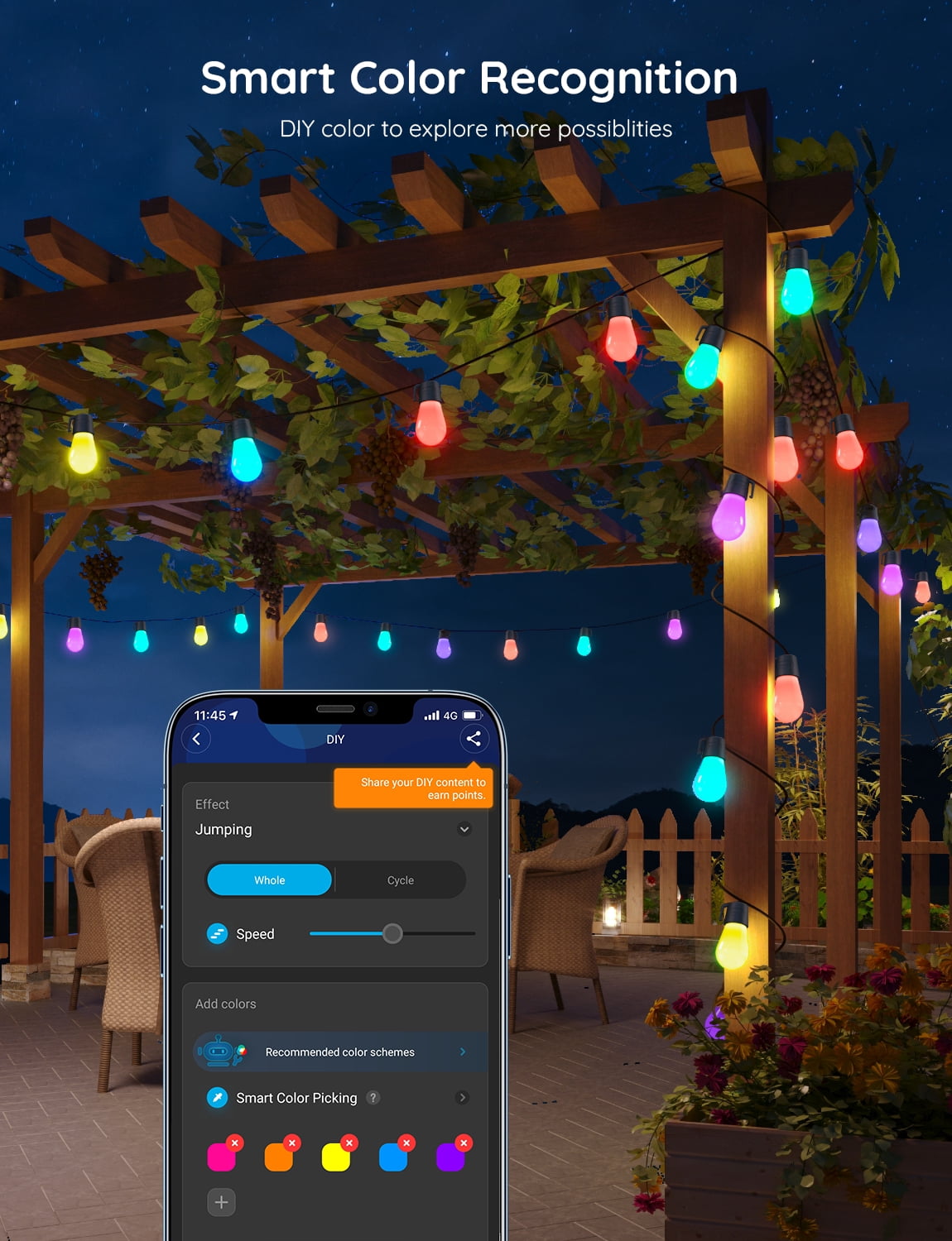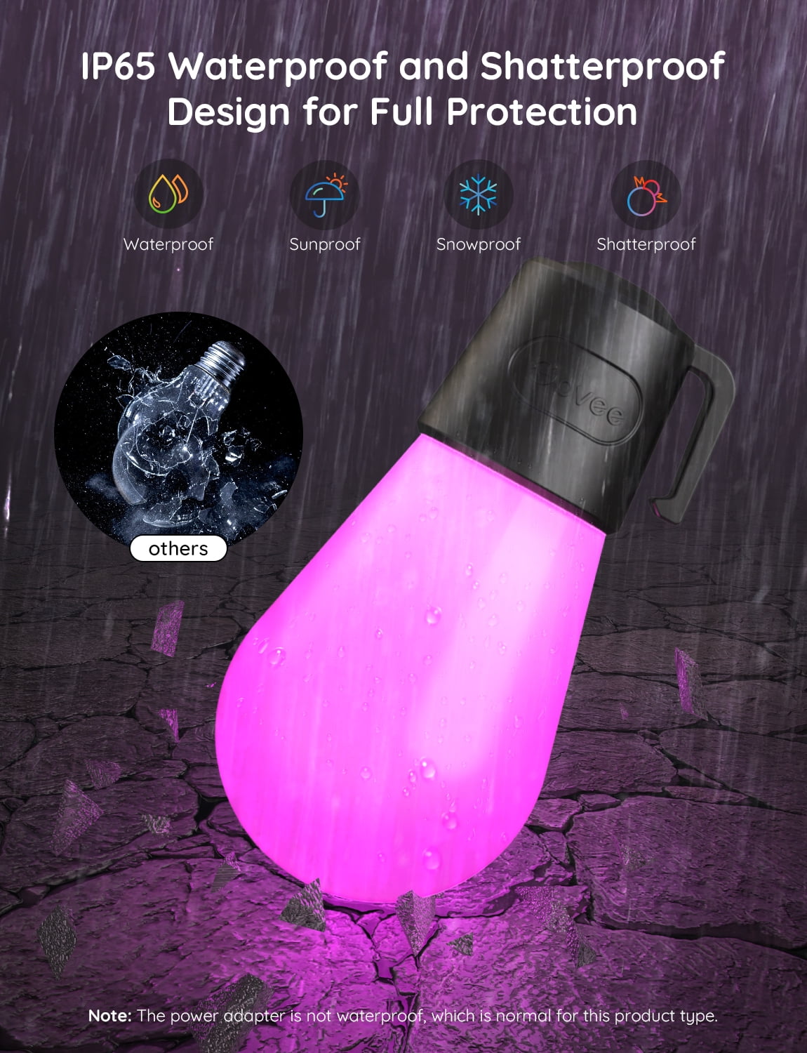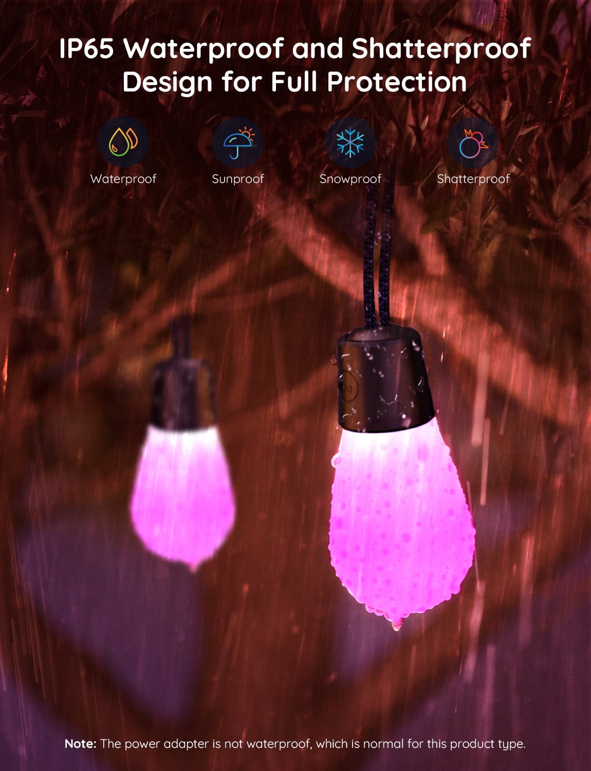 Fully waterproof design with IP65 rating to withstand rain and splashes, making it perfect for outdoor use in gardens, patios, backyards, and other outdoor gatherings. RGBIC technology allows for individually addressable RGBWW bulbs, enabling you to create a wide range of vibrant, customizable lighting effects with 40 preset scene modes. Easily control the lights through the smart app, adjusting brightness, setting timers, and choosing from various lighting modes, including music sync mode and DIY mode for personalized effects. Connectable series feature lets you link up to two sets of string lights for a maximum length of 96ft, powered by a single power plug for added convenience. Suitable for a variety of indoor and outdoor occasions, such as BBQs, pool parties, weddings, and other gatherings, to create warm, inviting vibes and make your events even more special.