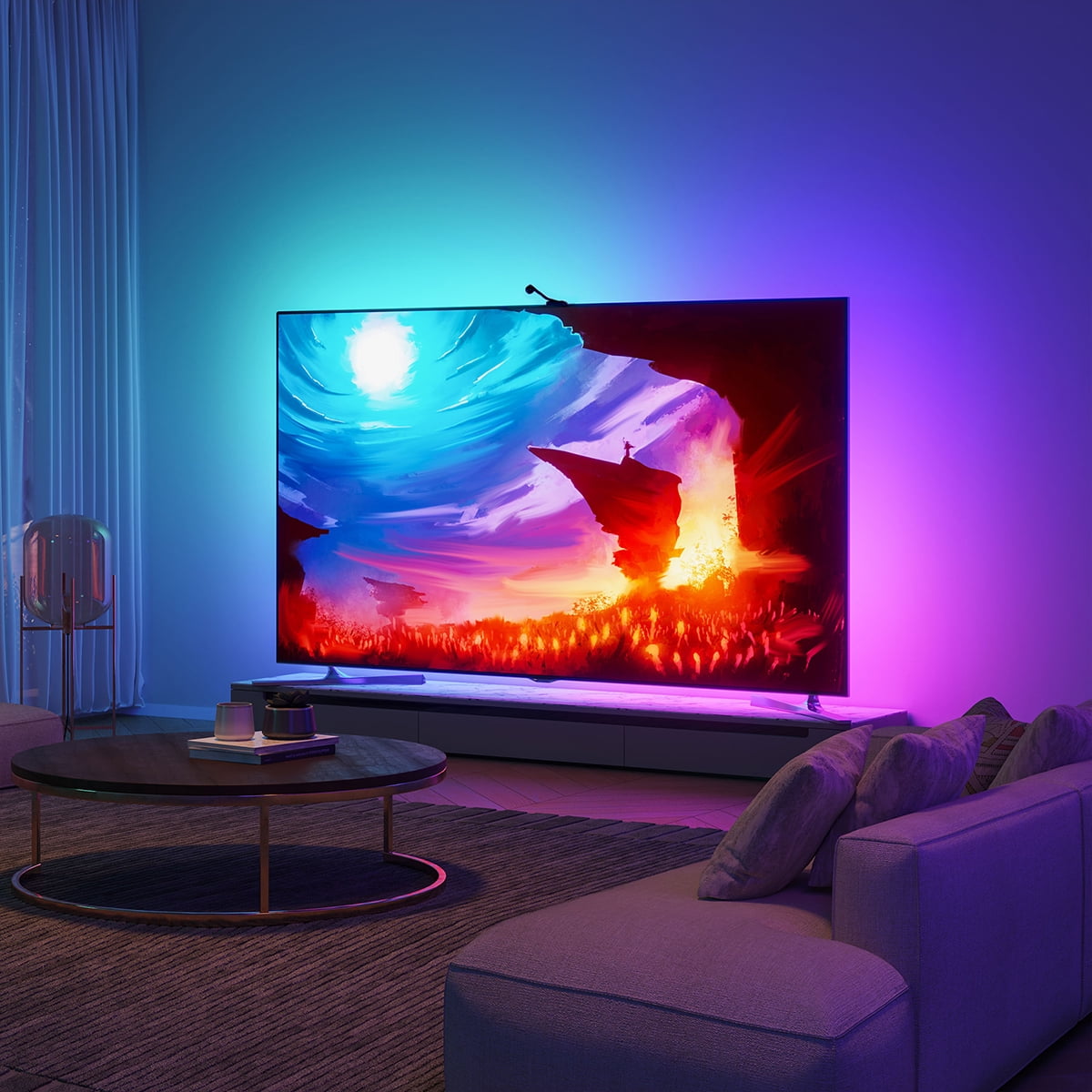 Enhance your home entertainment with the Govee Stranger Things Indoor RGBIC LED TV Backlight. This 12.5-foot backlight features an intelligent camera that automatically captures the colors on your TV screen and applies them to the backlight, creating a truly immersive viewing experience. Control the lights with simple voice commands or the Govee Home app, and enjoy the dynamic music mode that syncs the backlight to your favorite tunes. With 99+ scene modes and 2 video modes, this backlight is perfect for gaming, movie nights, and festive celebrations, transforming your living space into a vibrant, personalized entertainment hub.