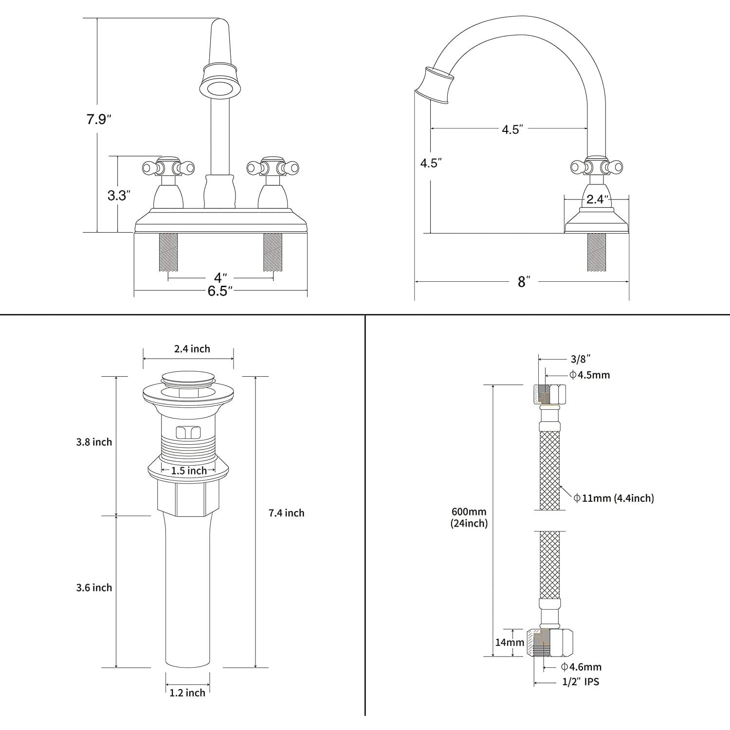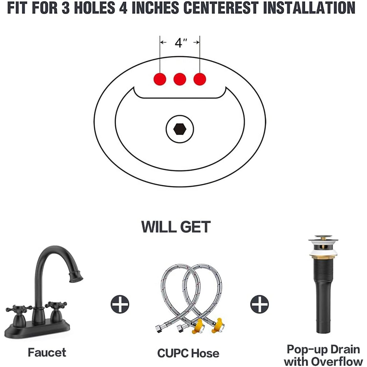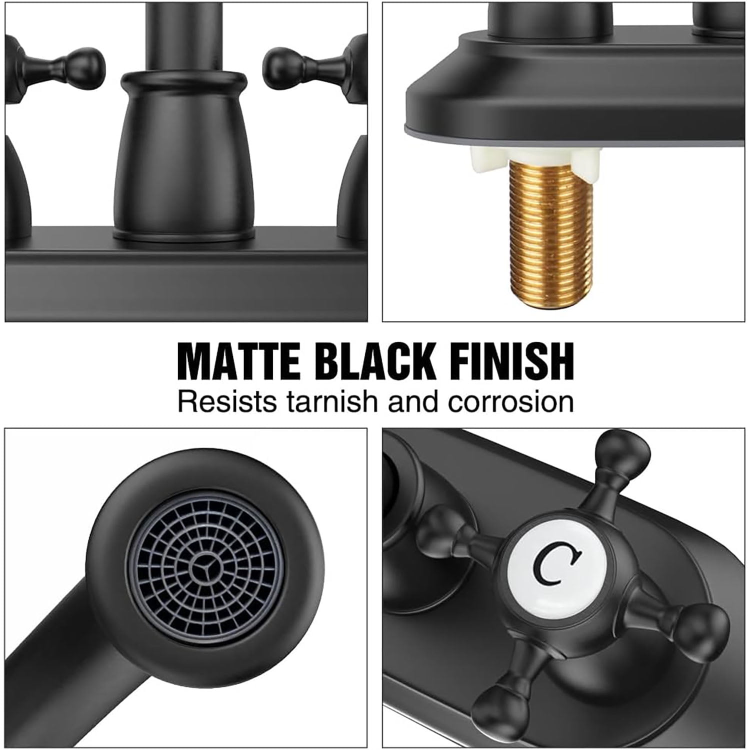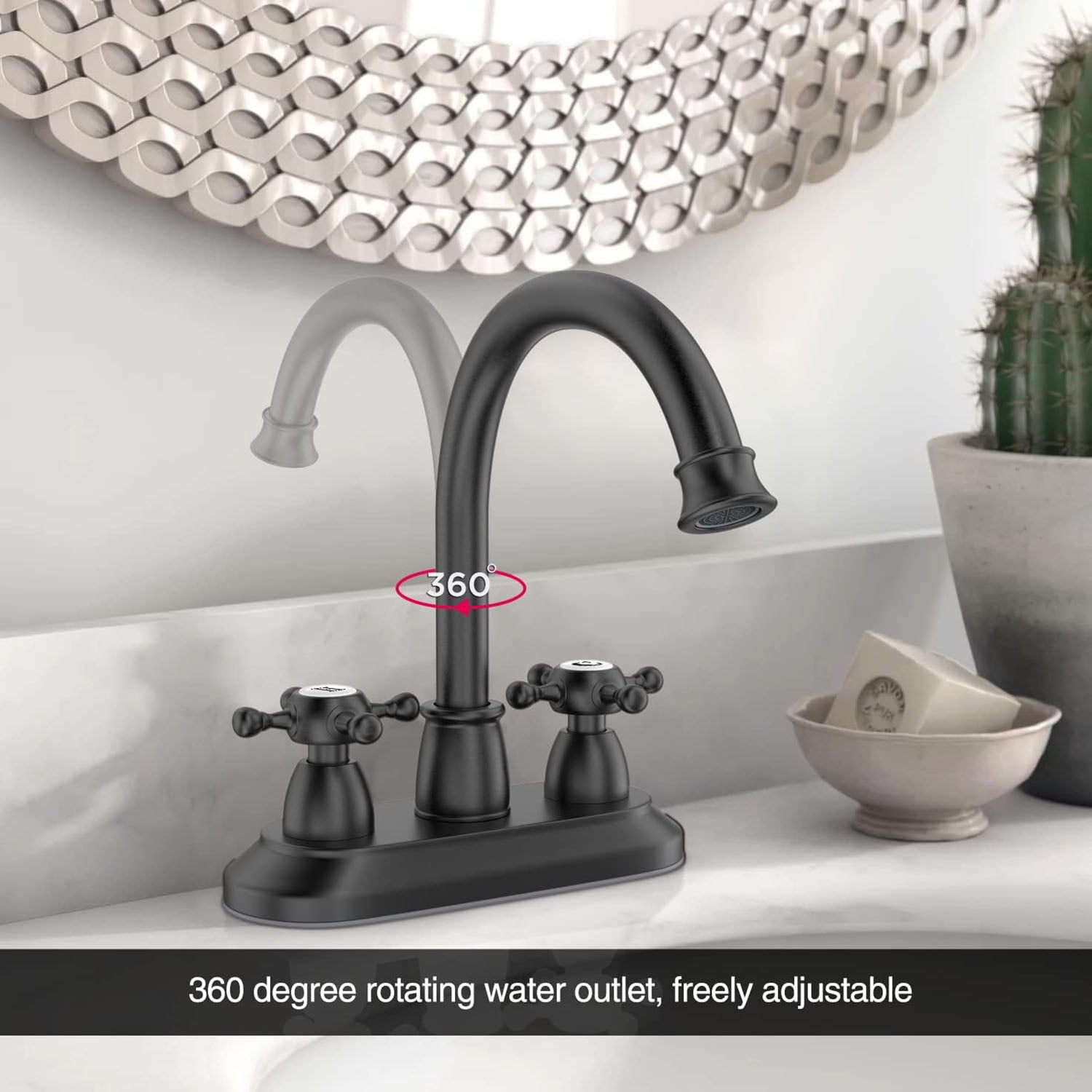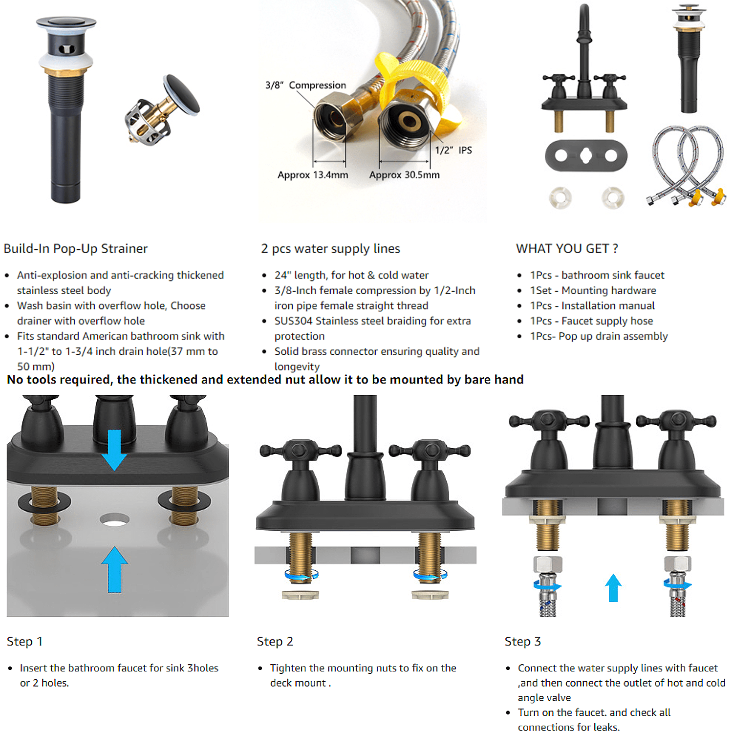 360 Degree High-Arc Swivel Spout: The spout can be moved and rotated 360 degrees, providing convenience for cleaning your sink and countertop Matte Black Finish: Multi-layer matte black finish resists fingerprints, daily scratches, corrosion, and tarnishing Detachable Aerator: Features a detachable bubbler for easy cleaning; high-performance aerator complies with strict water-saving standards while maintaining excellent performance Built-In Pop-Up Strainer: Anti-explosion and anti-cracking thickened stainless steel body; designed for wash basins with overflow holes Standard Fit: Fits standard American bathroom sinks with a drain hole size of 1-1/2″ to 1-3/4″ (37 mm to 50 mm) Water Supply Lines Included: Comes with two 24-inch water supply lines for hot and cold water; features 3/8-inch female compression by 1/2-inch iron pipe female straight thread Durable Construction: Made from SUS304 stainless steel with solid brass connectors for quality and longevity