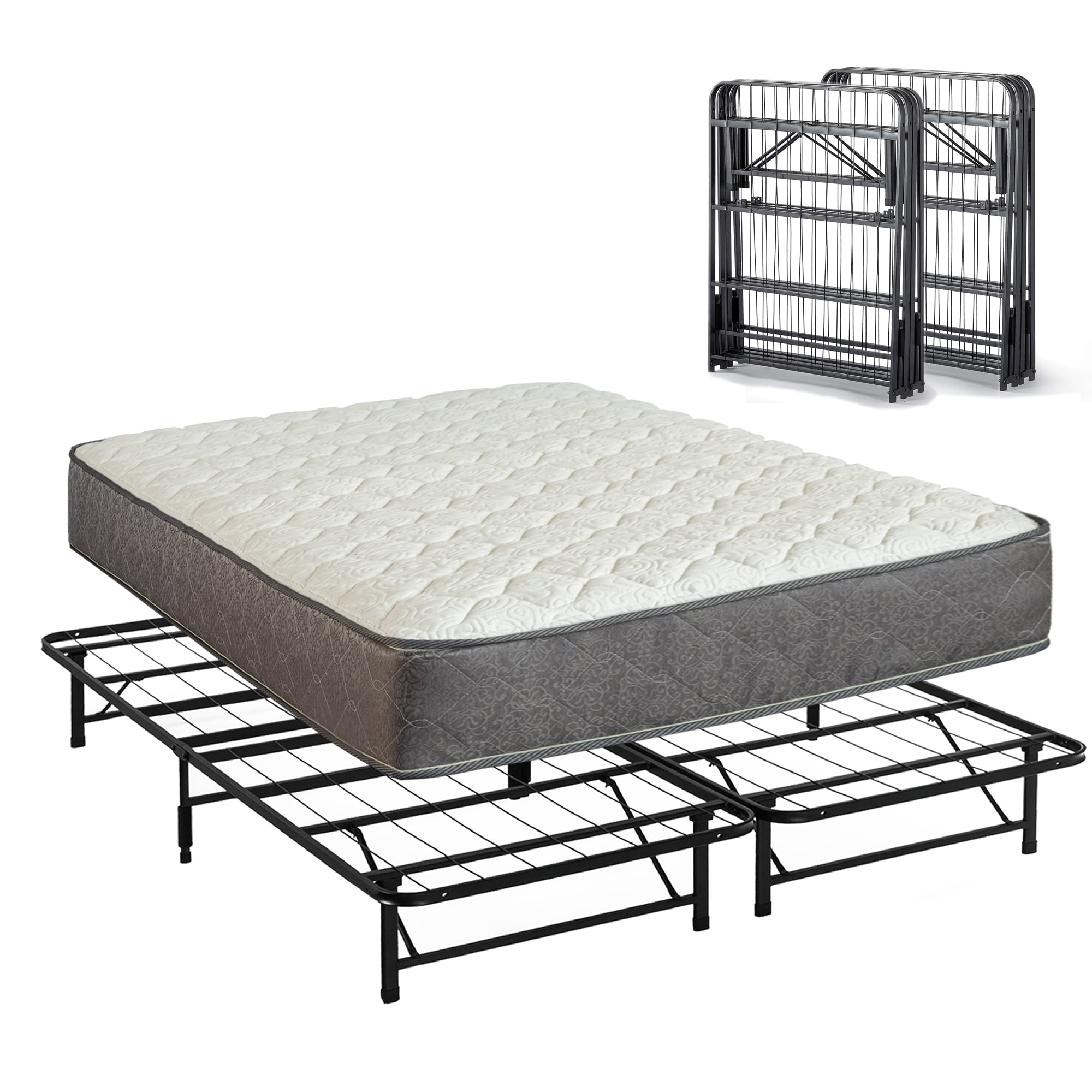 Medium Plush mattress with high-density foam comfort and pressure relieving support for a better night’s sleep Foam mattress has quilted cover for added comfort Compressed, rolled, and shipped in a box for simple setup; easily fits through narrow hallways and staircases. Item Dimensions – 30x60x10 (half queen size, 2 needs to be ordered to make a queen set) Shipping Dimensions – 30x10x13 Item includes the steel platform bed with 12 slats and required setup tools, simple and easy to use Provides extra under-the-bed storage space with a vertical clearance of about 13 inches