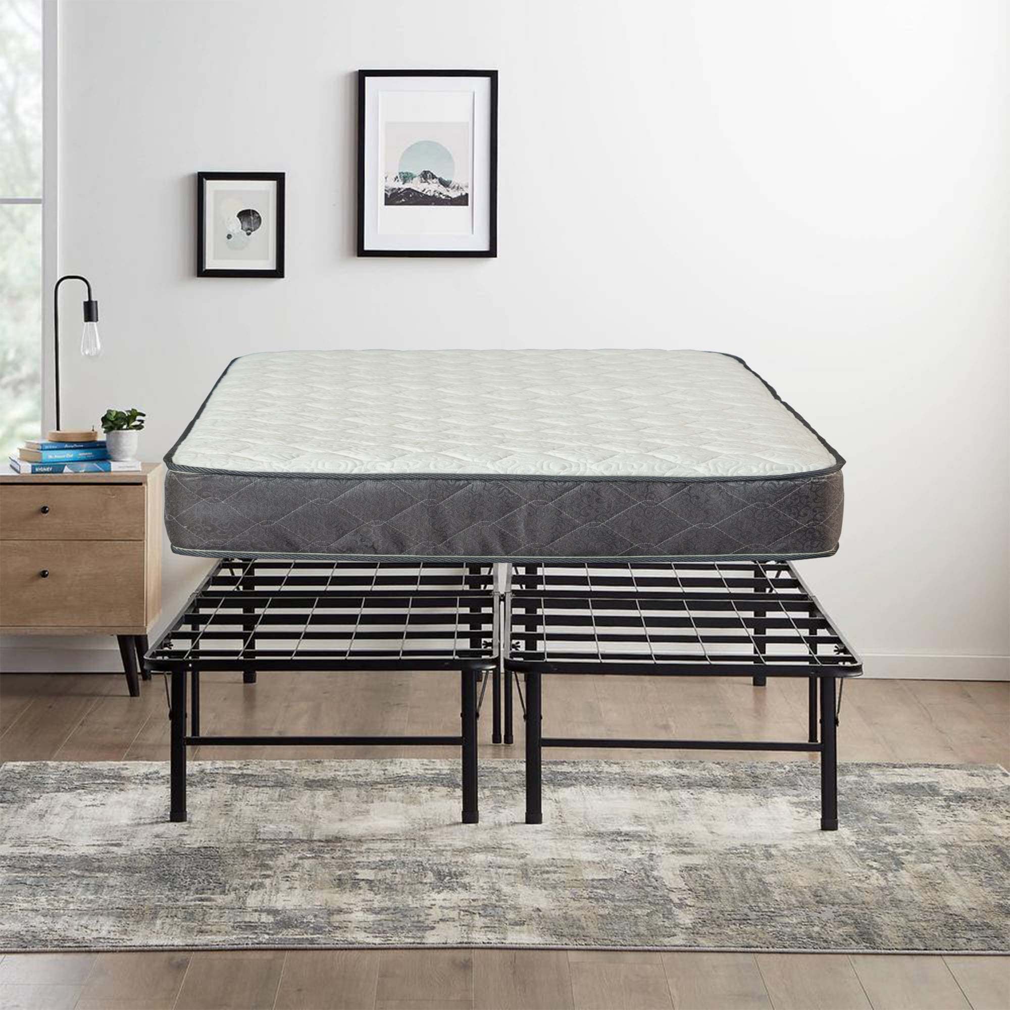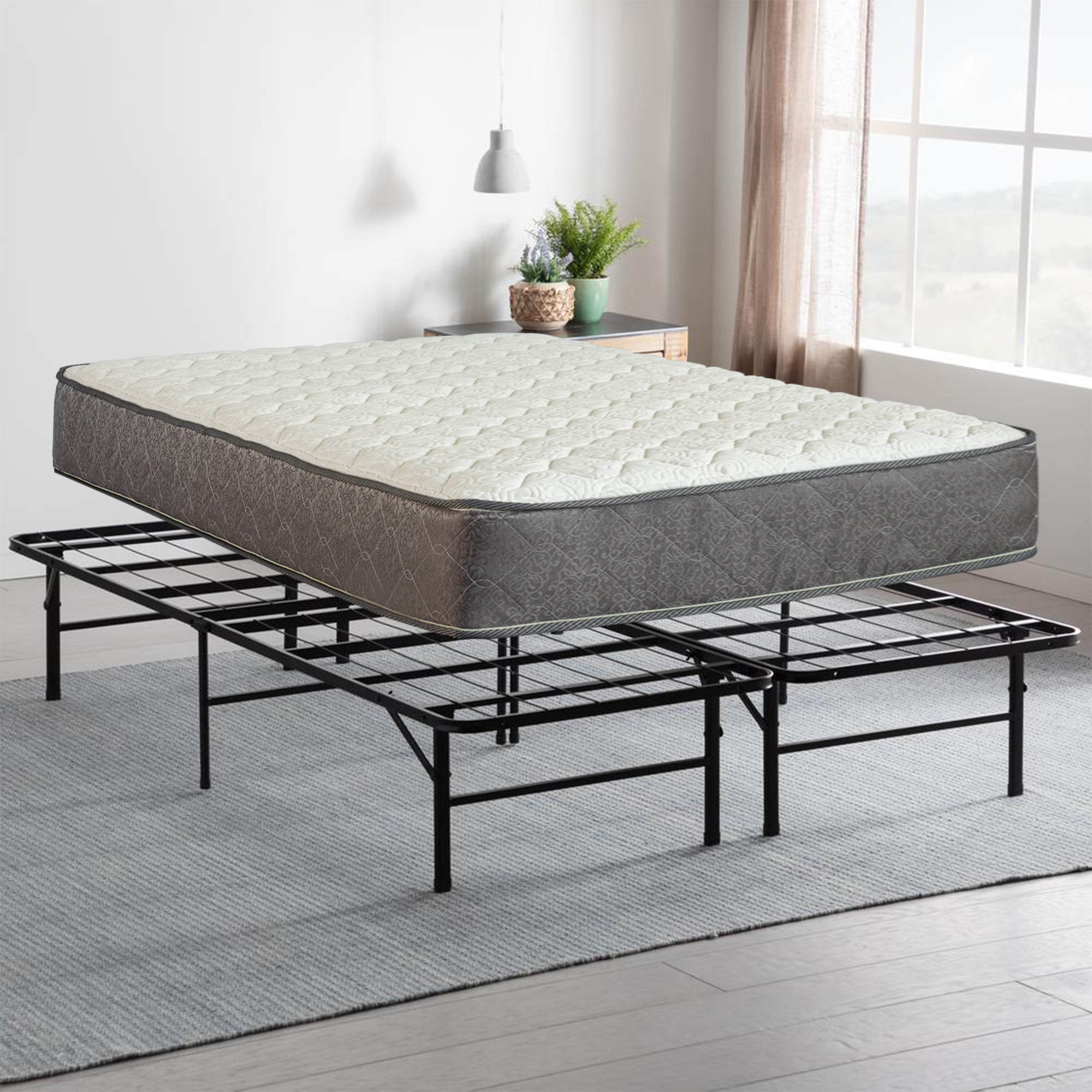 Medium Plush mattress with high-density foam comfort and pressure relieving support for a better night’s sleep. Foam mattress has quilted cover for added comfort. Compressed, rolled, and shipped in a box for simple setup; easily fits through narrow hallways and staircases. The steel platform bed with 12 slats and required setup tools, simple and easy to use. Convenient setup and compact enough to store away in almost any closet. Provides extra under-the-bed storage space with a vertical clearance of about 13 inches. Use it as an extra bed, guest bed, kid’s bed, day bed or lounger.