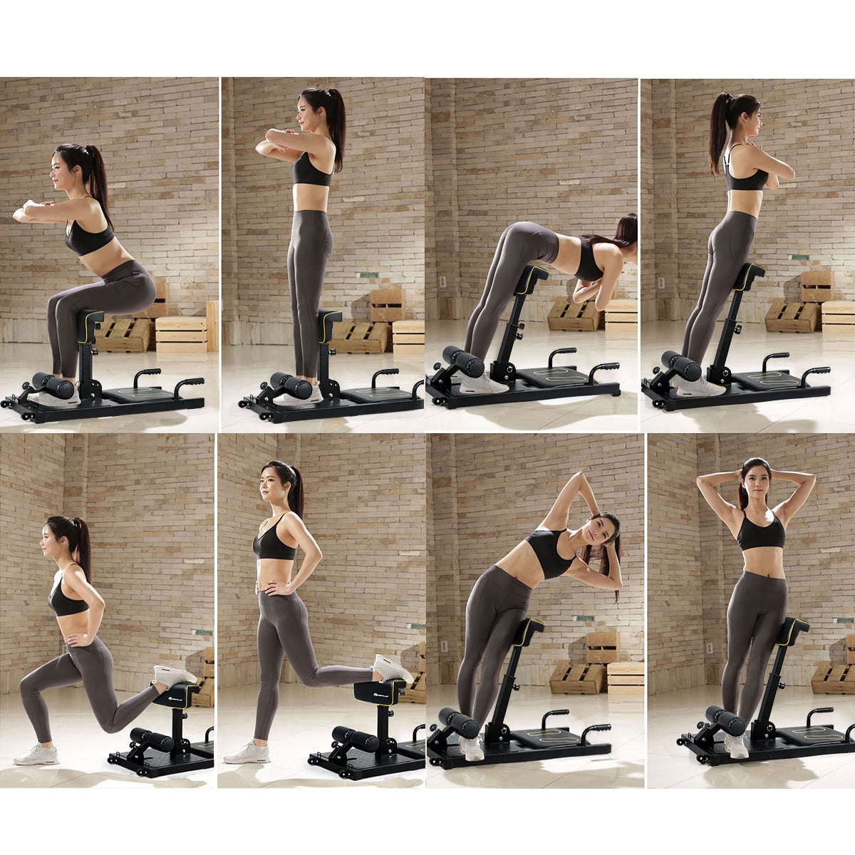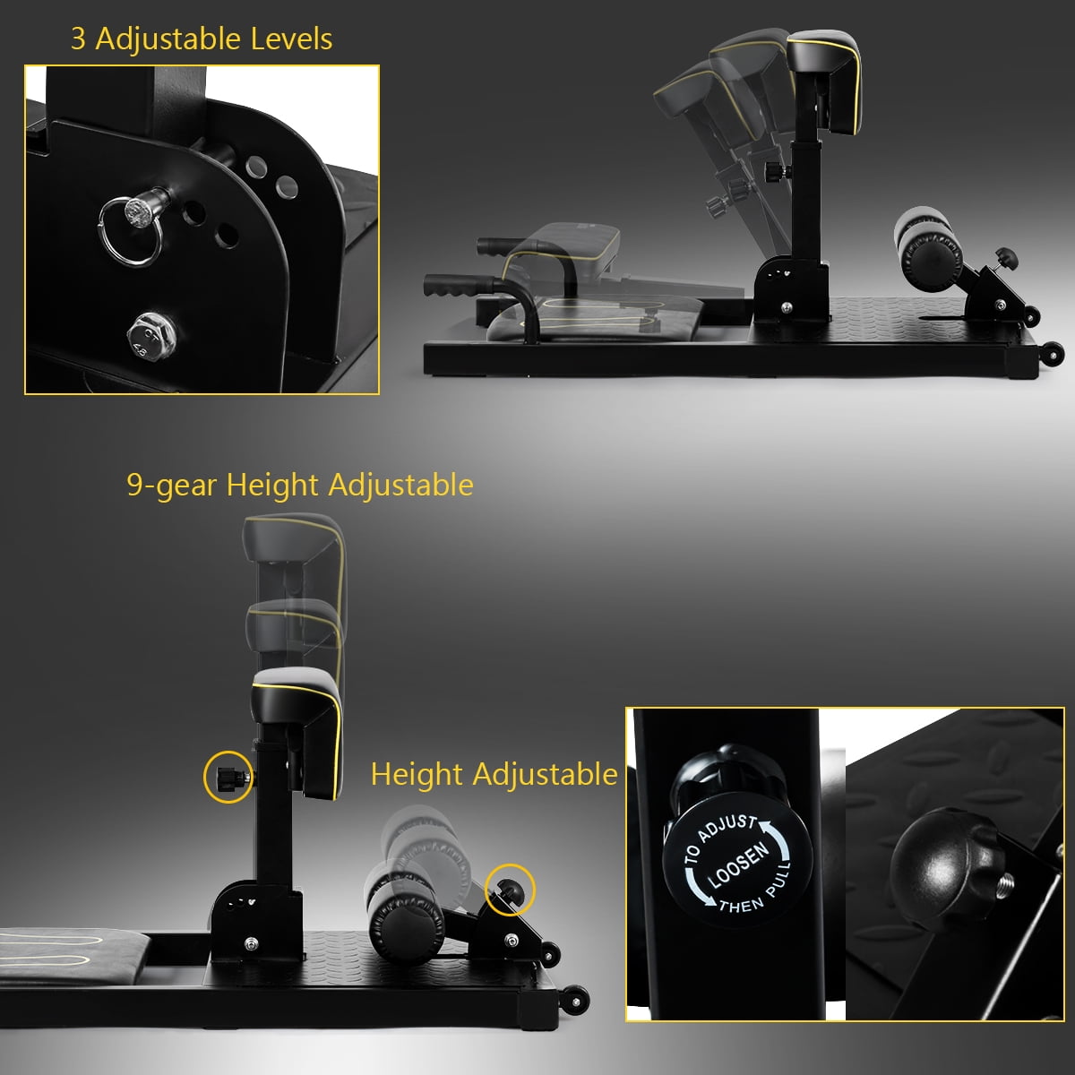 8-in-1 Multifunctional Squat Machine: This 8-in-1 sissy squat provides a core workout training to effectively exercise your abdomen and leg muscles. Squat mainly exercises your quadriceps and gluteus, while enhancing knees and hip joints. And you can fasten the tension rope to the hooks to exercise your arms. sturdy Steel Construction with Large Load Capacity: Made of sturdy and thickened iron pipes, this squat with 220 lbs load-bearing is extremely sturdy and will not deform easily. With the bottom designed into T-shape to touch the ground, the squat will not turn over while you doing weight-bearing exercises. Anti-Skid Foot Pads &Handle : There are 4 enlarged foot pads at the bottom to increase friction as well as protecting the floor. And the non-slip handles together with the front pedal will effectively prevent slip during push-ups squats, sit-ups, twists and flat supports. 9 Levels Height Adjustable up to 12”: Both of the cylinders and mat can be adjusted into several heights using the knobs to satisfy the needs of people with different heights. Covered with premium PVC+PU cover, the ergonomic leg cushion will support your legs softly to improve the comfort of sports. Wheels for Easy Transportation: Two wheels in the front of the Squat Machine will facilitate your movement, and even girls can move it easily without much effort. And you can adjust the height into a compact size for storage.