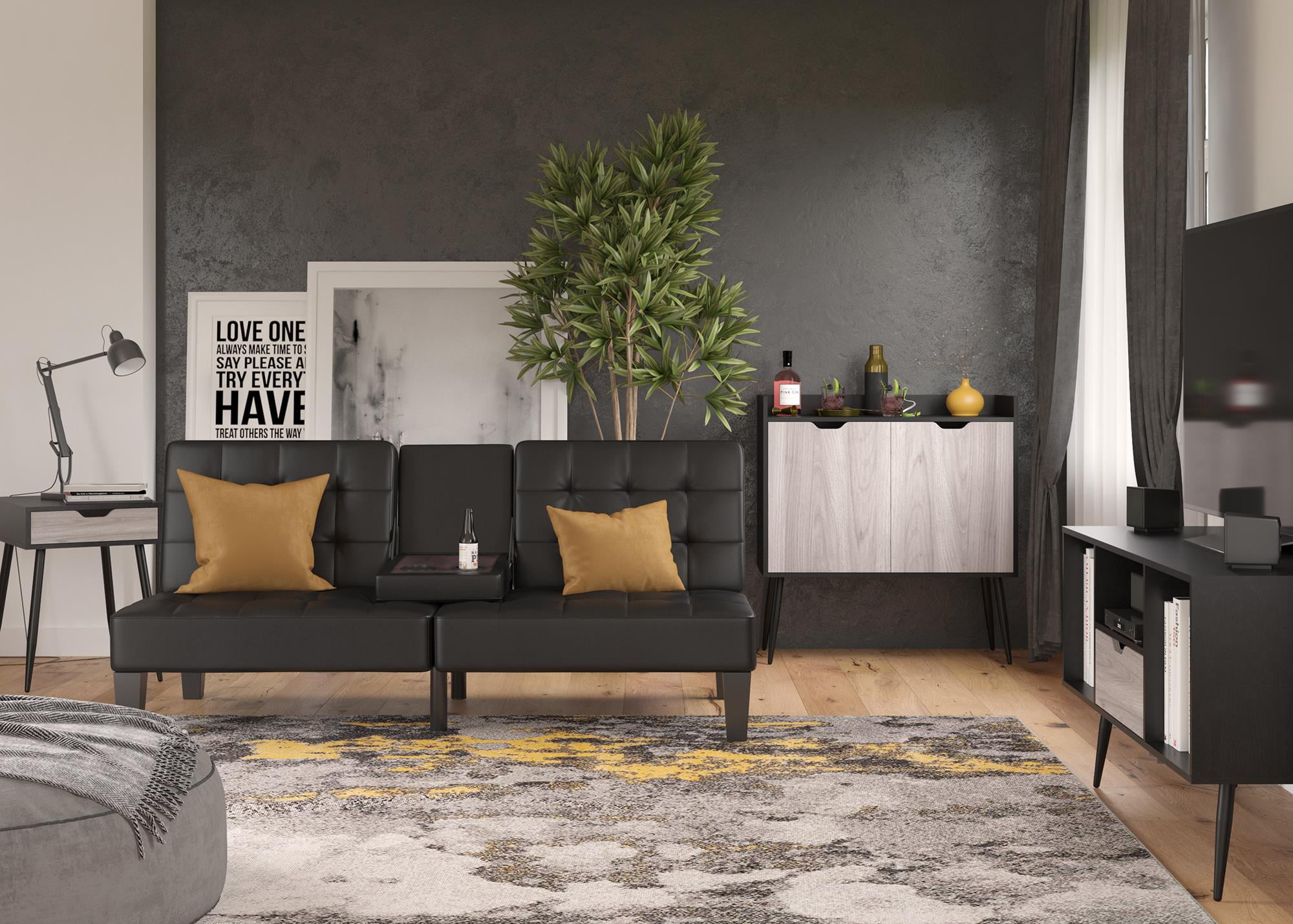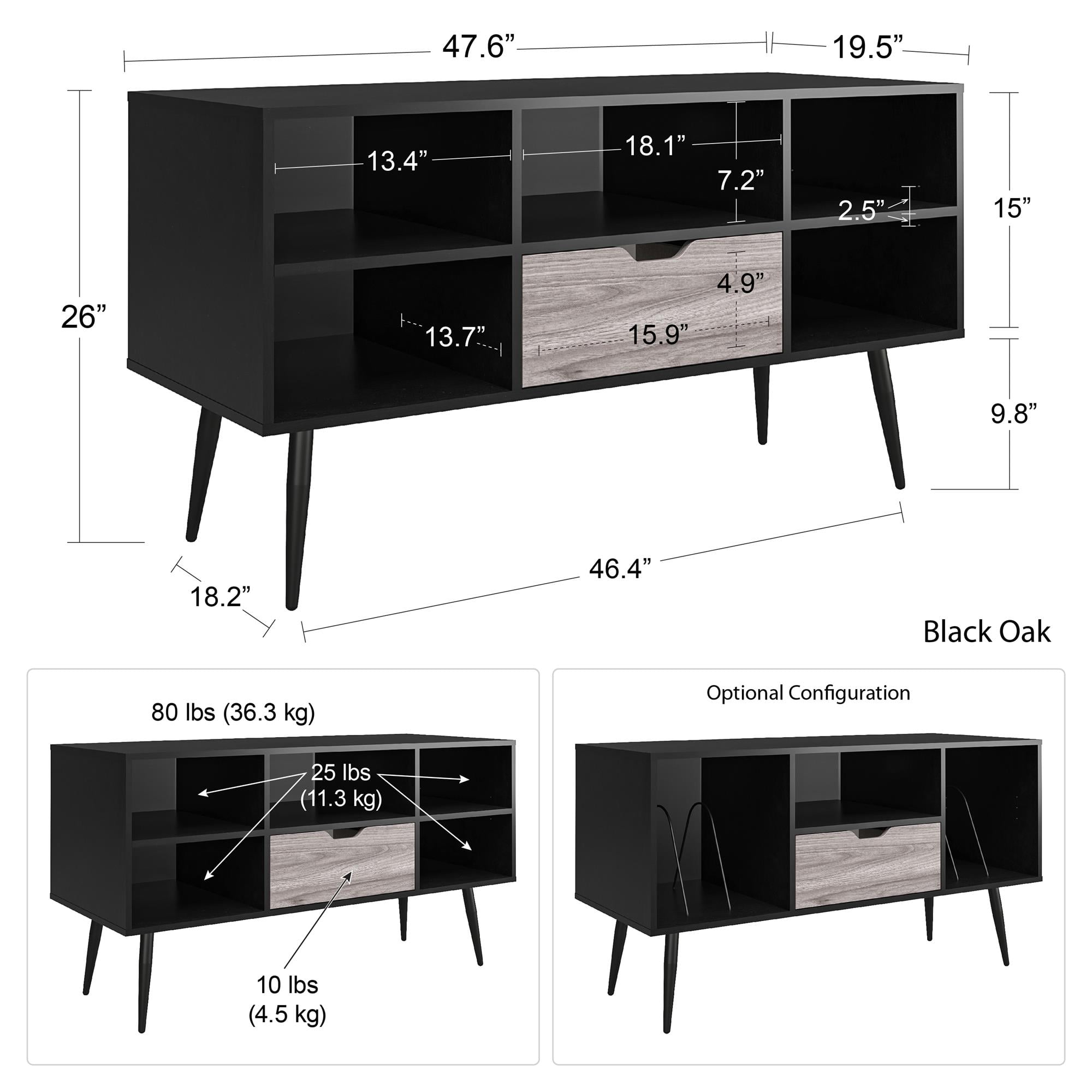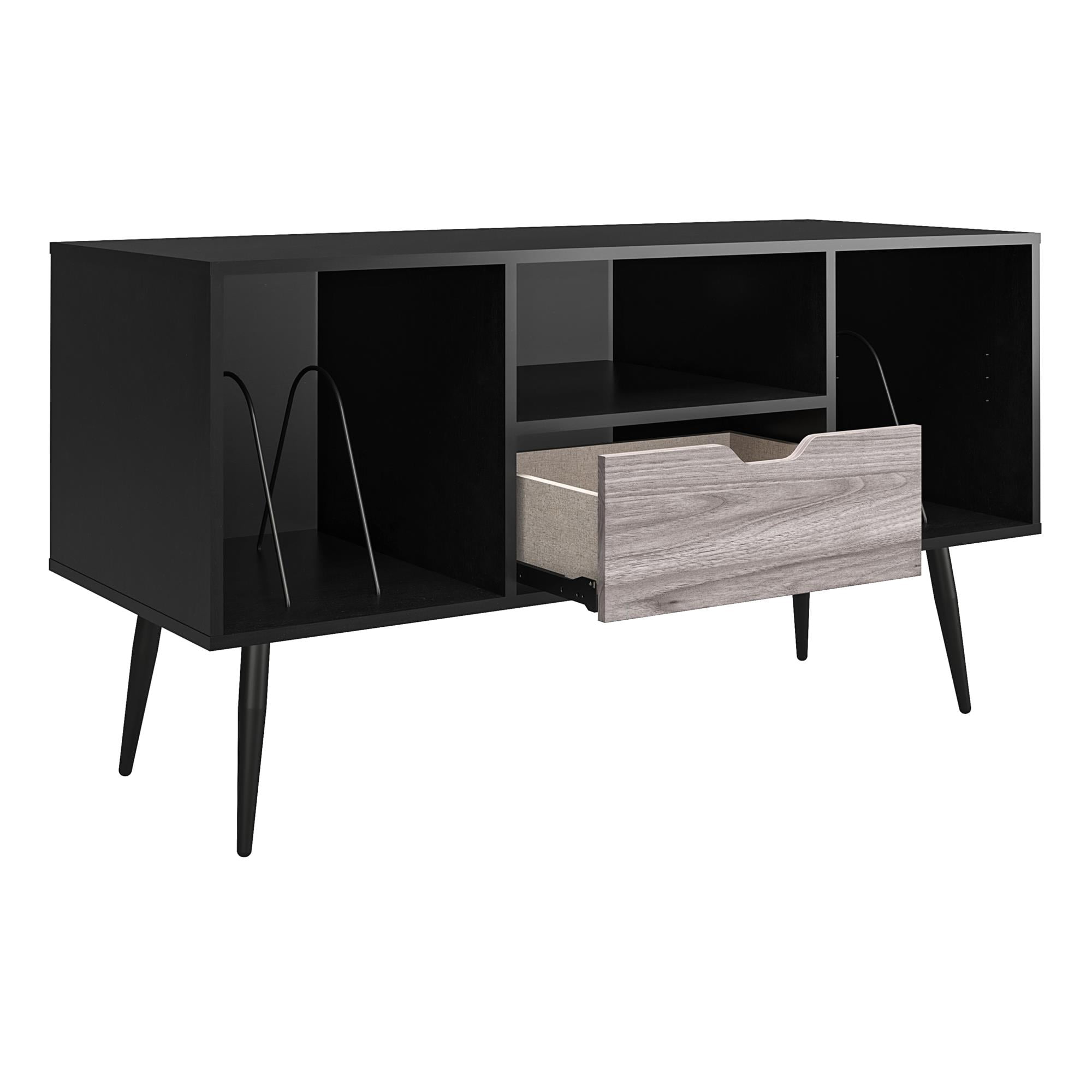 Get ready for family movie night or an intense game day viewing with the Ameriwood Home Grafton TV Stand. This multi-functional TV stand can hold most TVs up to 55″ wide or up to 80 lbs., but can also be used as a turntable stand for those who like retro vibes. This mid-century modern styled TV stand will give your living space an upscale look with the dark and light contrasting woodgrain finishes. Get all the organization you could ask for for your electronic equipment and records with both open and closed storage options. No more messy cords either! The wire management holes in the back panels keeps your receiver and gaming console cords out of sight. The laminated MDF and particleboard construction gives you a sturdy TV Stand you can count on for years to come. The TV stand ships flat to your door and 2 adults are recommended to assemble. The TV stand can support up to 80 lbs. Each shelf can hold up to 25 lbs. while the drawer can hold 10 lbs. Assembled dimensions: 25.98″H x 47.6″W x 19.48″D.