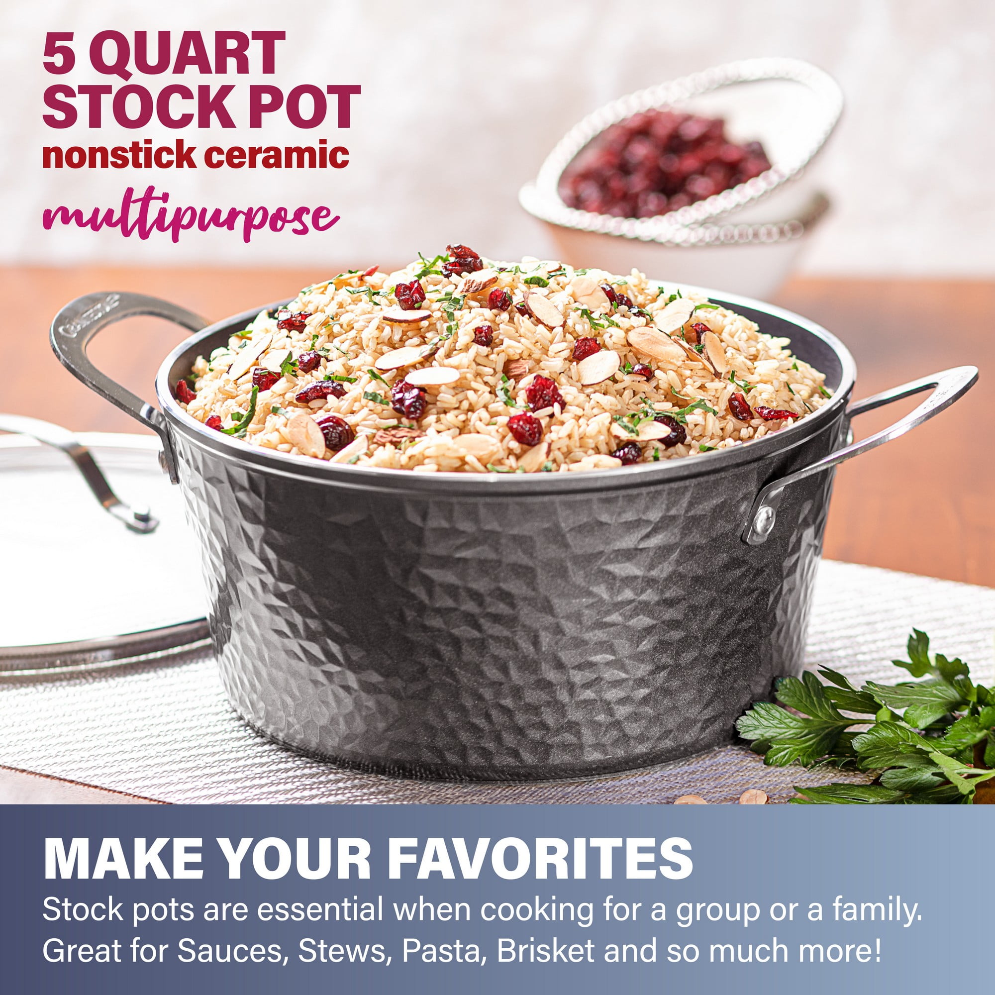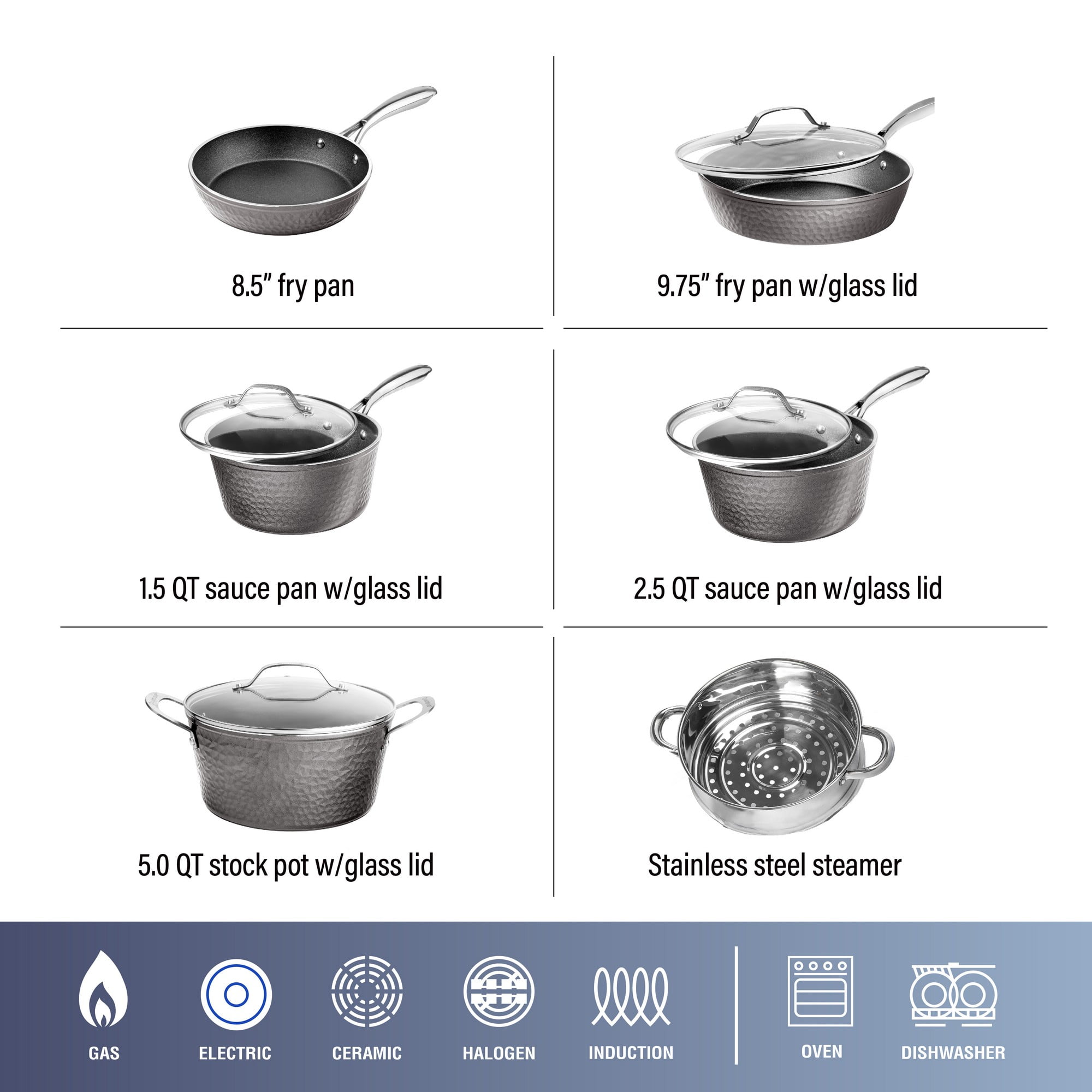 Even Heat Distribution: The Granite Stone hammered collection is pressed from a single piece of aluminum, ensures even heating all around with no soft areas or hotspots Cook With Confidence: Lightweight design makes for a comfortable cooking experience Oven Safe: Up to 500 degrees Fahrenheit, the pots, and pans are suitable for all stovetops, including induction Dishwasher Safe: Just pop in the dishwasher after use for an effortless cleanup