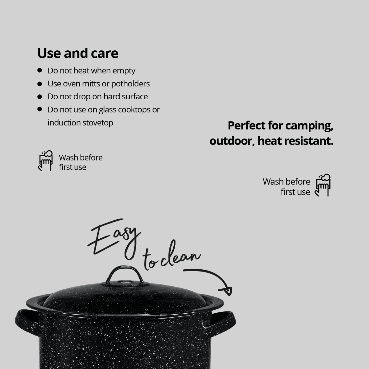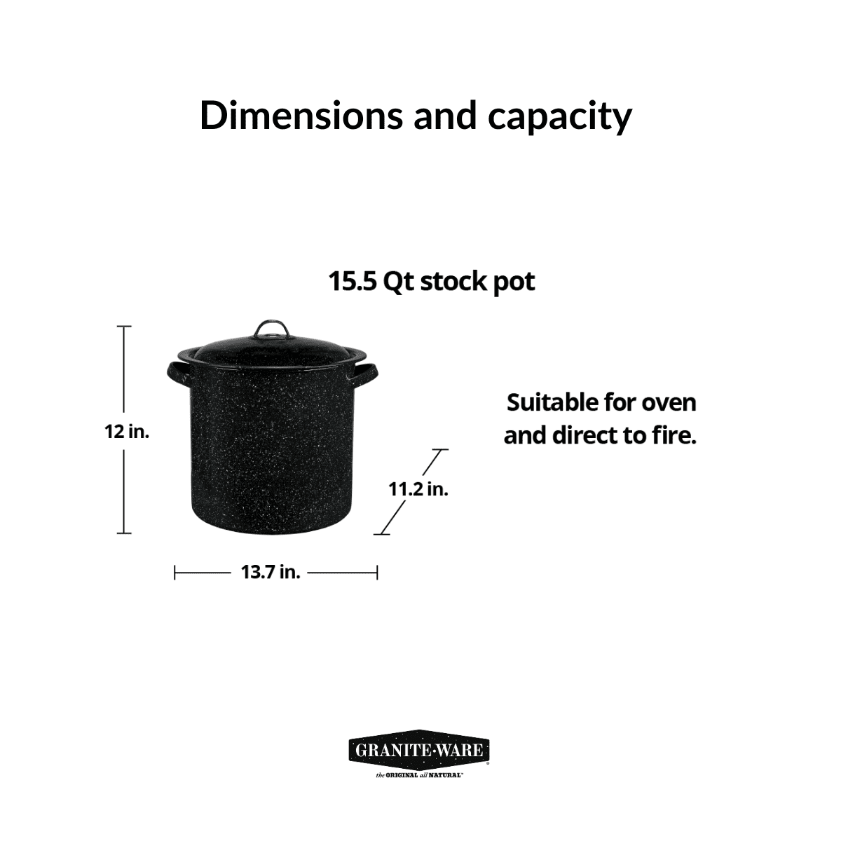 Granite Ware 15.5-qt Stock Pot with Lid features a carbon steel core for strength. It has porcelain fused to the steel, producing a non-porous, inert glass surface, it is naturally nonstick and distributes heat evenly for convenient, easy cooking. Its innovative construction adds no chemicals to the food, so it preserves the natural taste, color and nutritional value. This Granite Wear pot is handy for soups, stews and much more so you are able to make enough to feed a large group or make extra to stock your freezer. Continue a tradition passed down through the generations with Granite Ware 15.5qt Stock pot.