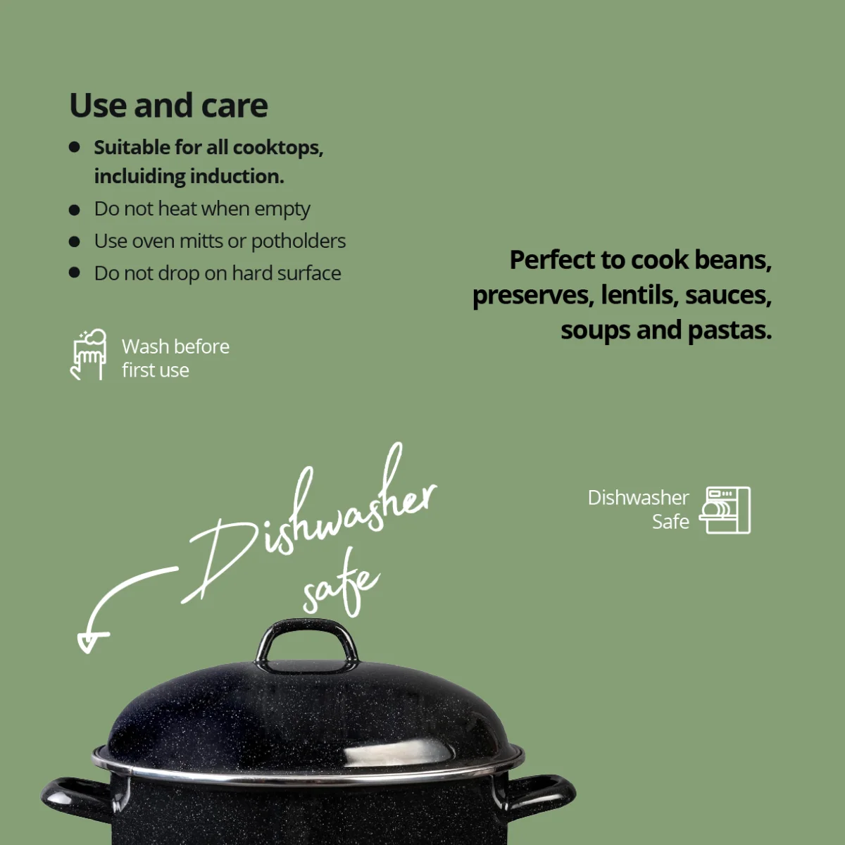 Heavy gauge enamel-on-steel stock pot with lid No PFOA, PTFE or other harmful chemicals Suitable for all cooktops, Oven to Table Scratch resistant, Easy to Clean & Dishwasher Safe Porcelain surface is naturally nonstick and won’t alter the taste, texture, or color of food It must not be heated when empty nor dropped on hard surfaces as it may chip Product dimensions 11.8 in L 14.6 in W 14.2 in H (see image #3)
