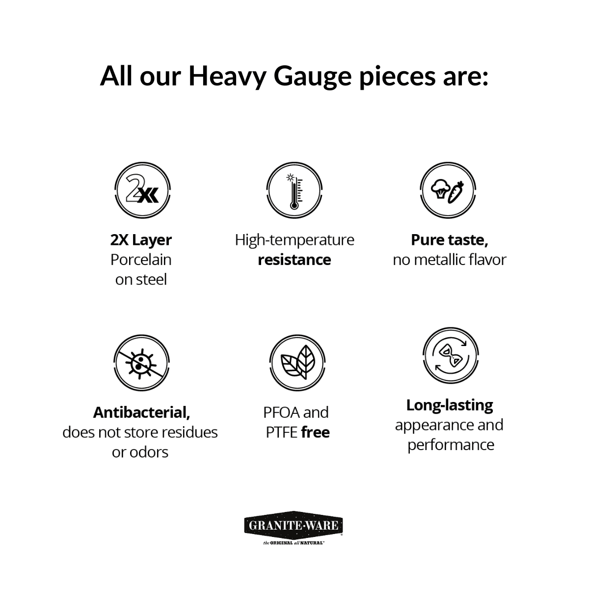 Our new GraniteWare Heavy Gauge Stock Pot is perfect for cooking on friends and family gatherings, it has +2x porcelain layers that makes it resistant to metal utensils and scratches caused by washing fibers. It heats 9x times faster than stainless steel and can resist temperatures up to 932 °F. This Stock Pot has a capacity of 15 QT and can be used from oven to table, making your cooking time more practical. The Granite Ware 15 qt Heavy Gauge Stock Pot with Lid is made for durability, and the design allows it to spread the heat from your stove for thorough cooking all the way to the center of the dish so you don’t get cold spots.