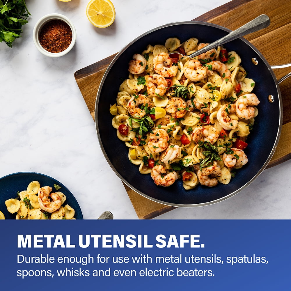 GRANITESTONE BLUE: introducing the Granitestone Blue Collection – this cookware line pairs our award-winning nonstick coating with the stunning new classic blue design, upgraded with professional handles & infused with diamonds for years of long-lasting use. ULTRA NON STICK : the Granite Stone Blue nonstick cooking surface is coated 3x, reinforced with diamonds to deliver the ultimate food release. No oil or butter needed, makes for healthier eating, and provides for hassle free, 1-2-3 cleanup. SUPER DURABLE: the coating of the pan is infused with diamonds, the strongest material on earth which makes it durable enough to withstand metal utensils, spatulas, spoons, whisks and even electric beaters while delivering years of outstanding, nonstick use EFFORTLESS CLEANUP: spend less time with cleanup! After all the cooking and prepping is done, place cookware in the dishwasher for quick and easy cleanup. STOVETOP & OVEN SAFE: compatible with gas, electric, glass cooktops & oven safe up to a sizzling up to 500° Fahrenheit, lids included! STAY COOL HANDLES : the stainless-steel handles are ergonomically designed for both righty and lefties & the unique Y shaped handles let’s heat escape and keeps the handles cool to the touch GRANITESTONE BLUE: introducing the Granite Stone Classic Blue Collection – this cookware line pairs our award-winning nonstick coating with the stunning new classic blue design, upgraded with professional handles & infused with diamonds for years of long-lasting use