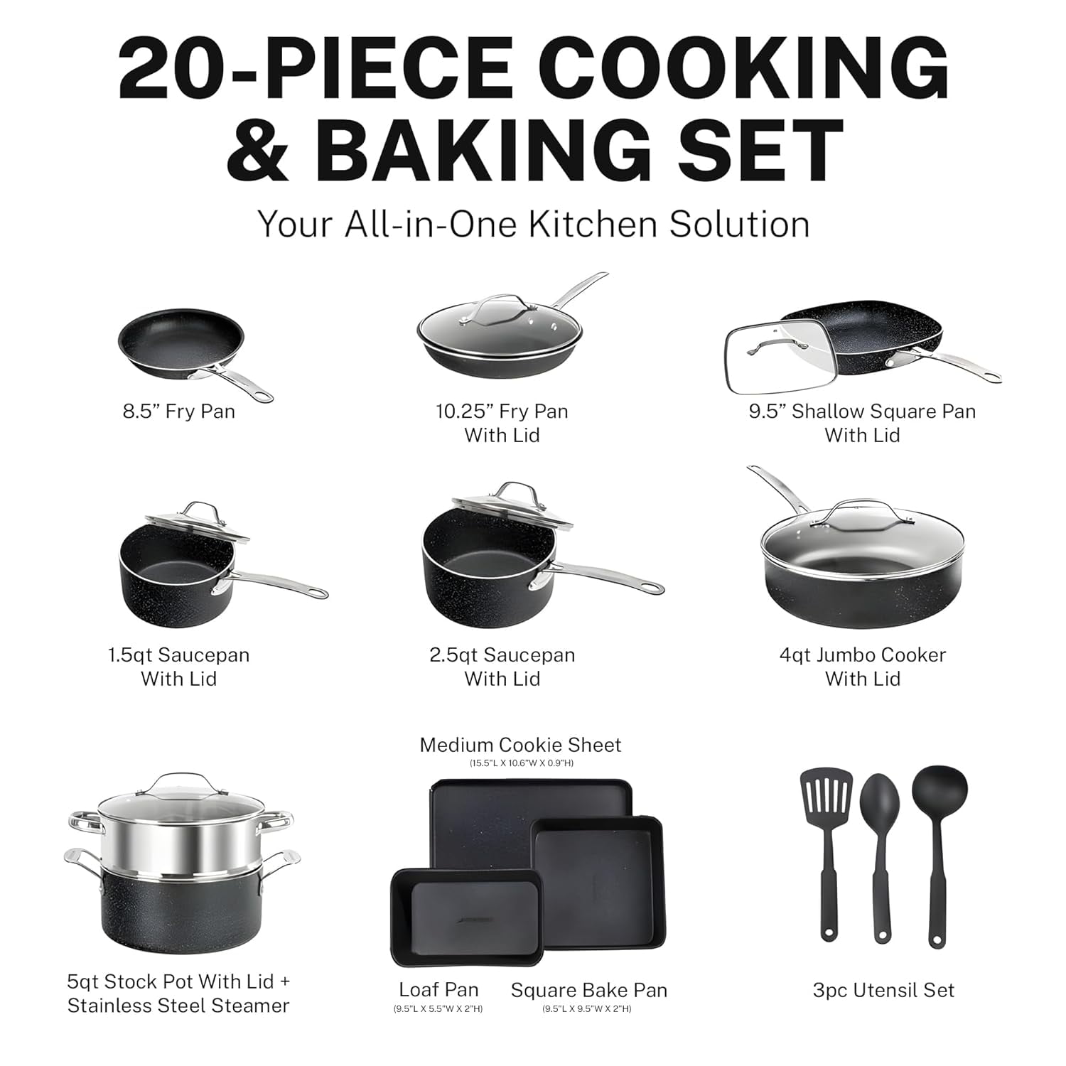 Granitestone 20 Pc Complete Pots and Pans Set Non Stick, Pot and Pan Set Cookware Set with Deep Frying Pan and Bakeware, Non Stick Pots and Pan Set with Utensils, Oven/Dishwasher Safe, Black