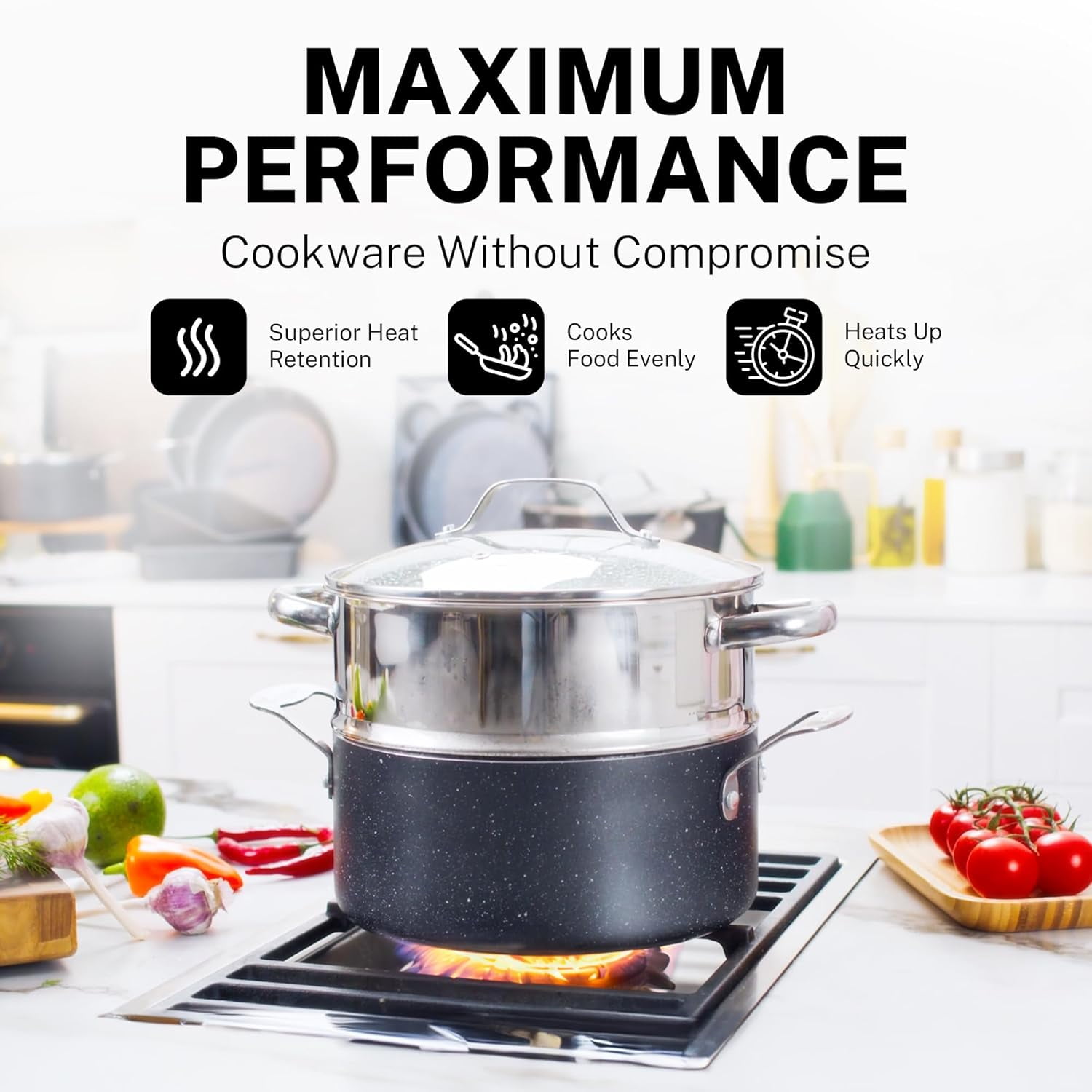 The cooking surface is triple-coated and reinforced with diamonds, enhancing food release and cleanup without the need for added fats or oils. The diamond-infused coating is designed to withstand the use of metal utensils, offering years of excellent nonstick performance. Dishwasher safe to make cleaning after meals quick and simple. Suitable for gas, electric, and glass stovetops, and oven safe up to 500�F, making it ideal for a wide range of cooking methods. The ergonomically designed handles are made for comfort and safety, staying cool during cooking and suitable for both right and left-handed users. Adds a touch of sophistication to your kitchen, blending seamlessly with any decor style.