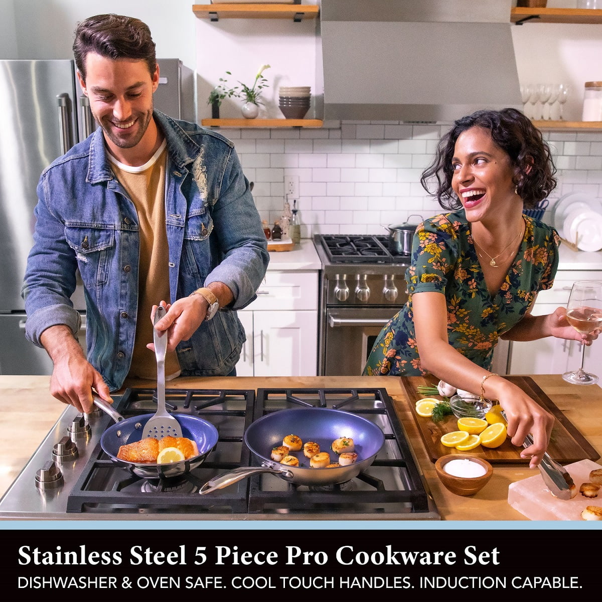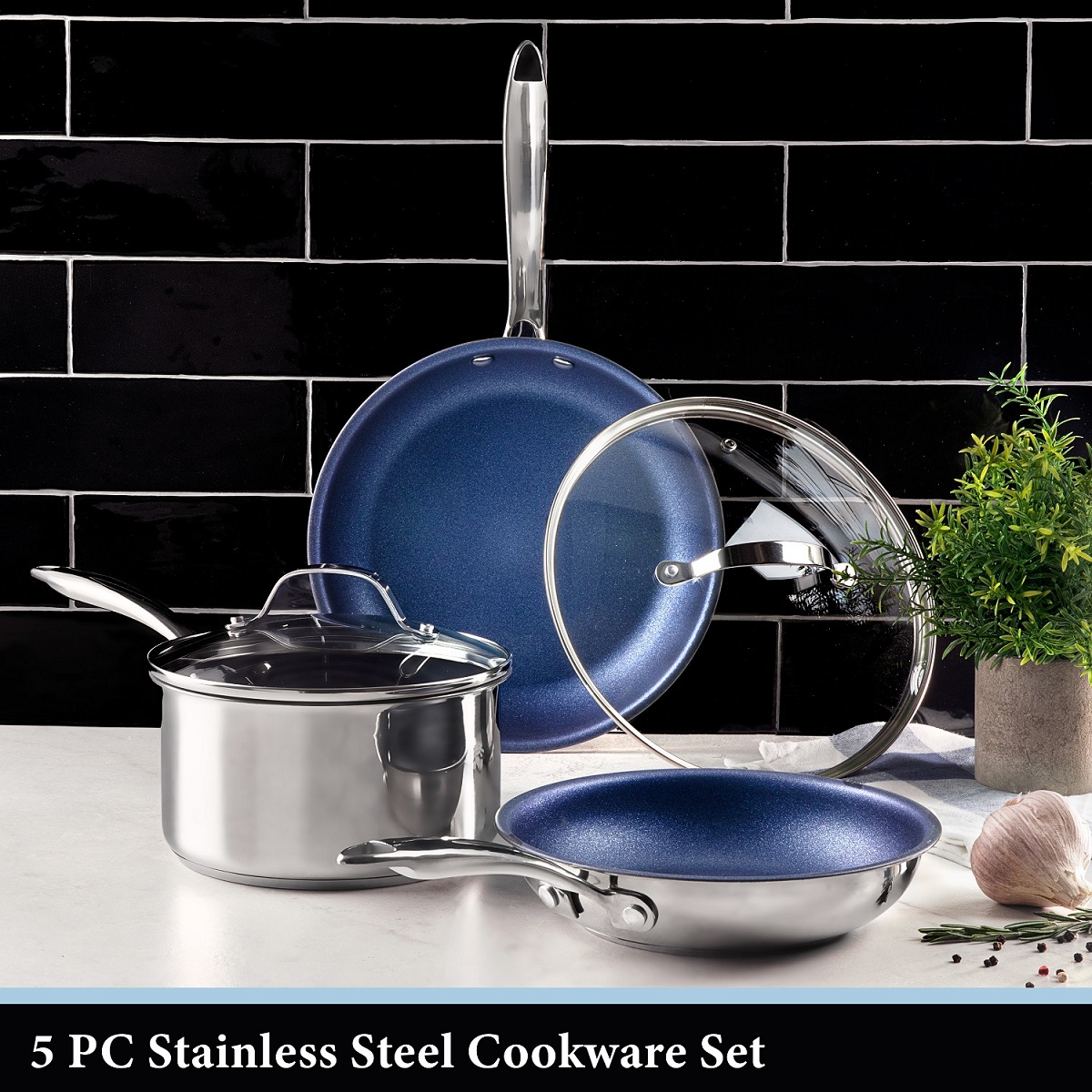 Granitestone Blue Nonstick Cookware Set, Tri-Ply Base, Stainless Steel Pots & Pans Set, 5 Piece Cookware, Includes, Frying Pans, Stock Pots & Skillets, Dishwasher & Induction Safe, Stay Cool Handles
