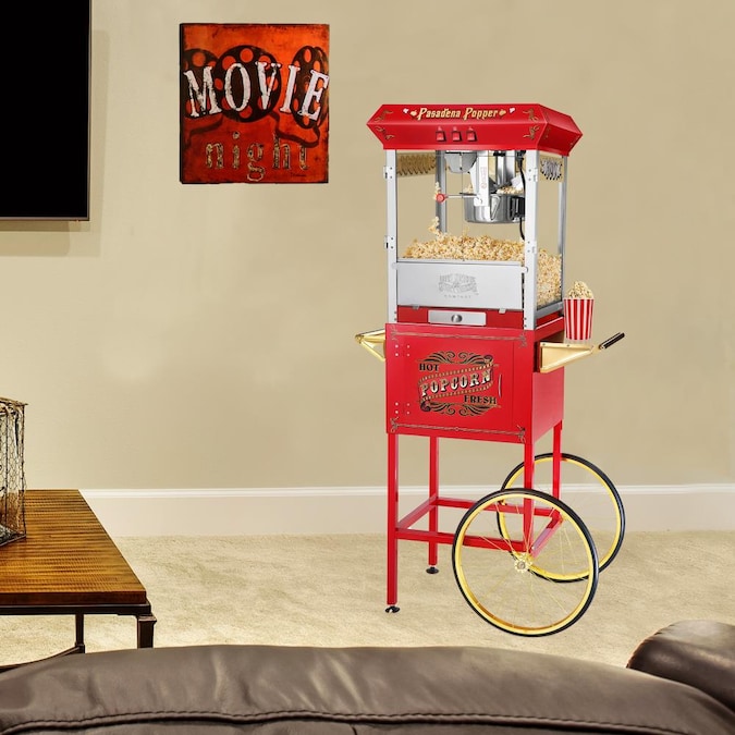 Bring the flavor and the fun of the movie theater experience to your own home with the Pasadena Popper Popcorn Machine 8 oz Popper with Cart by Great Northern Popcorn. This large but portable pop corn machine comes with a detachable two-wheeled cart and features a party-ready output, producing up to 3 gallons (48 cups) per batch in minutes — but don’t worry, it can also whip up smaller batches for a cozy movie night. The Pasadena Popper popcorn machine maker is the perfect popper for any family, and perfectly giftable, too, featuring a quality stainless-steel kettle with a built-in stirrer, tempered glass food zones for safety, and a nostalgic appearance that will look great whether you use it at parties or display the popcorn machine stand in your family room to accent other home theater accessories.