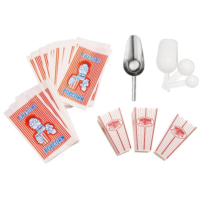 - Materials: Tempered Glass, Stainless-Steel, and Metal; Includes Measuring Cups, Scoop, 100 Popcorn Bags, and 3 Popcorn Buckets