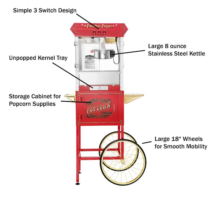 - Package Contents: Pasadena Popcorn Machine with Cart- Popper Makes 3 Gallons- 8-Ounce Kettle, Old Maids Drawer, Warming Tray and Scoop by Great Northern Popcorn (Red)