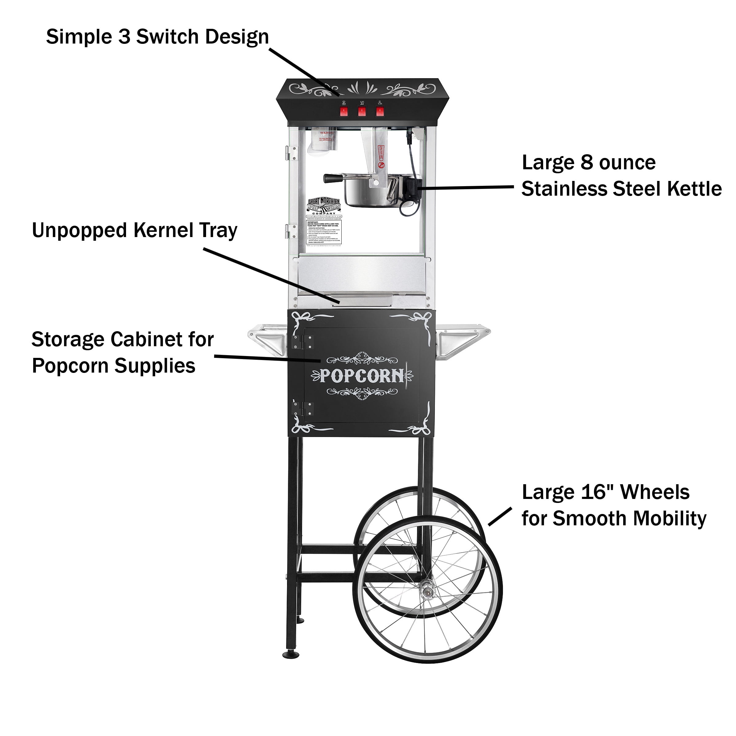 Great Northern Popcorn Black Foundation 8oz Full Popcorn Popper Machine with Cart, 8 Ounce