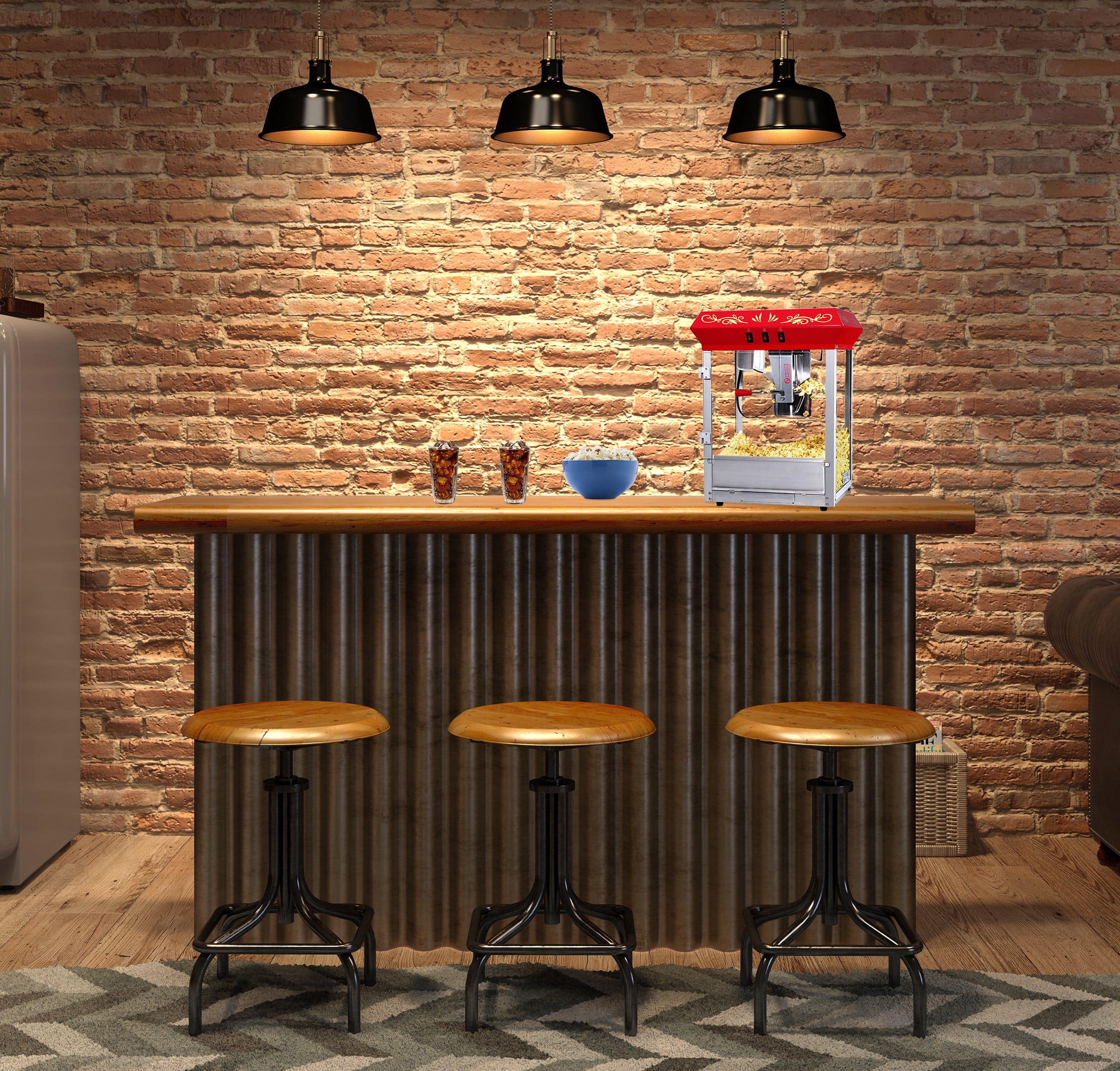 EASY TO USE – Three switches control the kettle, light, and warming deck separately for maximum control and ease of popping. FITS JUST ABOUT ANYWHERE – Compact footprint lets you use this popcorn maker on most countertops. VINTAGE STYLING – Charming nostalgic styling brings a sense of retro fun to your event. WEIGHT: 28 pounds MATERIALS – Metal, Stainless Steel and Tempered Glass food zones DIMENSIONS – (L) 17.1” x (W) 14.1” x (H) 23.7”.